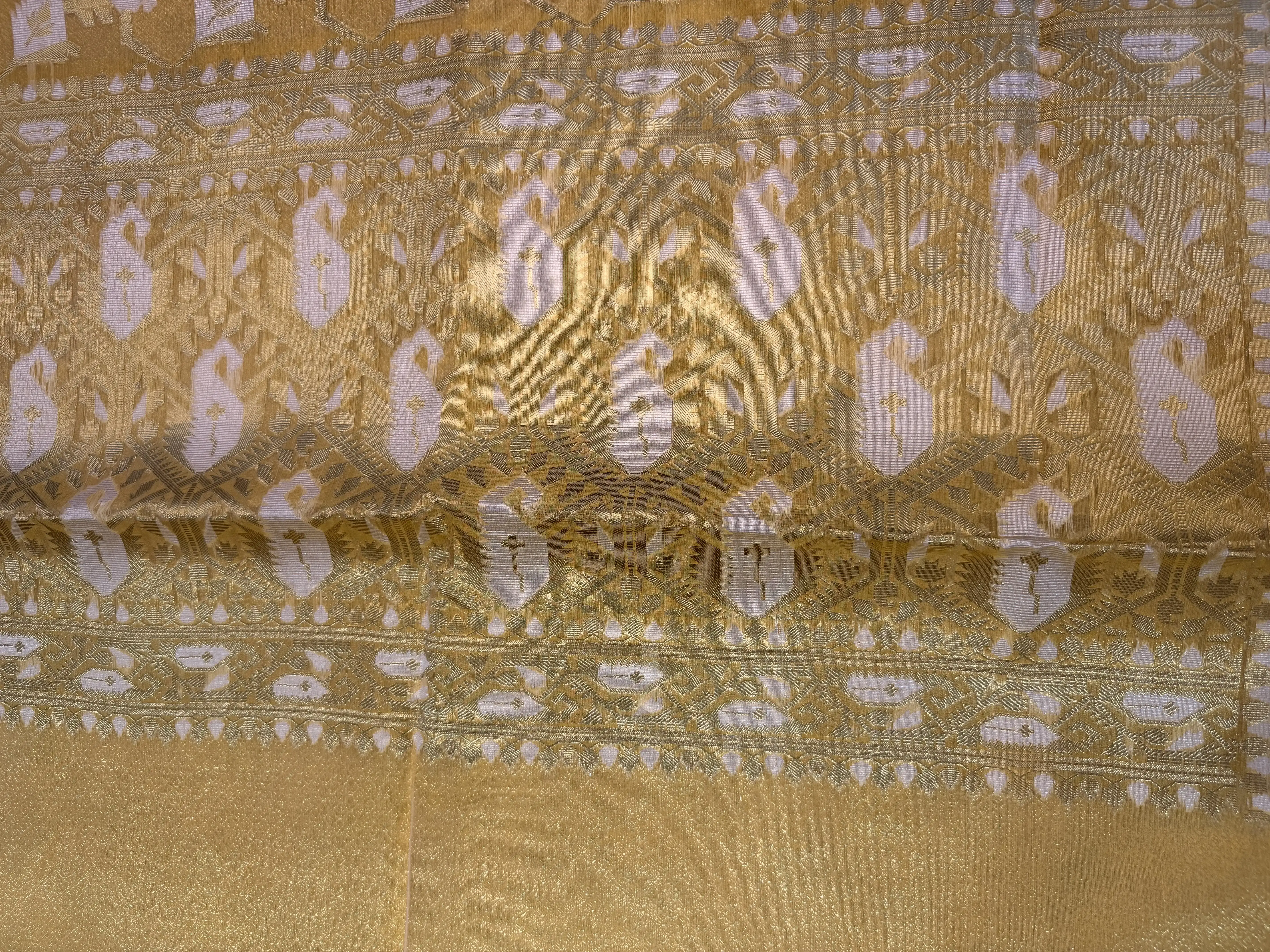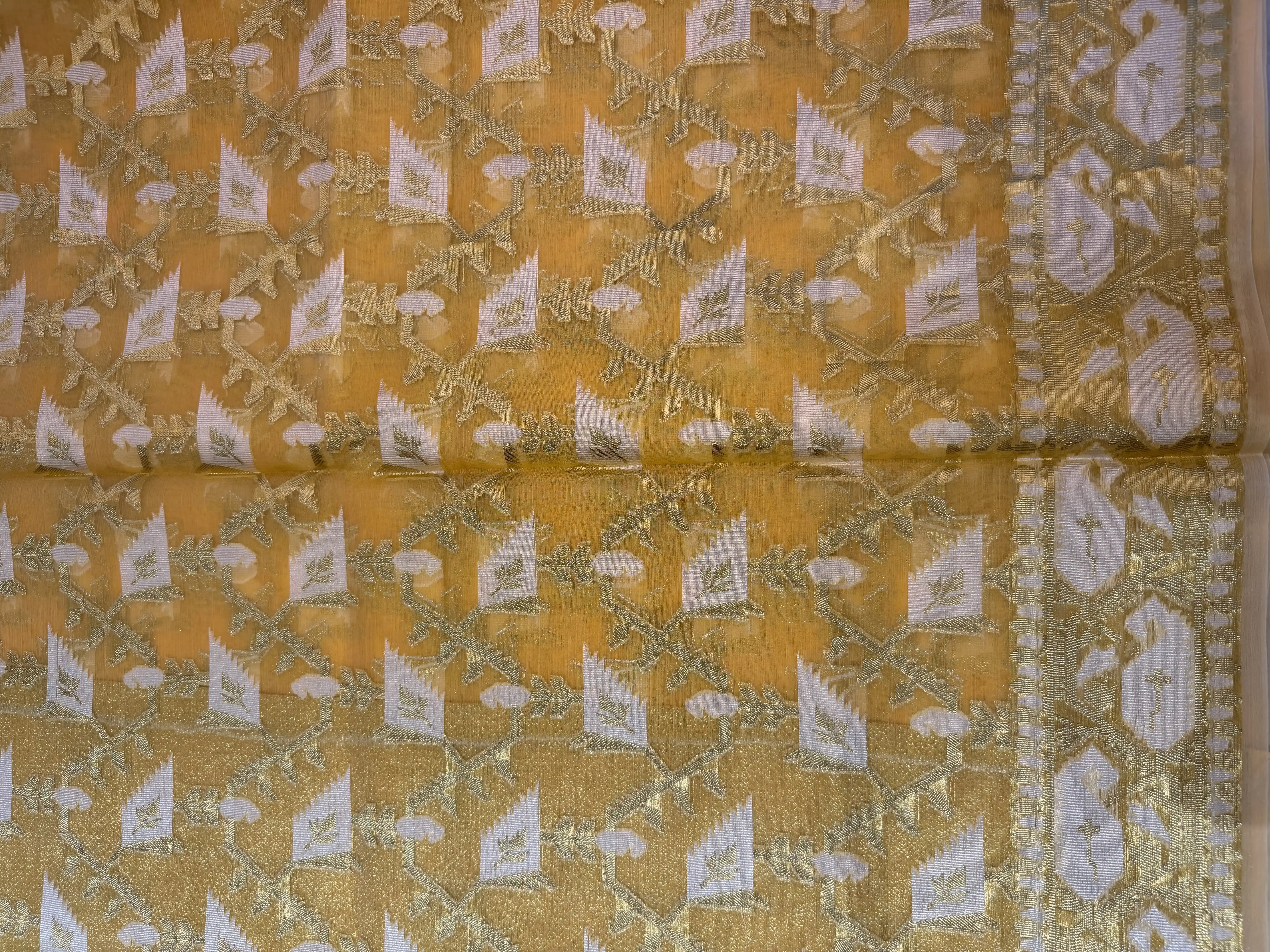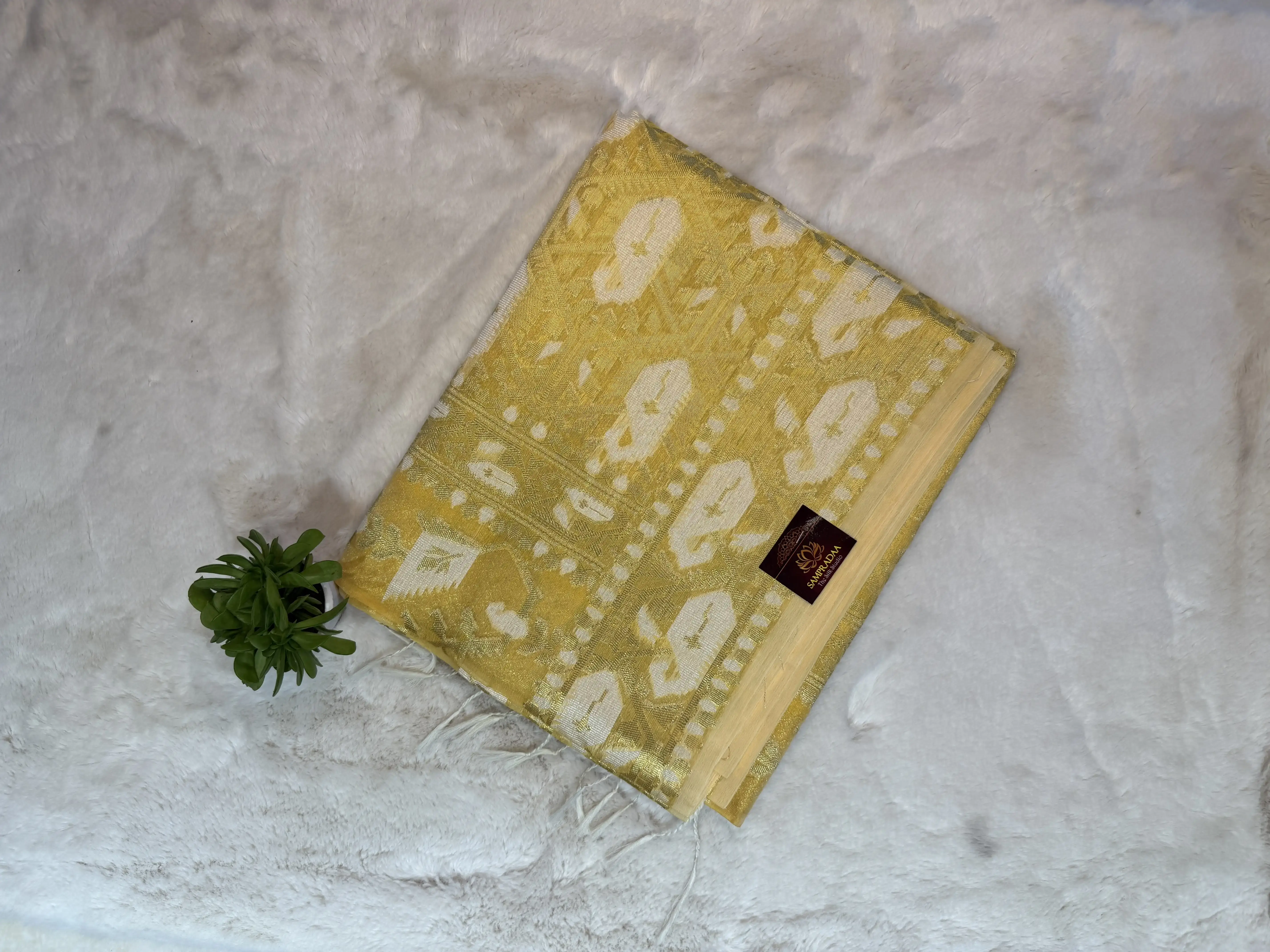 This Mustard Yellow Cotton Tissue Fancy saree blends earthy warmth with a subtle shimmer. The lightweight cotton base paired with the soft tissue finish creates a graceful flow that’s both comfortable and stylish.