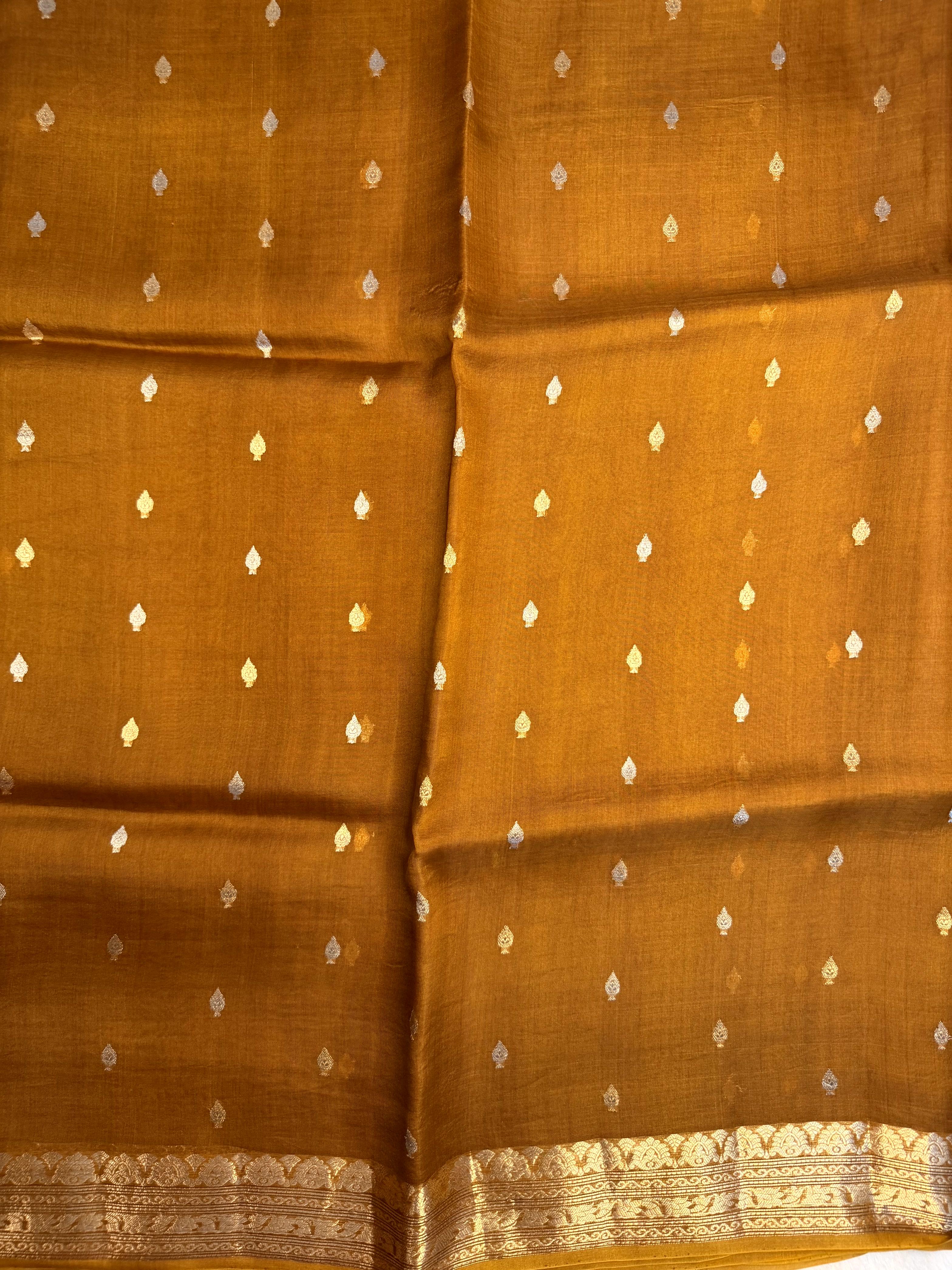 This mustard yellow pure kora organza saree is adorned with elegant antique zari work and delicate buttas scattered across the body, creating a refined and airy silhouette. The sheer organza texture paired with the muted zari sheen gives it an effortlessly luxurious look—perfect for weddings, festive occasions, and heritage celebrations where tradition meets graceful sophistication 💛