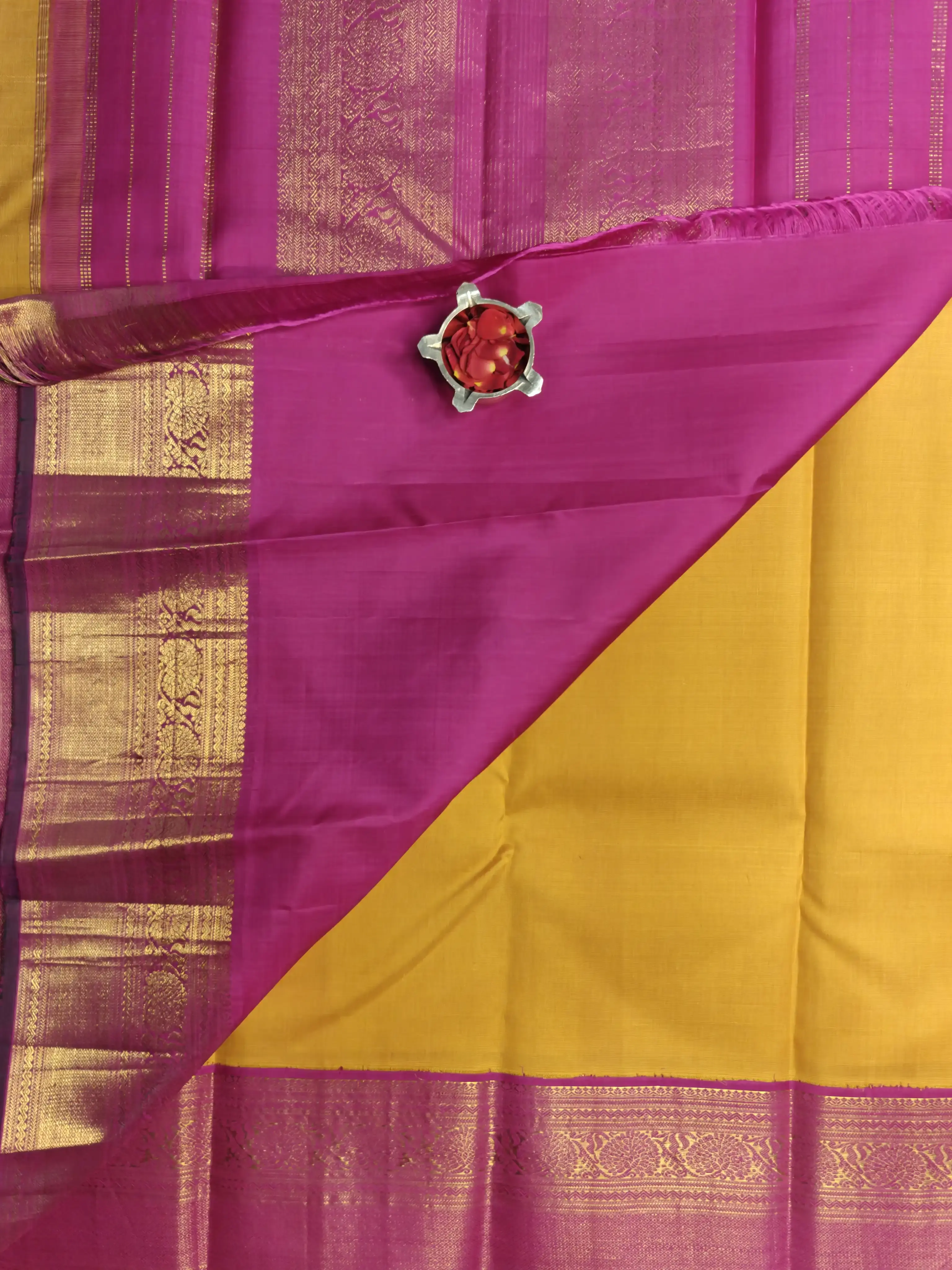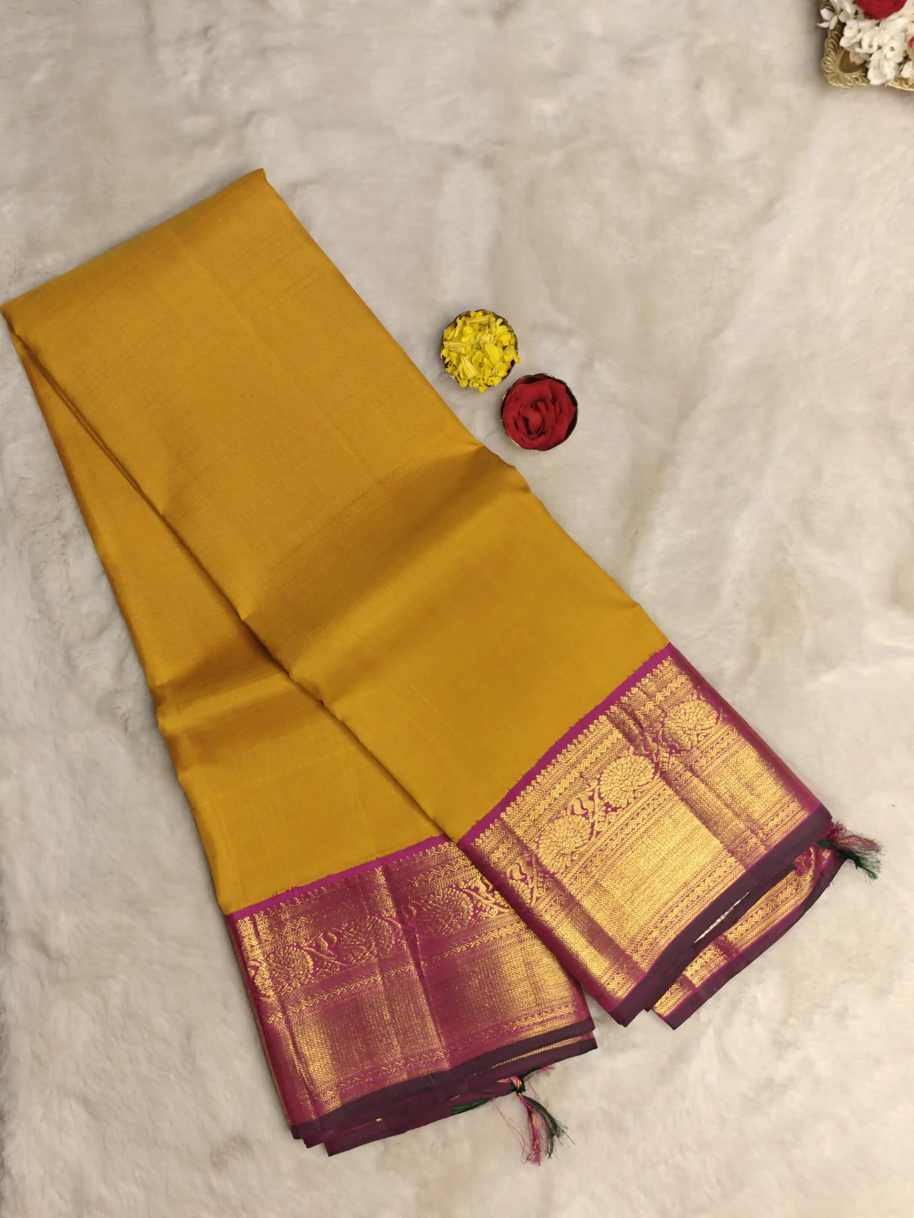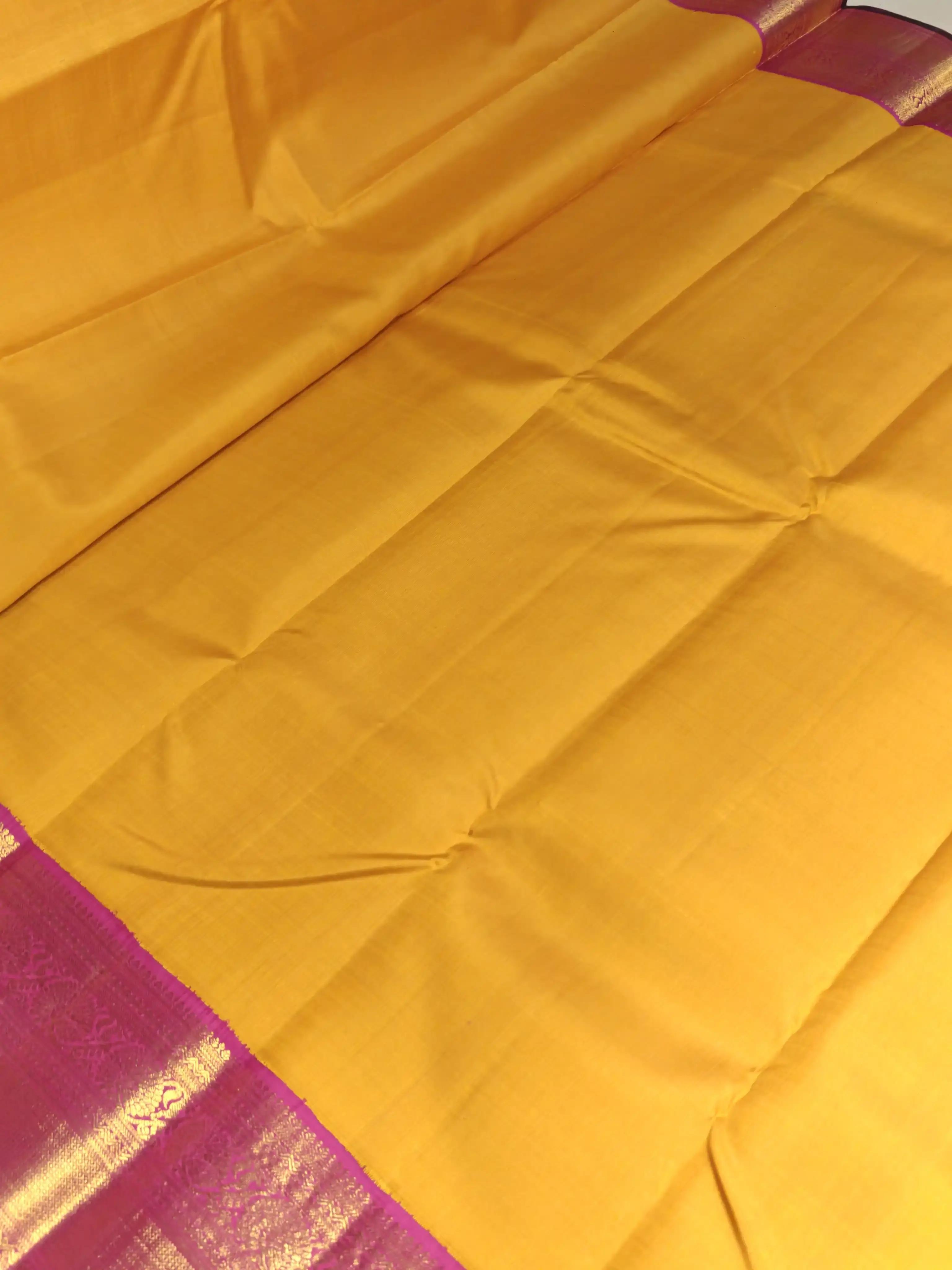 Mustard yellow with pink border silk saree