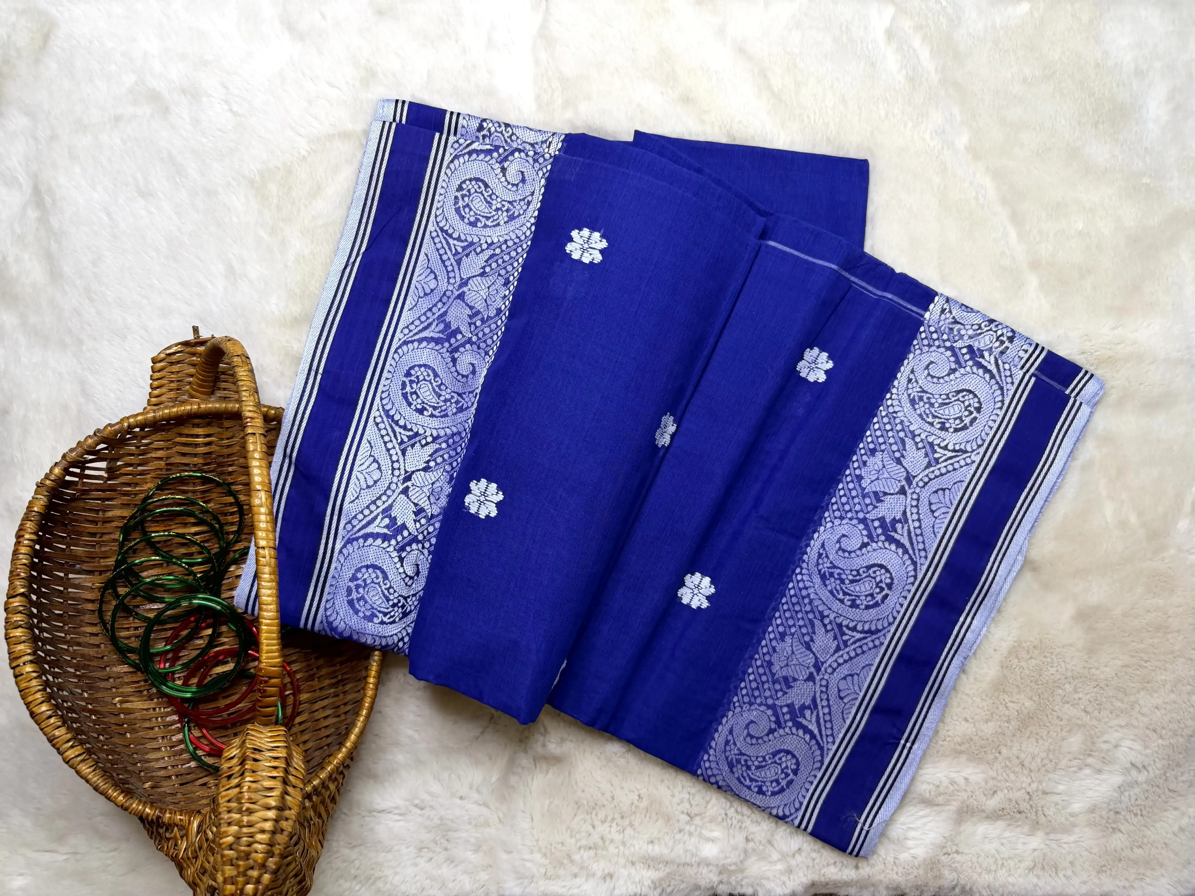 A timeless classic, this Navy Blue & White traditional Dhaniakali cotton saree brings together rich heritage and effortless elegance. The deep navy body paired with crisp white detailing offers a clean, sophisticated contrast true to traditional Dhaniakali weaving.