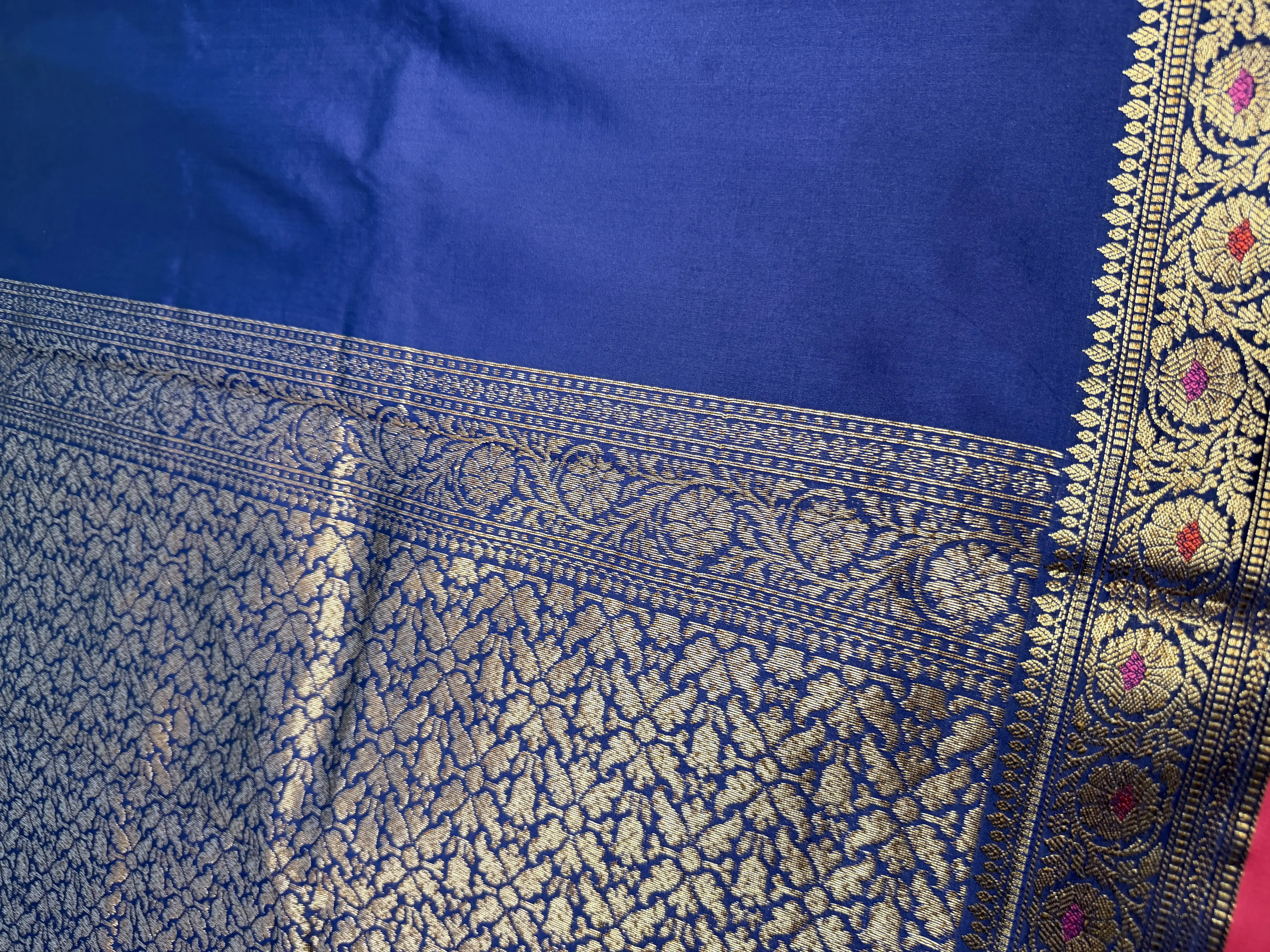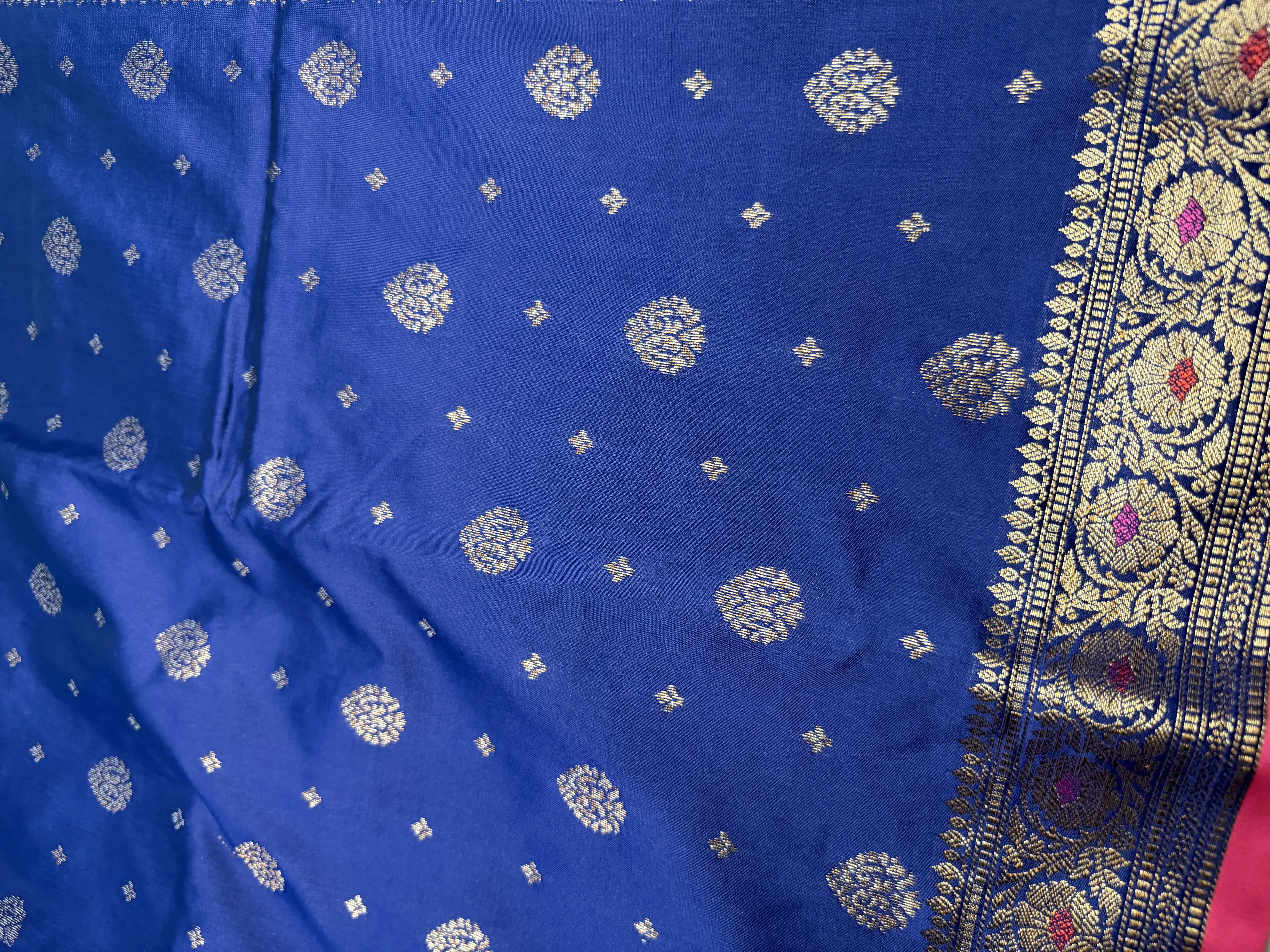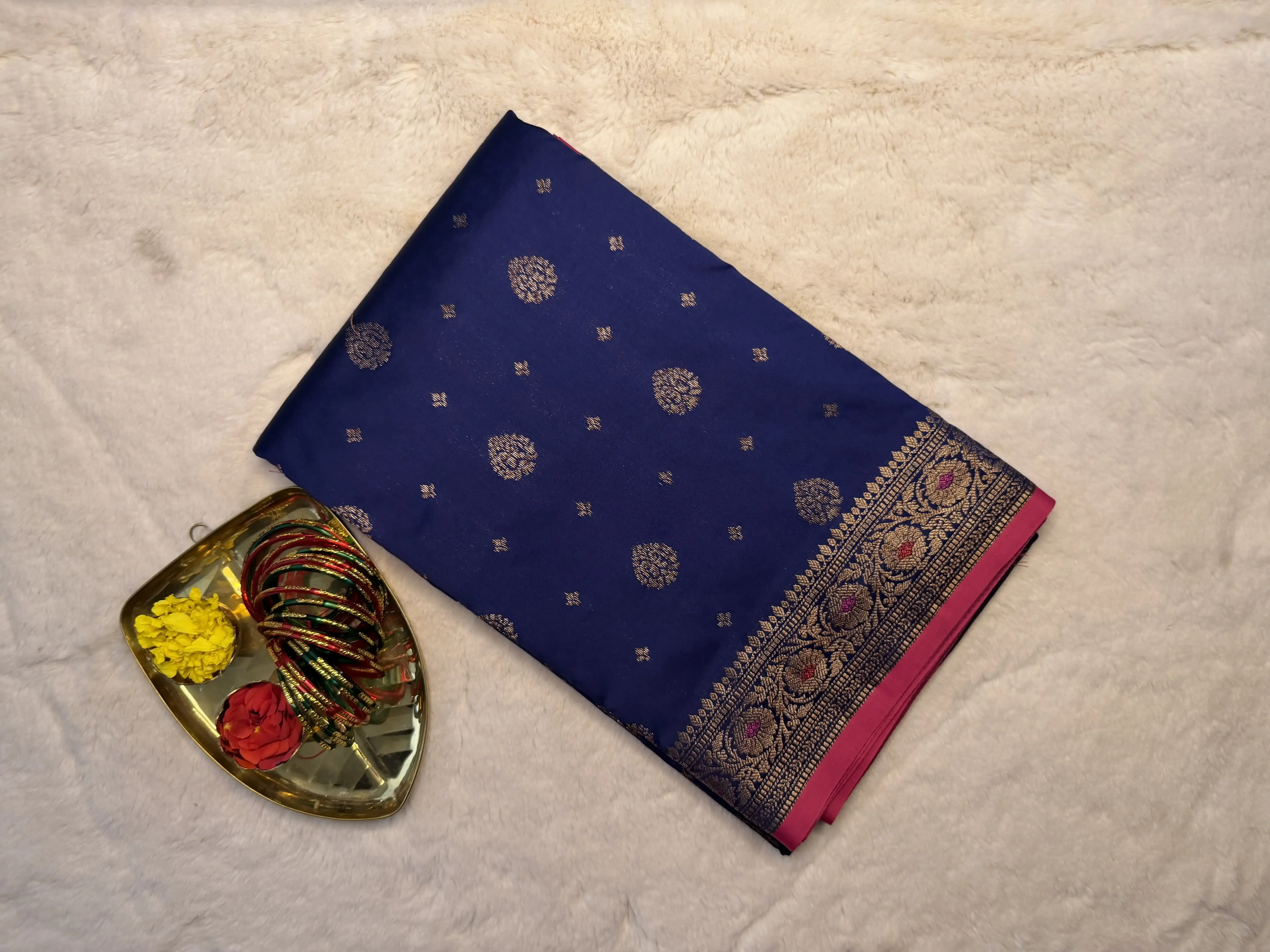 This navy blue semi-Banaras saree features delicate small buttas gracefully spread across the body, adding subtle texture and refined charm. The look is elevated by a richly woven pallu, showcasing the timeless artistry of Banaras craftsmanship.