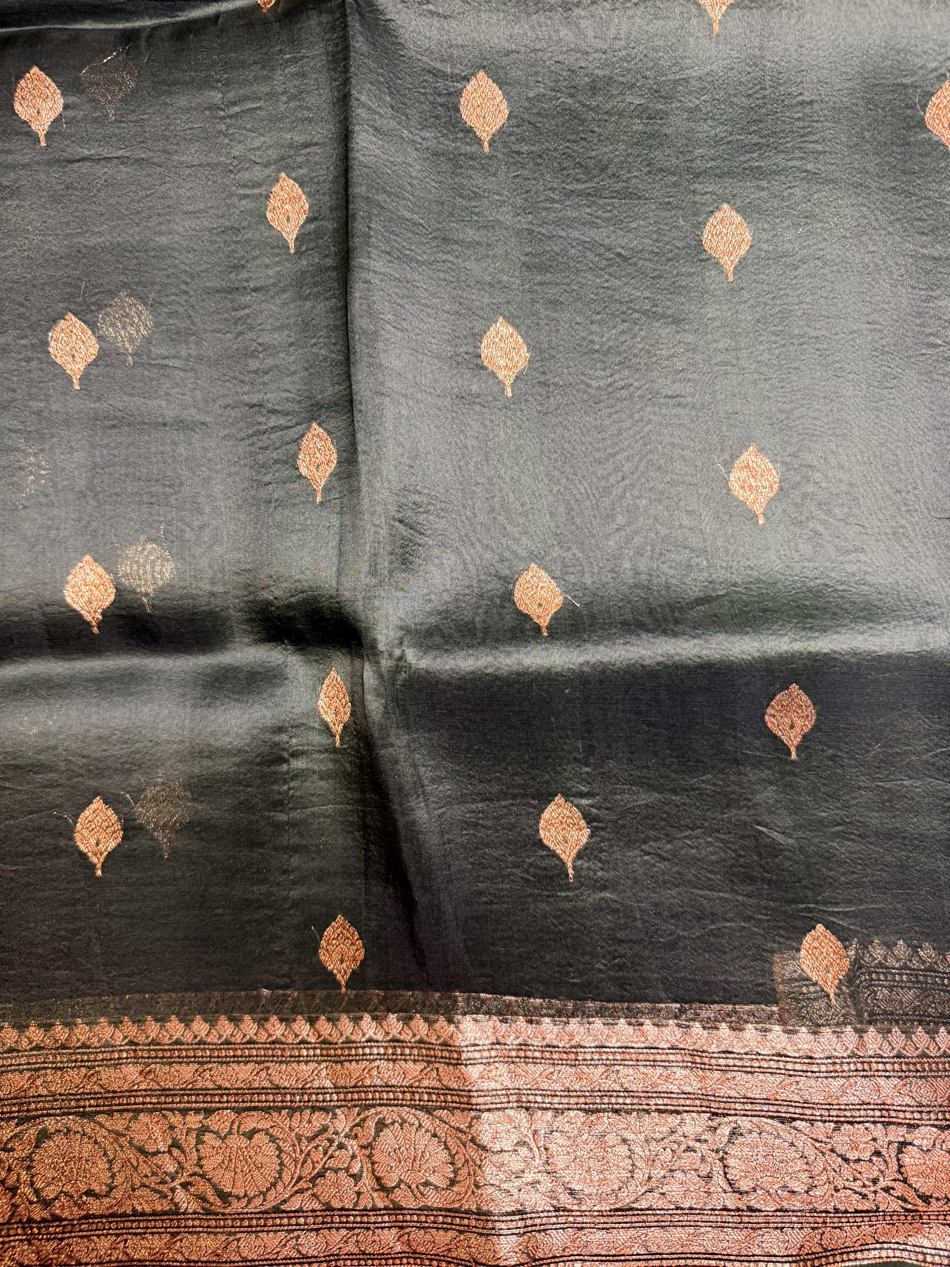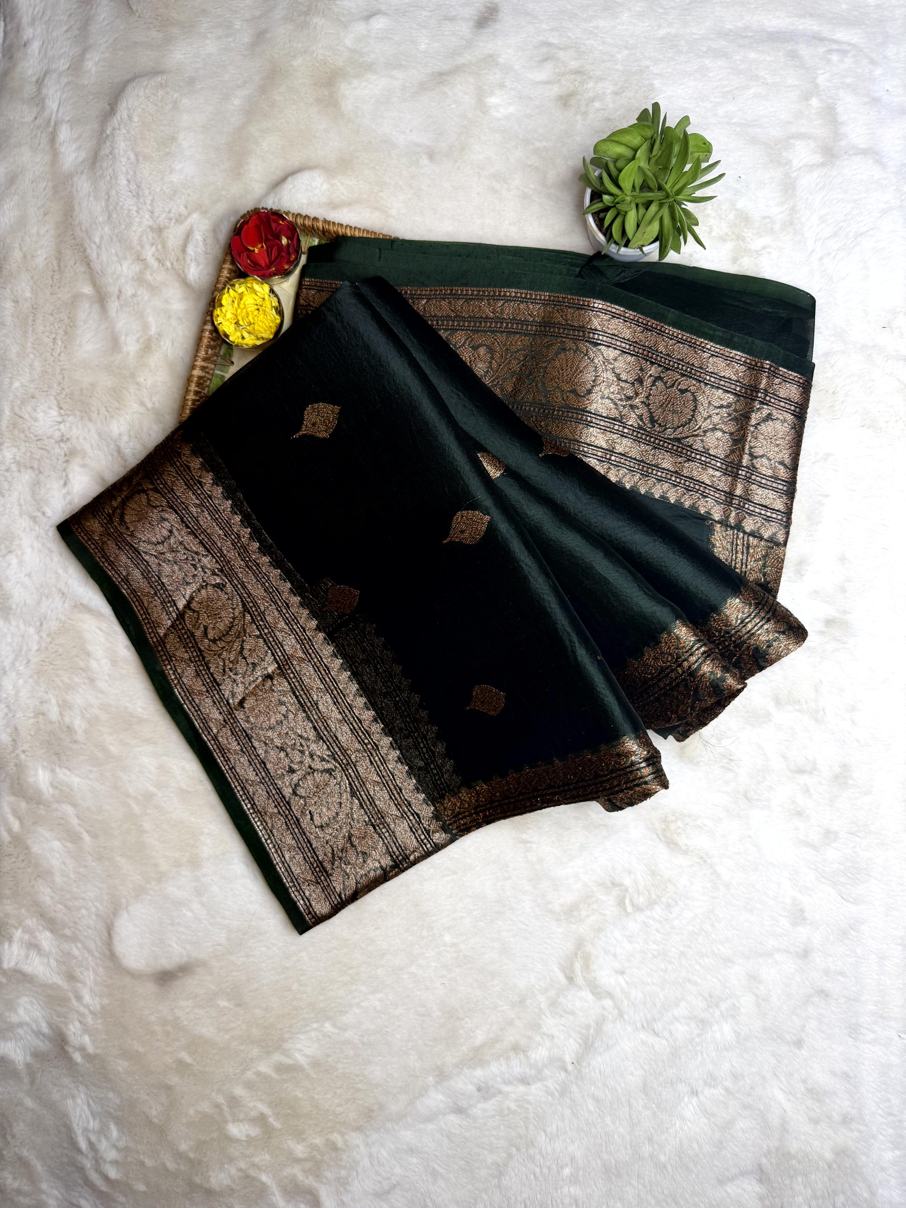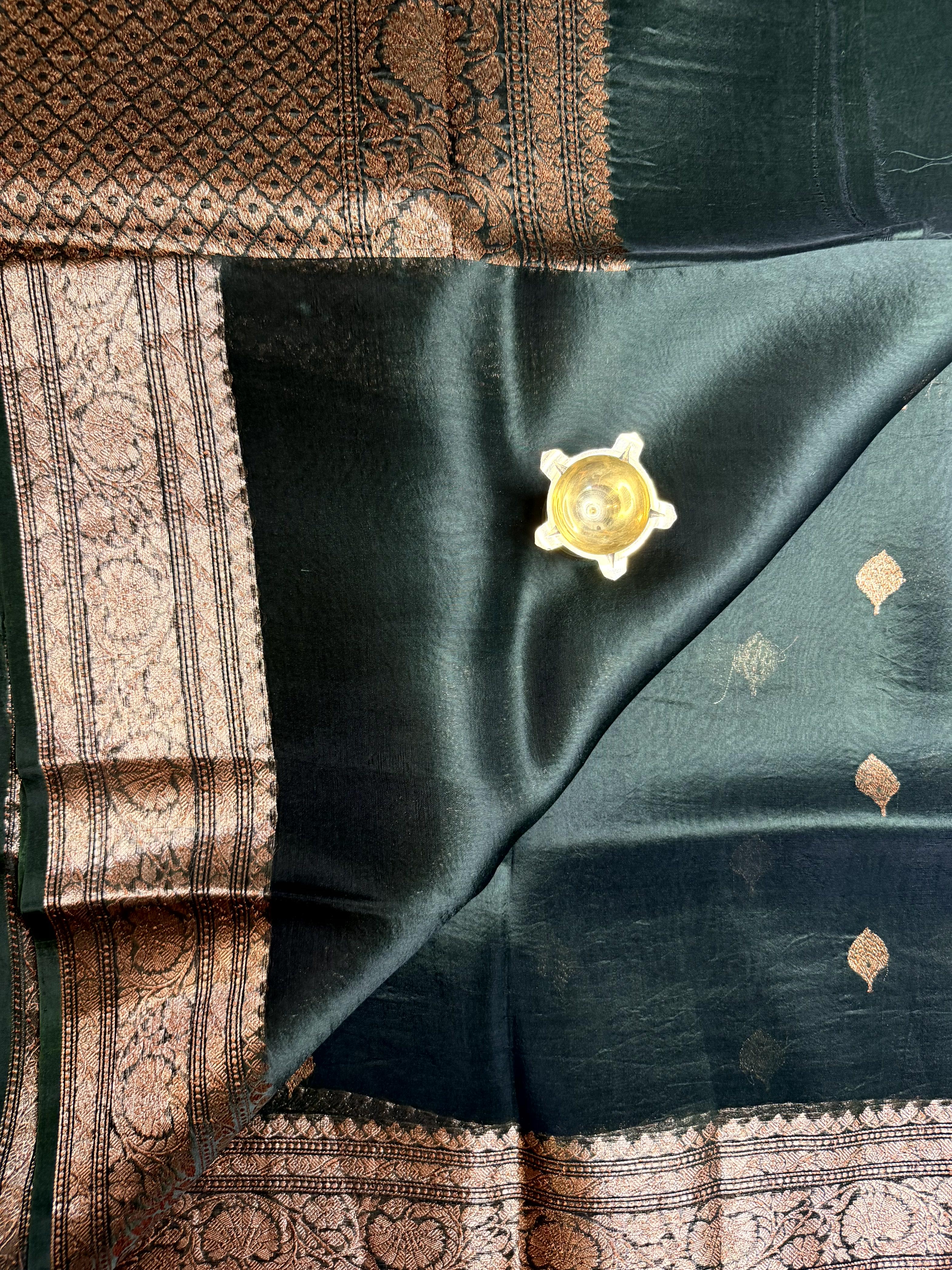 Olive Green antique zari pure kora organza saree