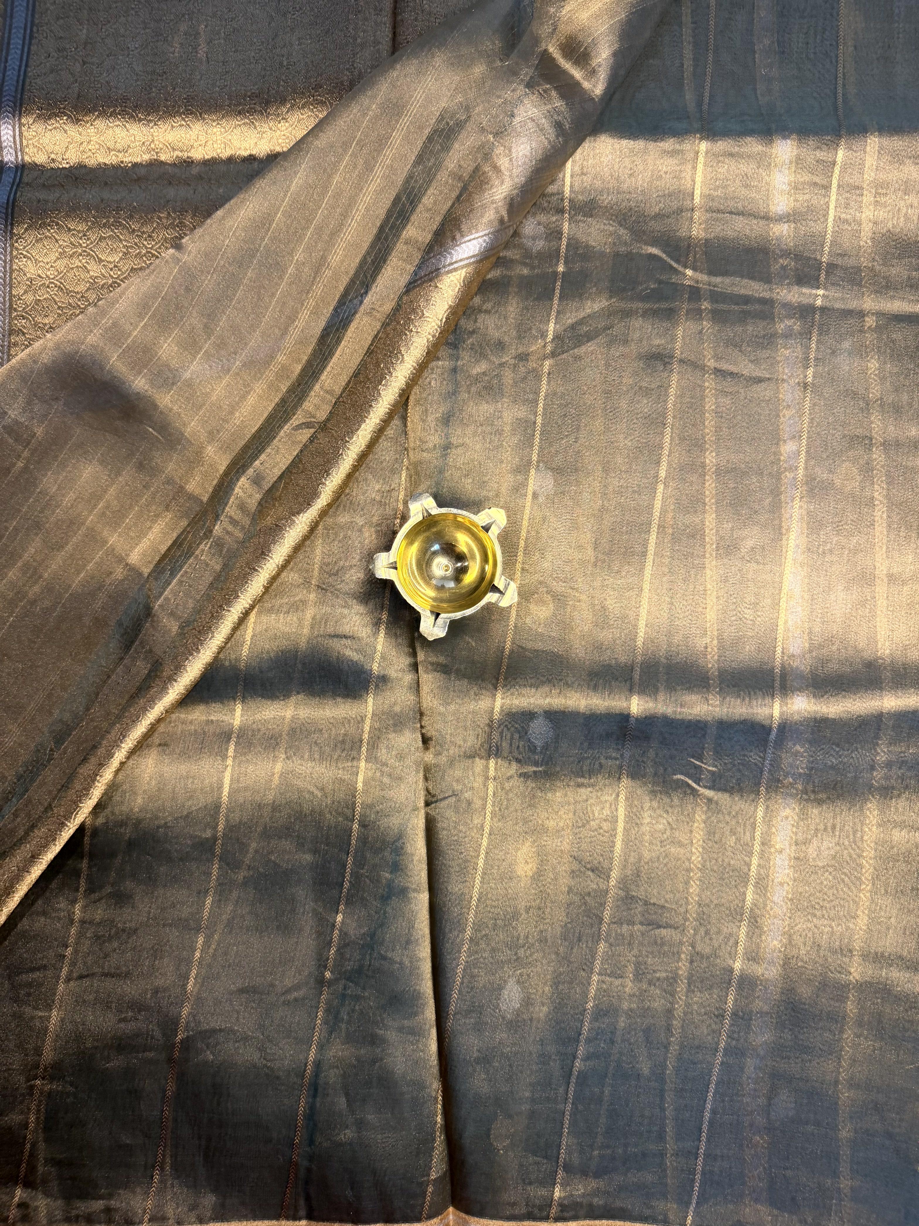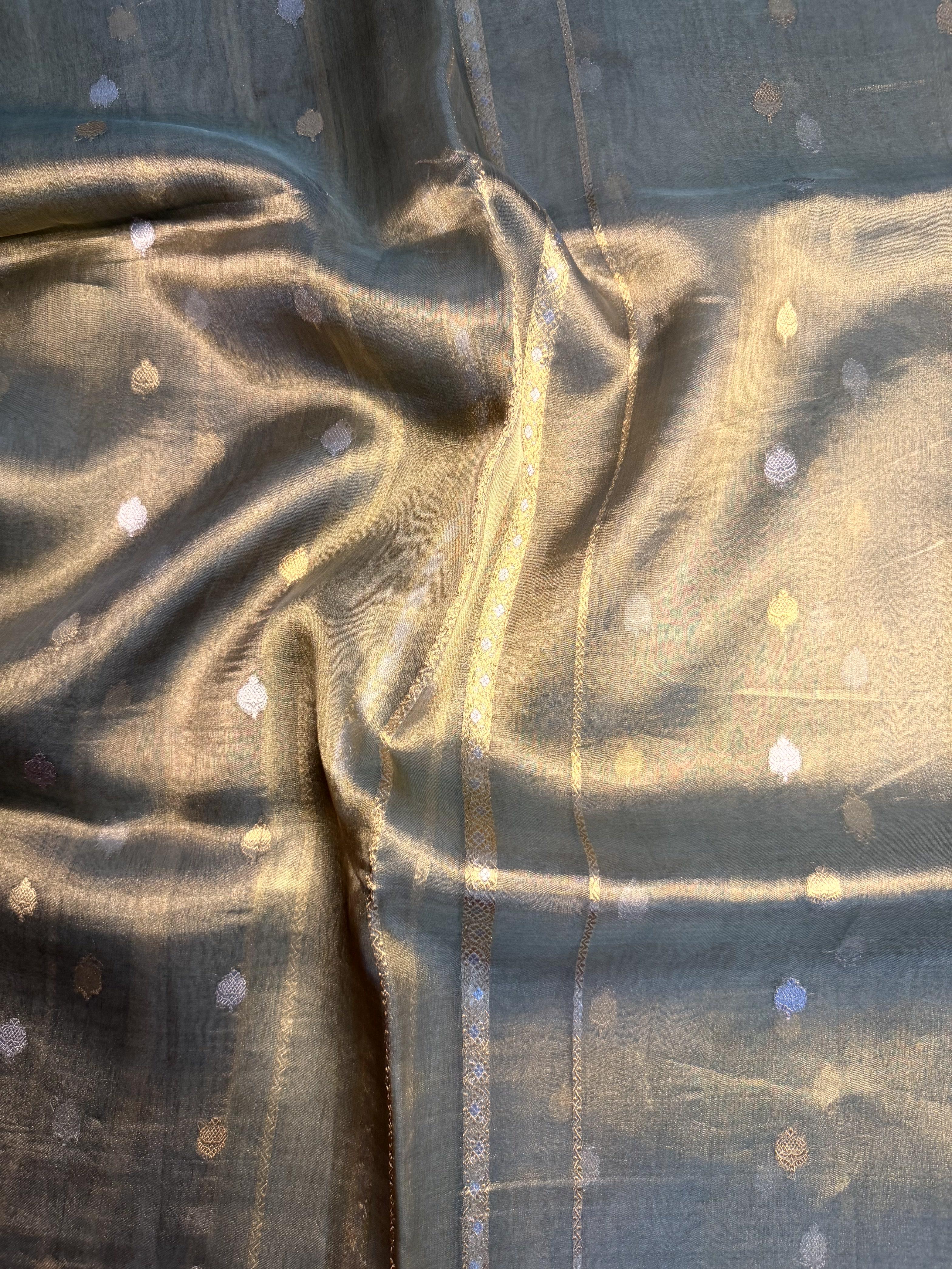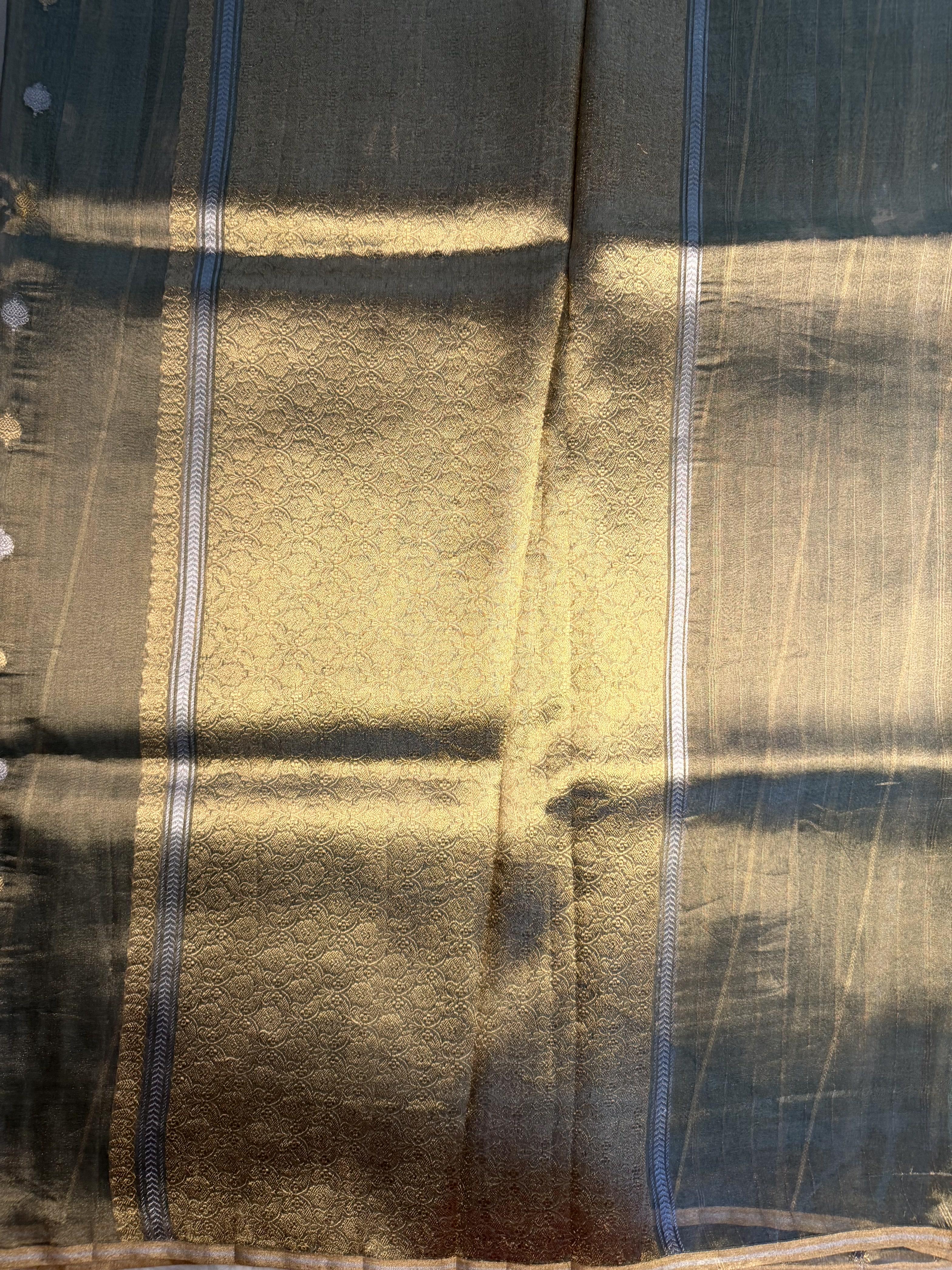 A subtle symphony of tradition and grace, this pure tissue Kora organza saree in serene olive green exudes effortless sophistication. The sheer, lightweight fabric carries a delicate crispness that allows each fold and pleat to fall with perfect structure. Adorned with intricately woven small buttas throughout, the saree captures the essence of minimalistic charm and heritage craftsmanship. Ideal for festive occasions, temple visits, and elegant gatherings, this saree is a timeless treasure for those who appreciate understated beauty and refined handloom artistry โจ๐