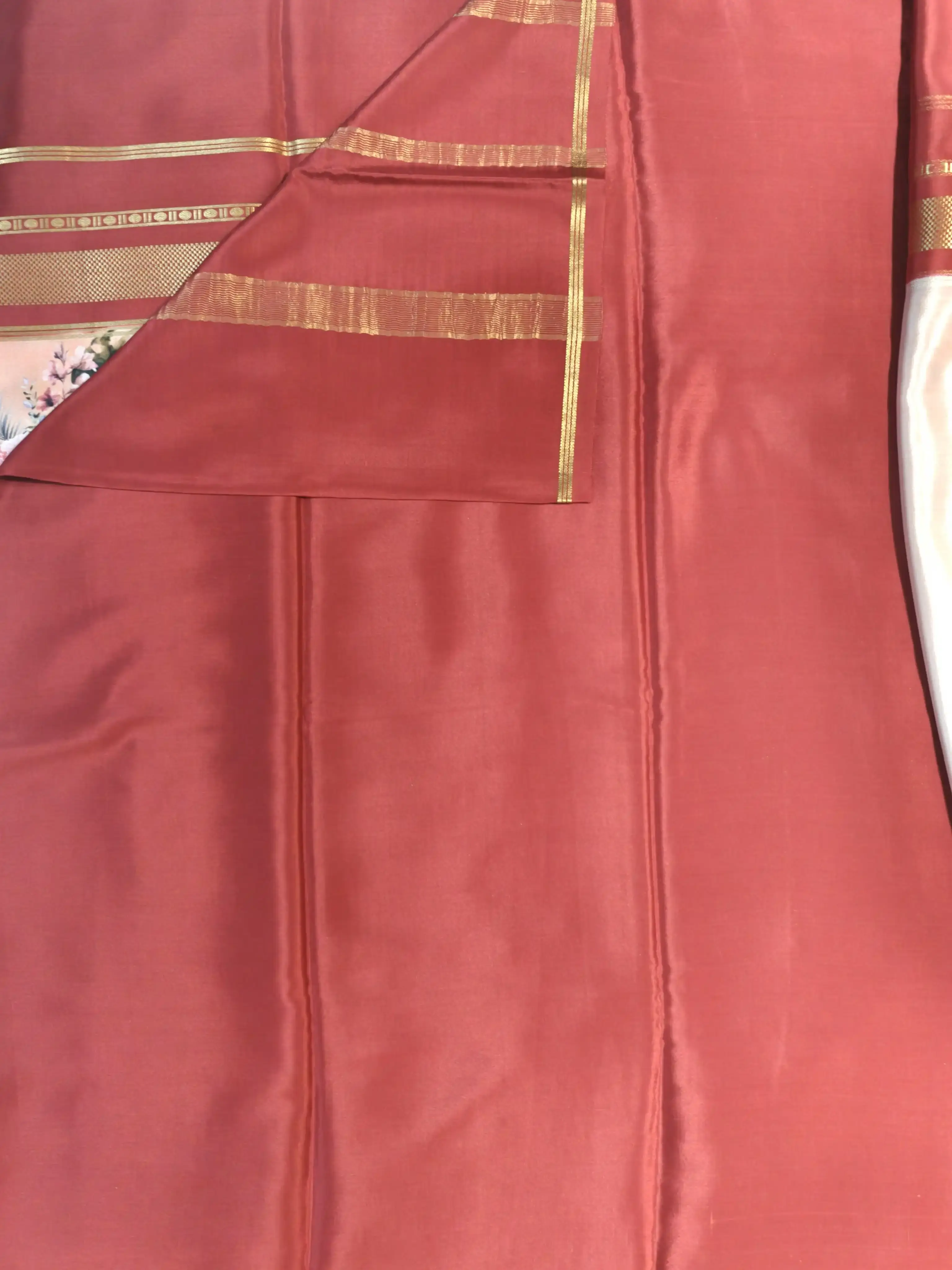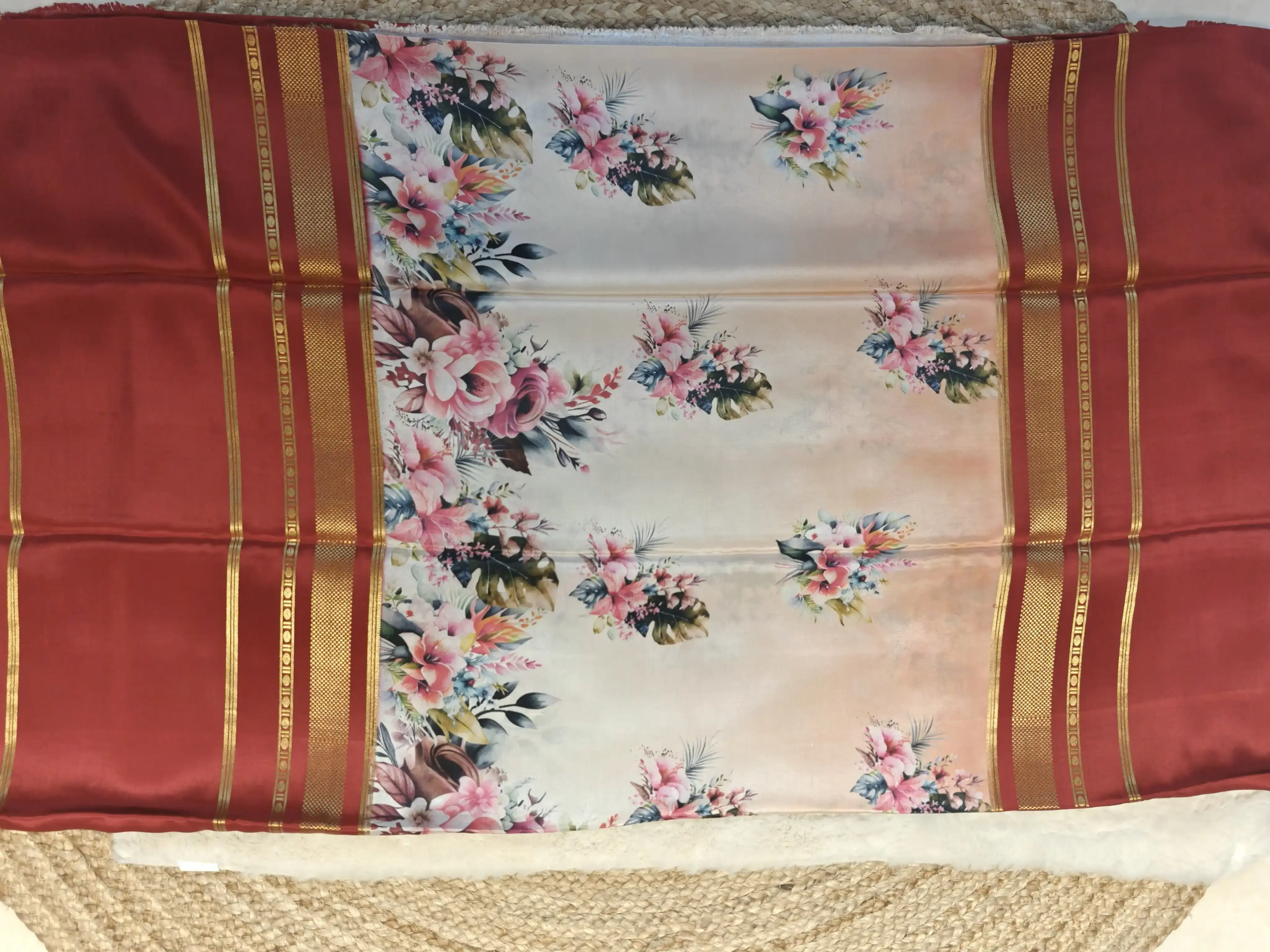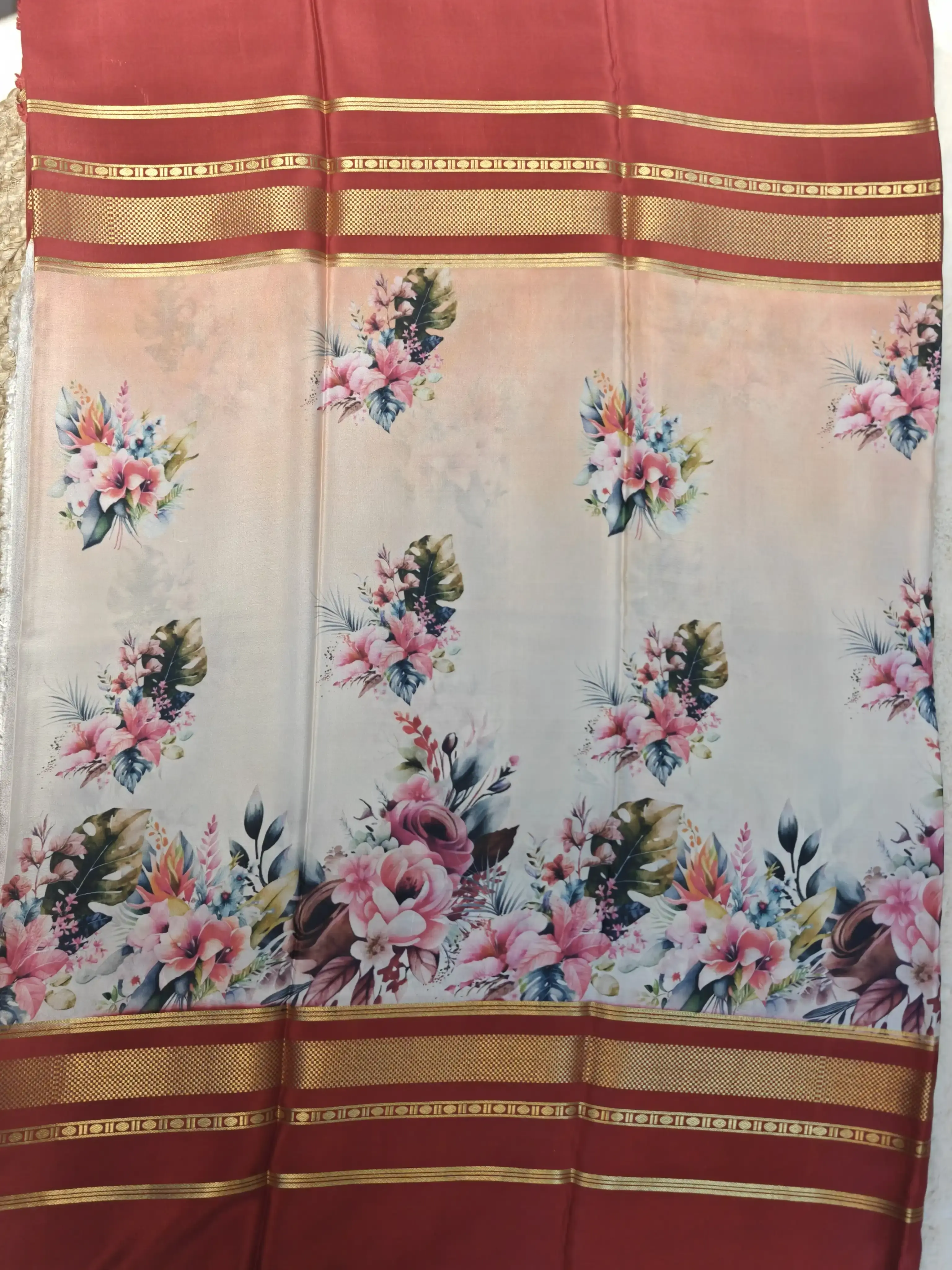 Peach printed silk with red gap border pure crepe silk saree 120gsm