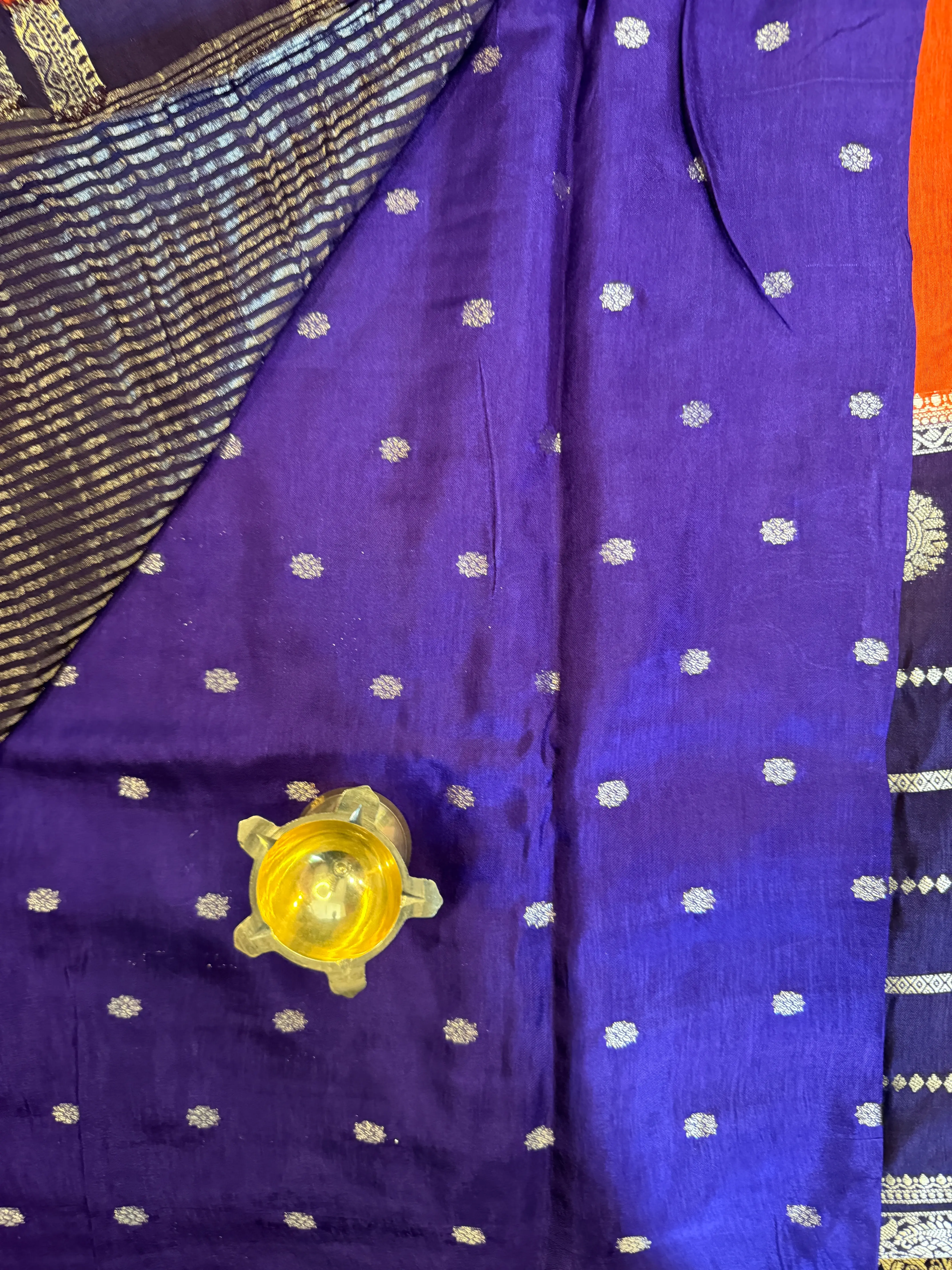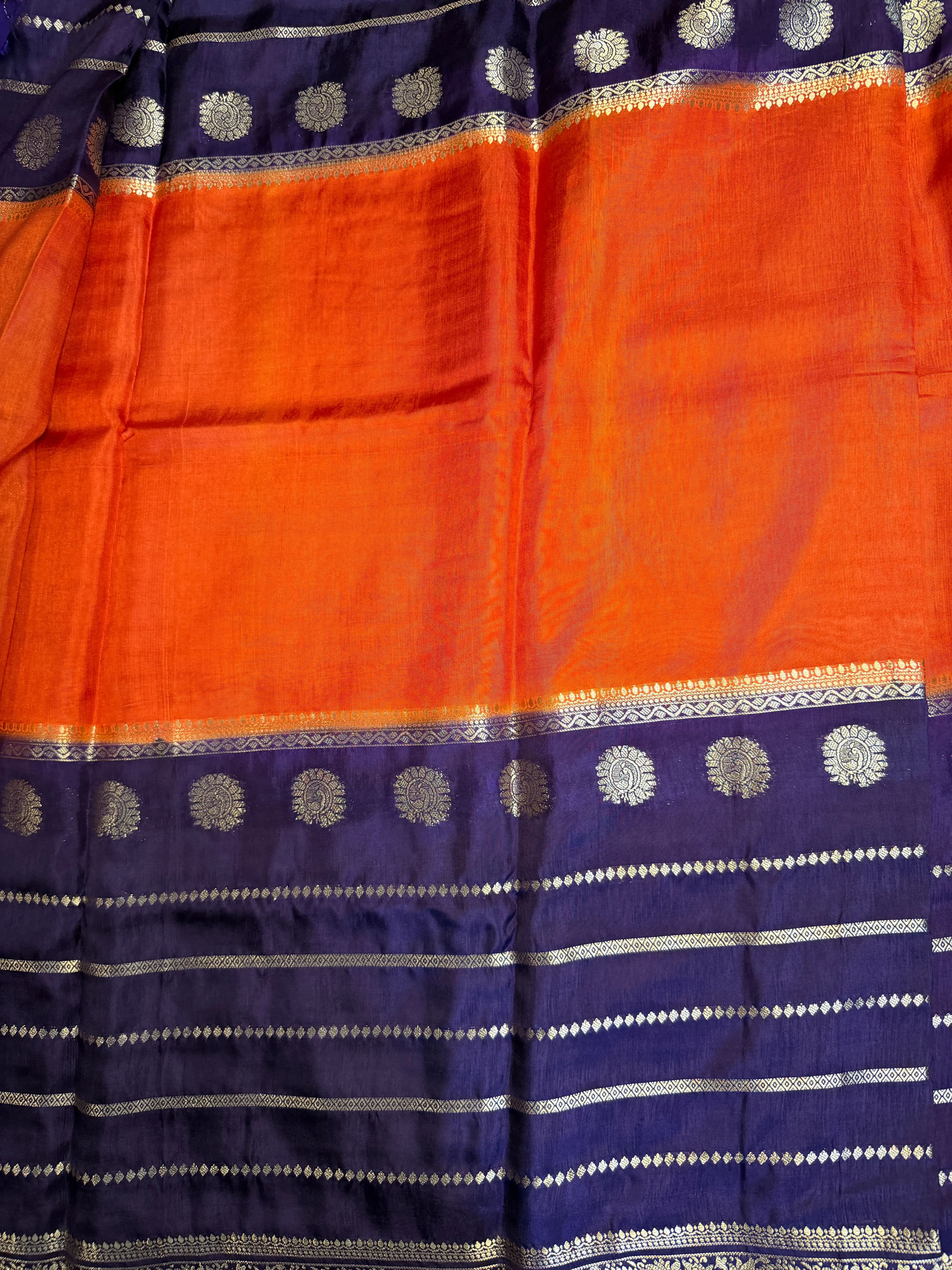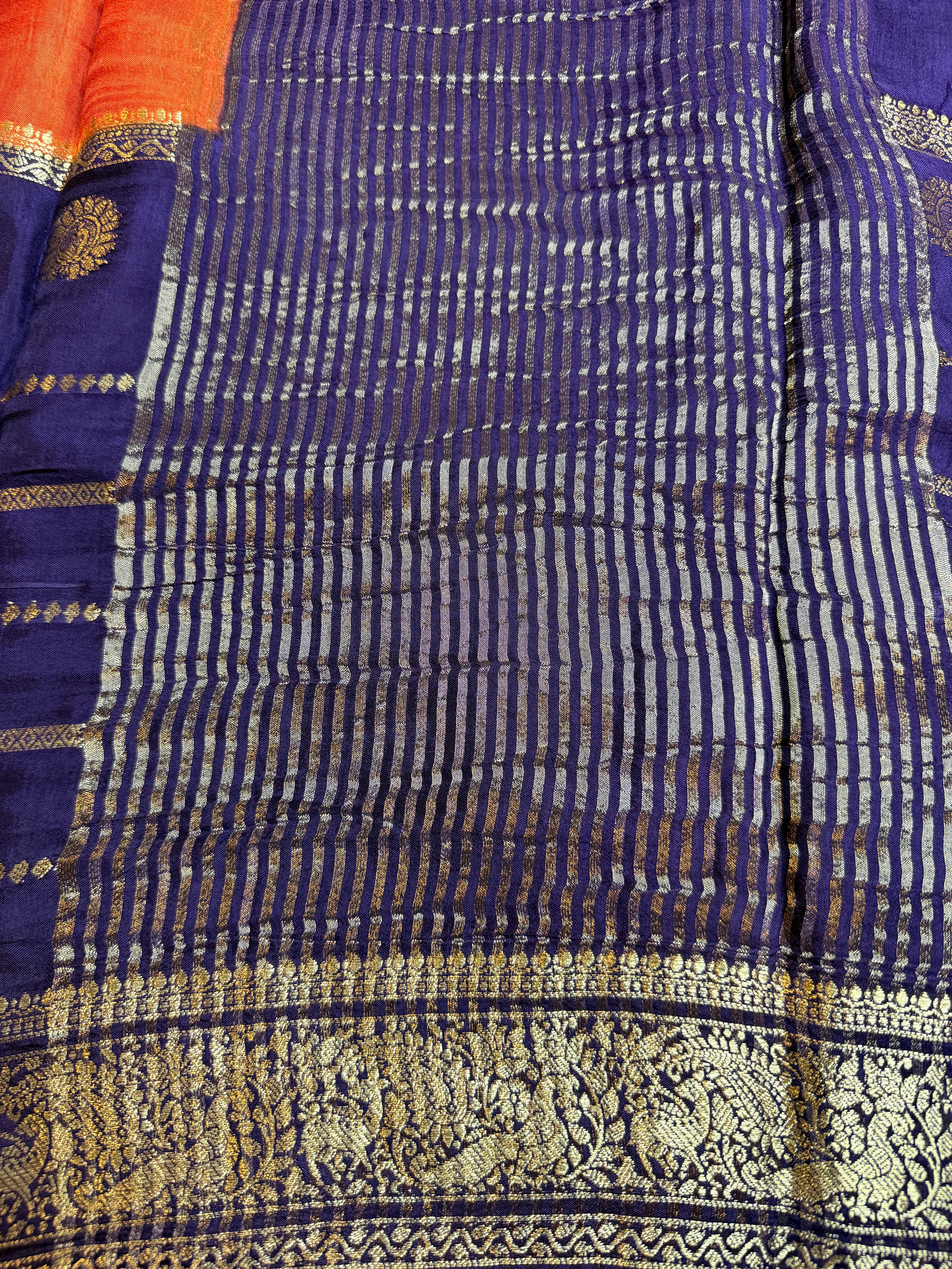 Make a vibrant style statement with this Orange & Purple Long Border Semi Crepe Saree. The striking color combination paired with the elegant long border adds a rich and graceful touch, while the soft semi-crepe fabric ensures a smooth and flattering drape. Perfect for festive days and special occasions. ✨