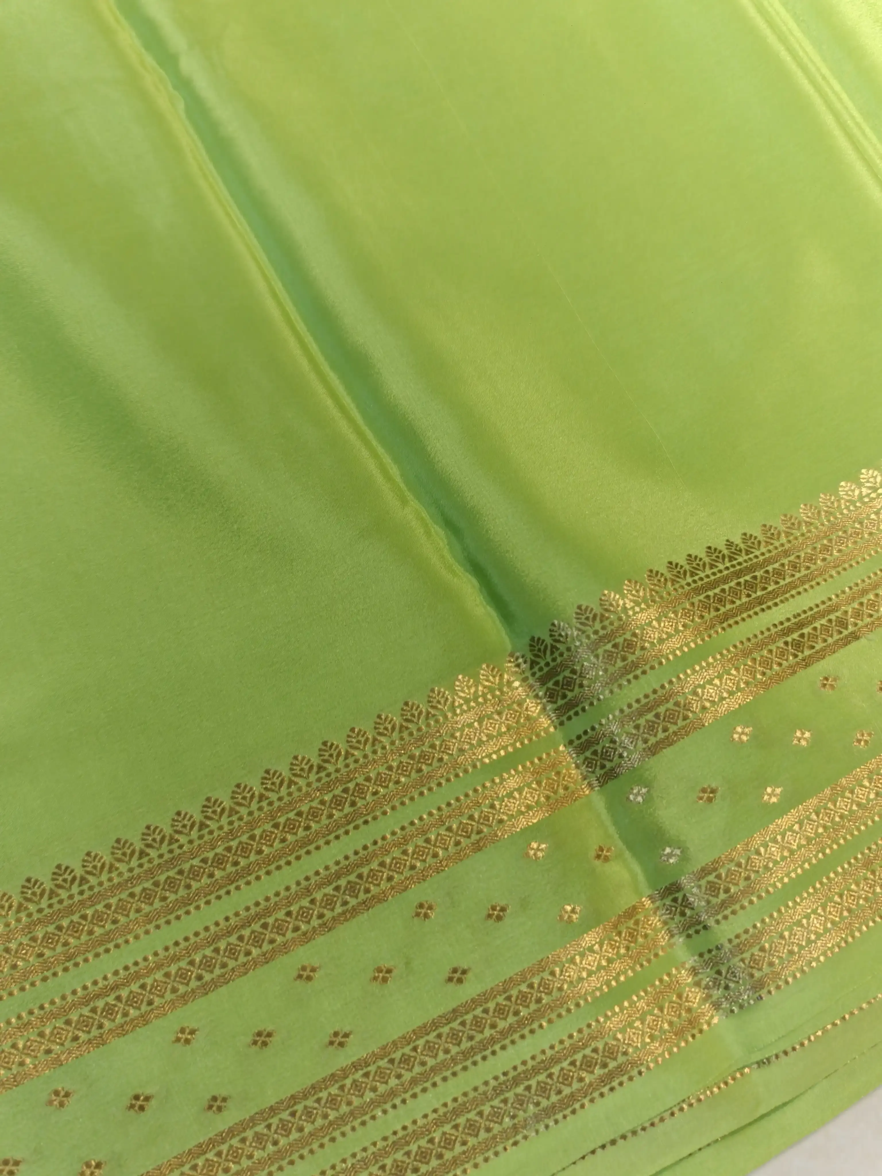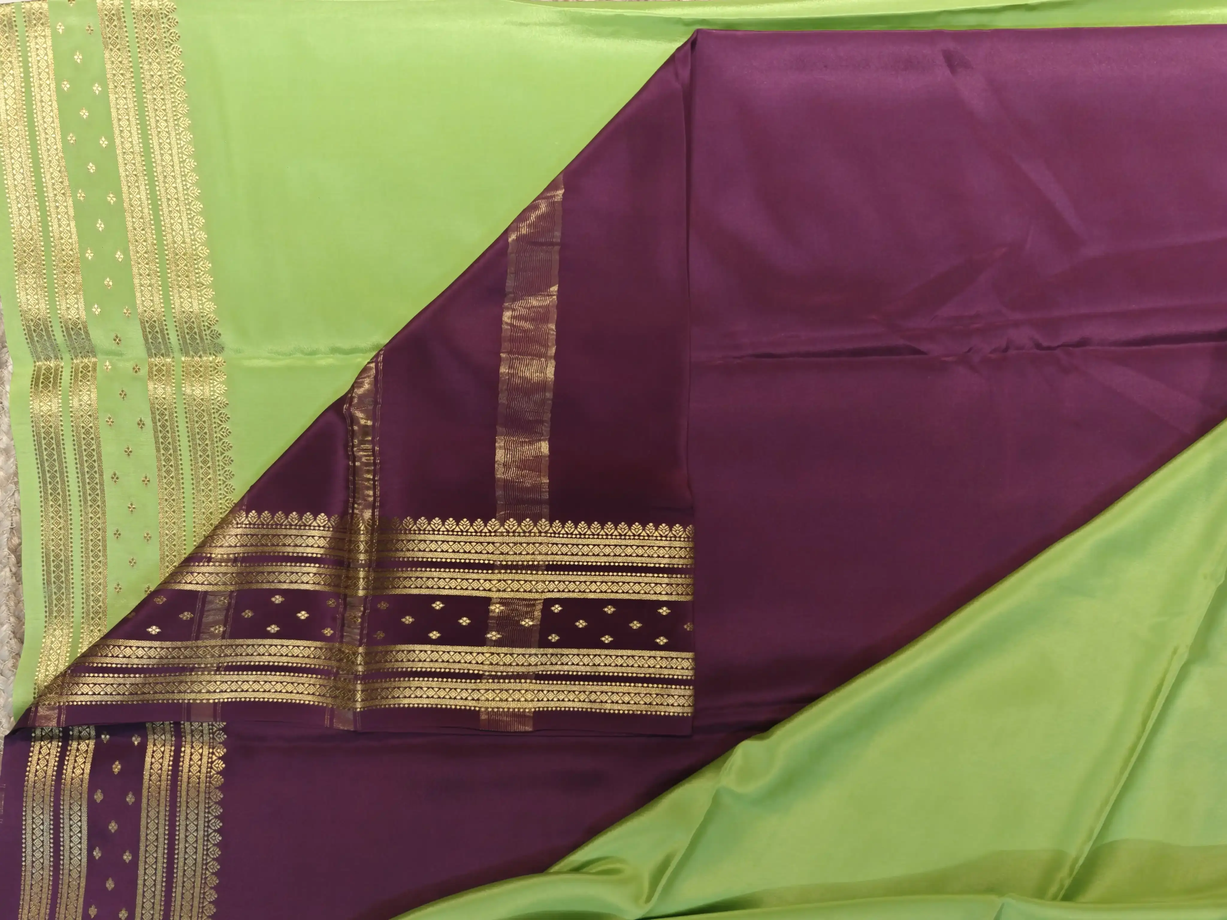 Timeless and gracefully understated, this pure Mysore crepe silk saree (120 GSM) in a parrot green body and magenta pallu and blouse is the epitome of classic elegance. The smooth, fluid drape and gentle natural sheen highlight the purity of the silk, while the plain body is beautifully complemented by a refined, elegant border.