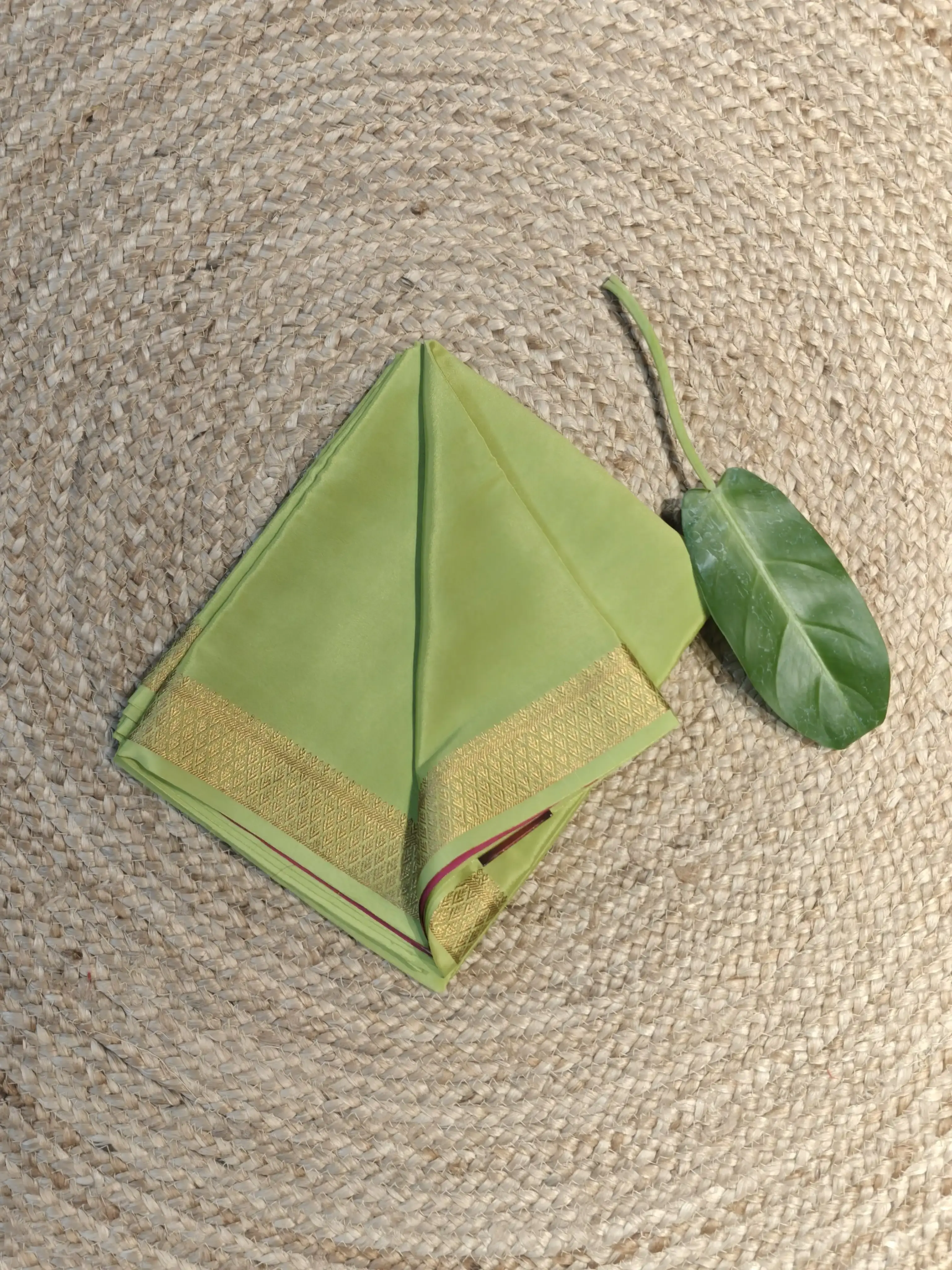 Timeless and gracefully understated, this pure Mysore crepe silk saree (120 GSM) in a parrot green body and pink pallu and blouse is the epitome of classic elegance. The smooth, fluid drape and gentle natural sheen highlight the purity of the silk, while the plain body is beautifully complemented by a refined, elegant border.