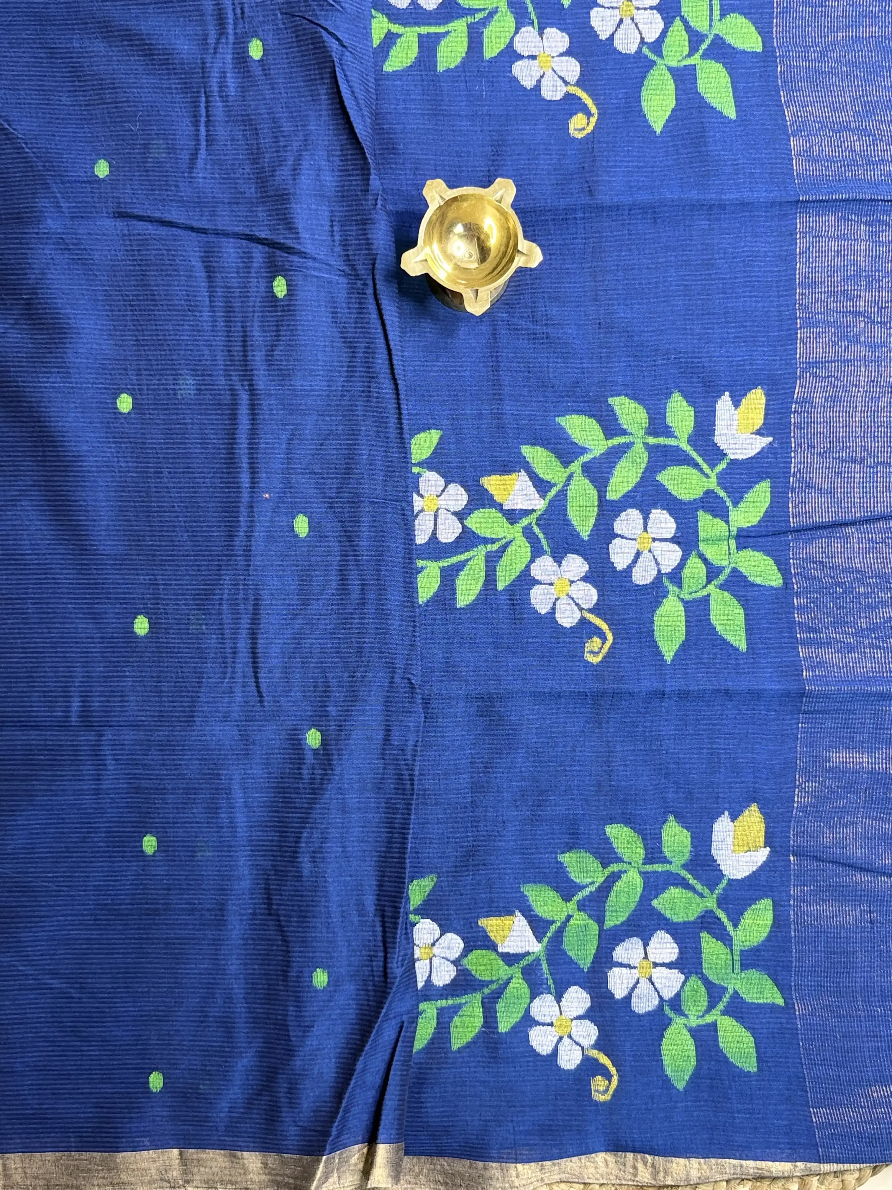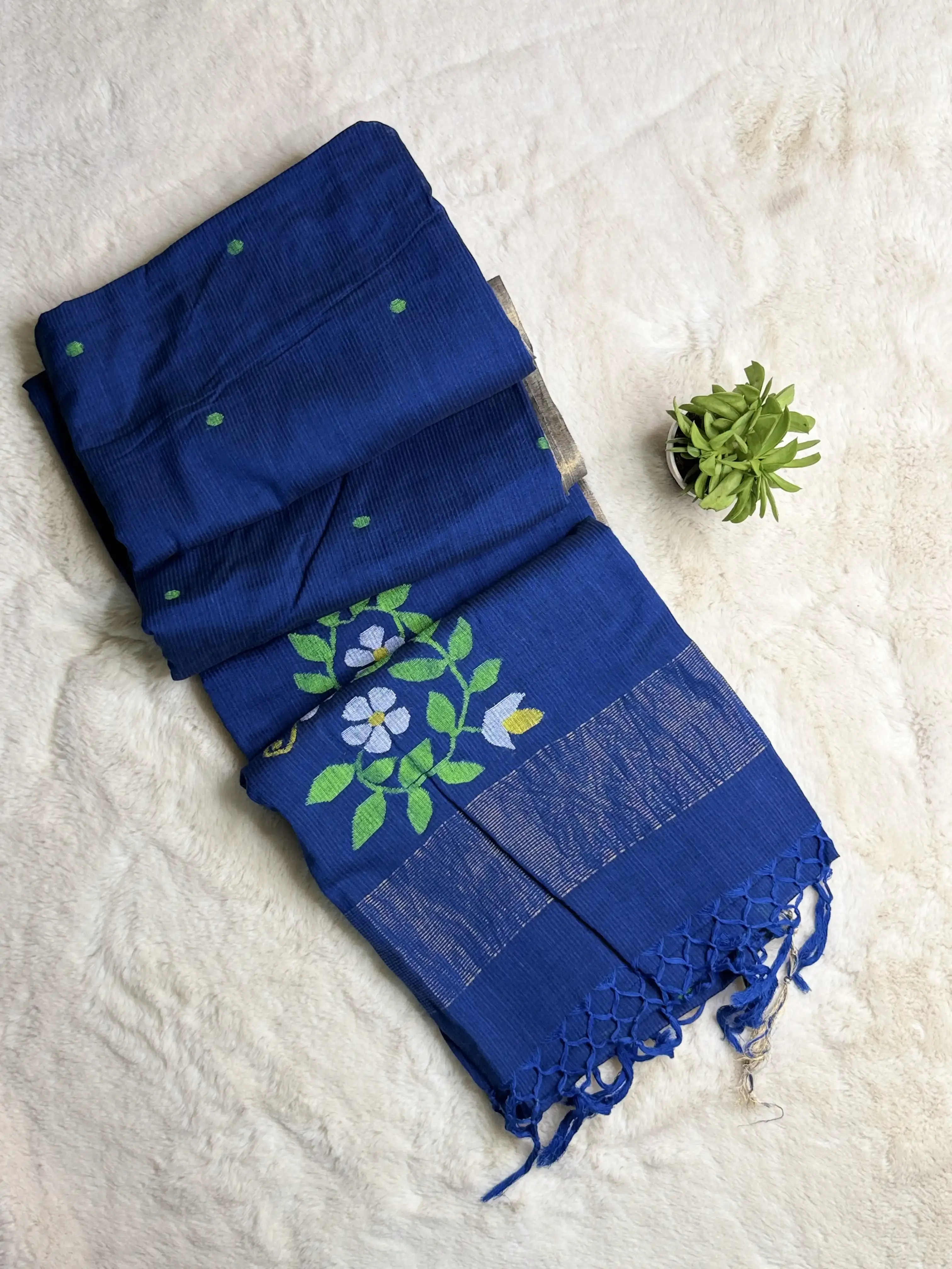 This peacock blue floral pattern pure linen cotton saree blends rich color with airy comfort. Delicate floral motifs soften the vibrant peacock blue base, while the linen-cotton weave ensures a graceful drape and all-day ease. Perfect for elegant day wear, festive afternoons, or effortless statement styling ✨