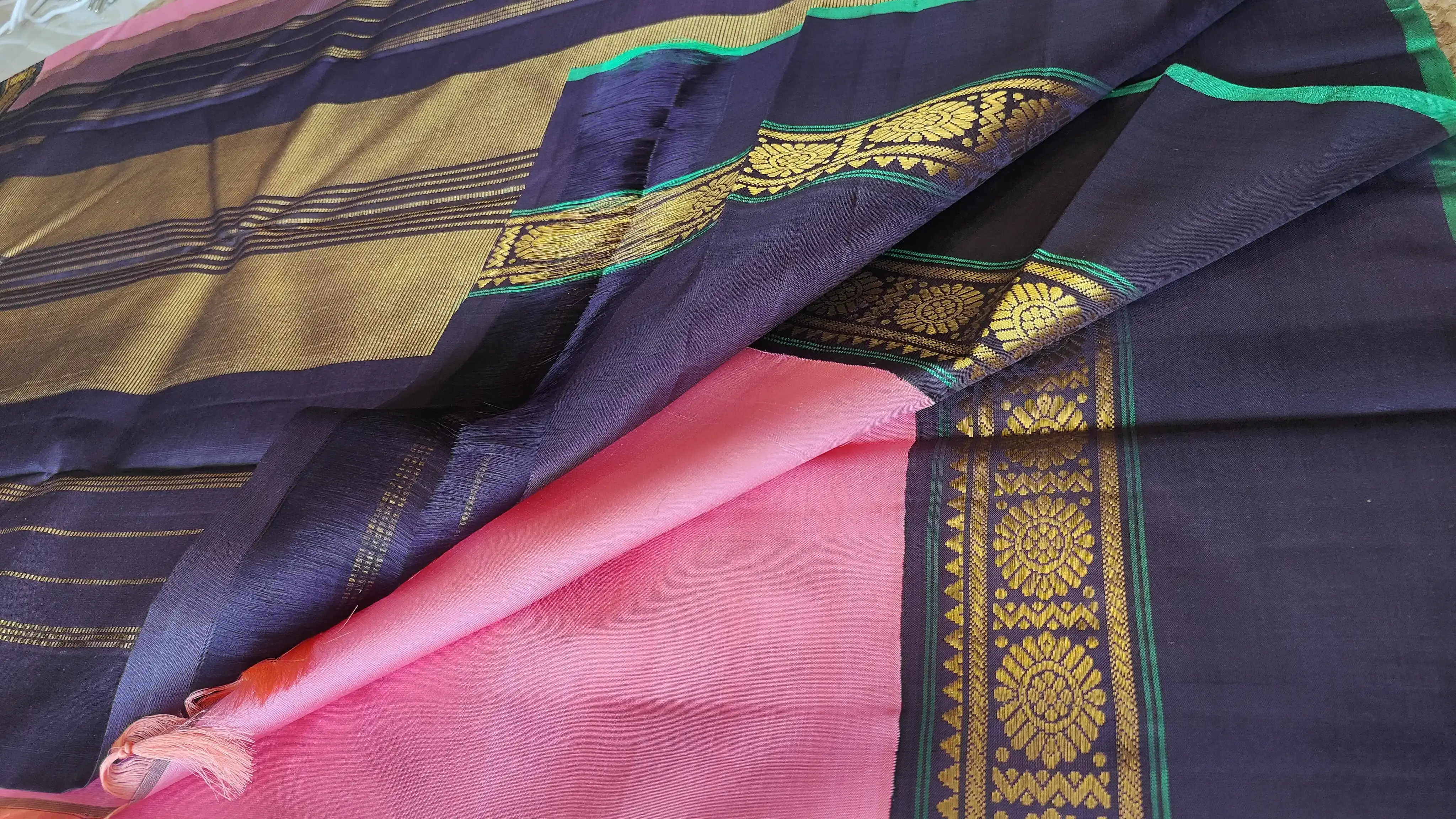 A vision of understated elegance, this pure Kanchipuram silk saree in soft pink features a plain, luminous body that highlights the richness of authentic silk. Finished with a striking navy blue Bentex border, this drape blends minimal design with regal contrast—perfect for weddings, festive occasions, and timeless celebrations.