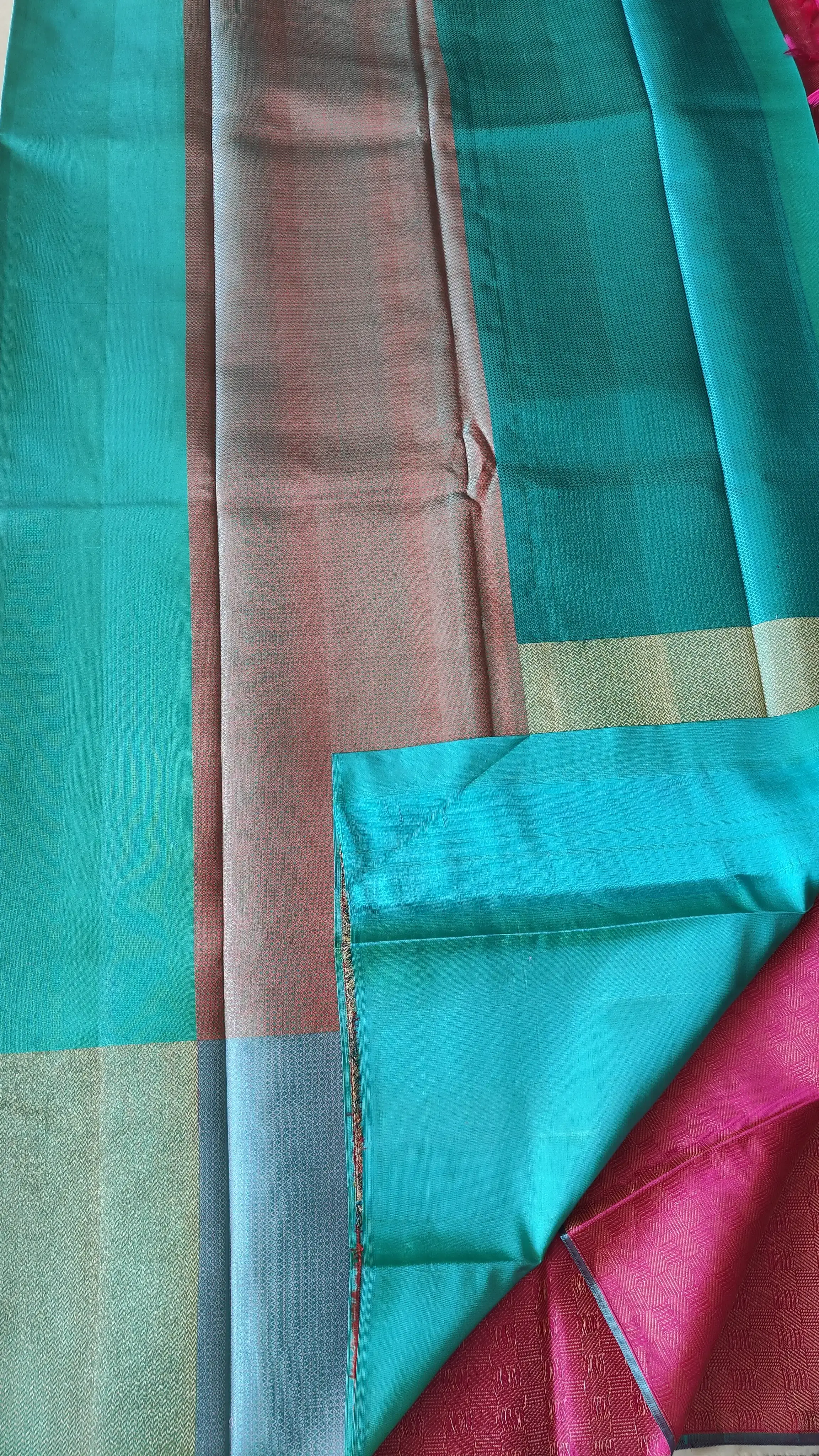 A striking blend of tradition and modern elegance, this pure Kanchipuram silk saree features a pink body richly woven in full zari, creating a luminous, borderless silhouette. The contrasting royal blue pallu adds depth and drama, making this drape a bold expression of timeless luxury.