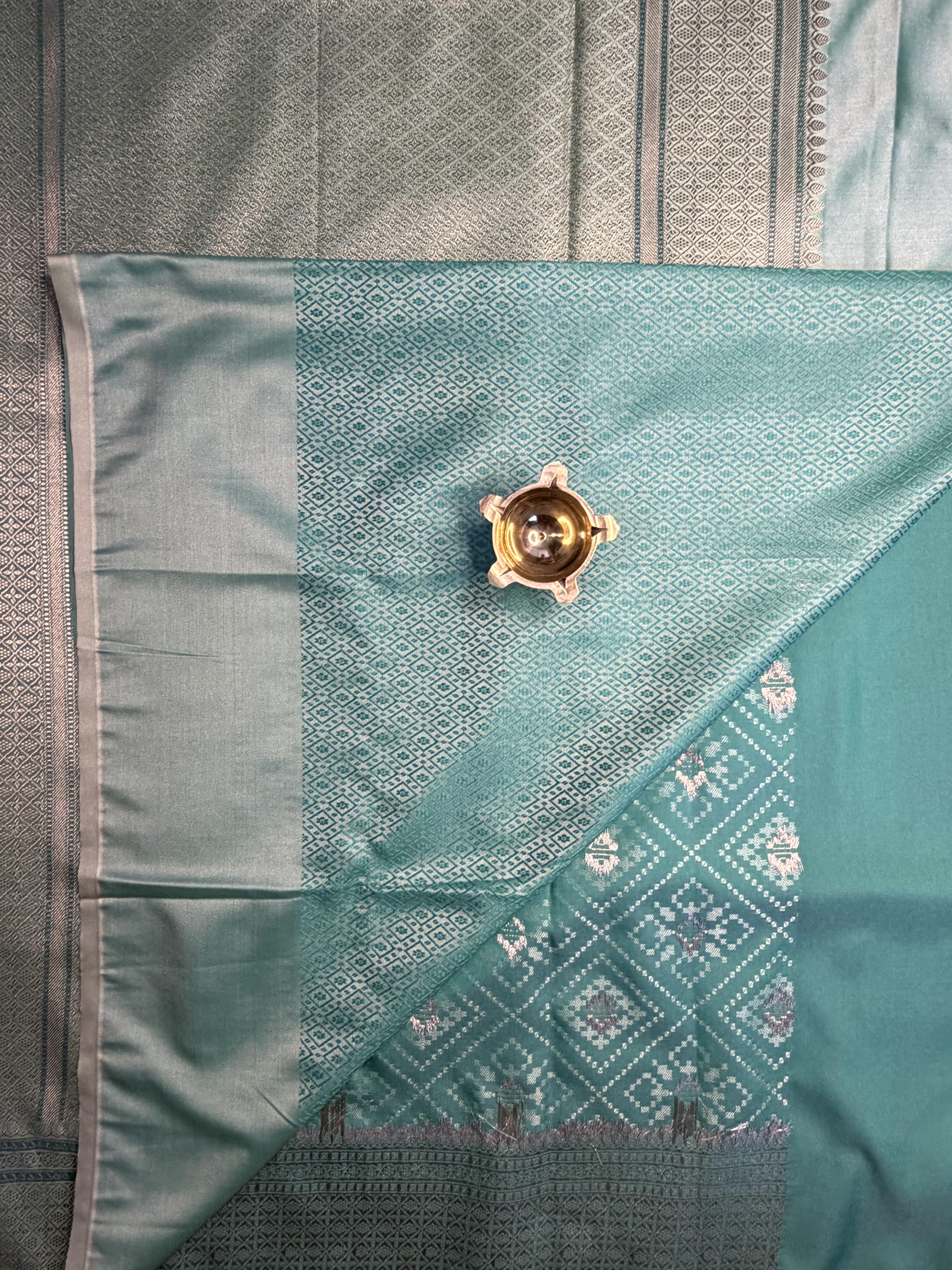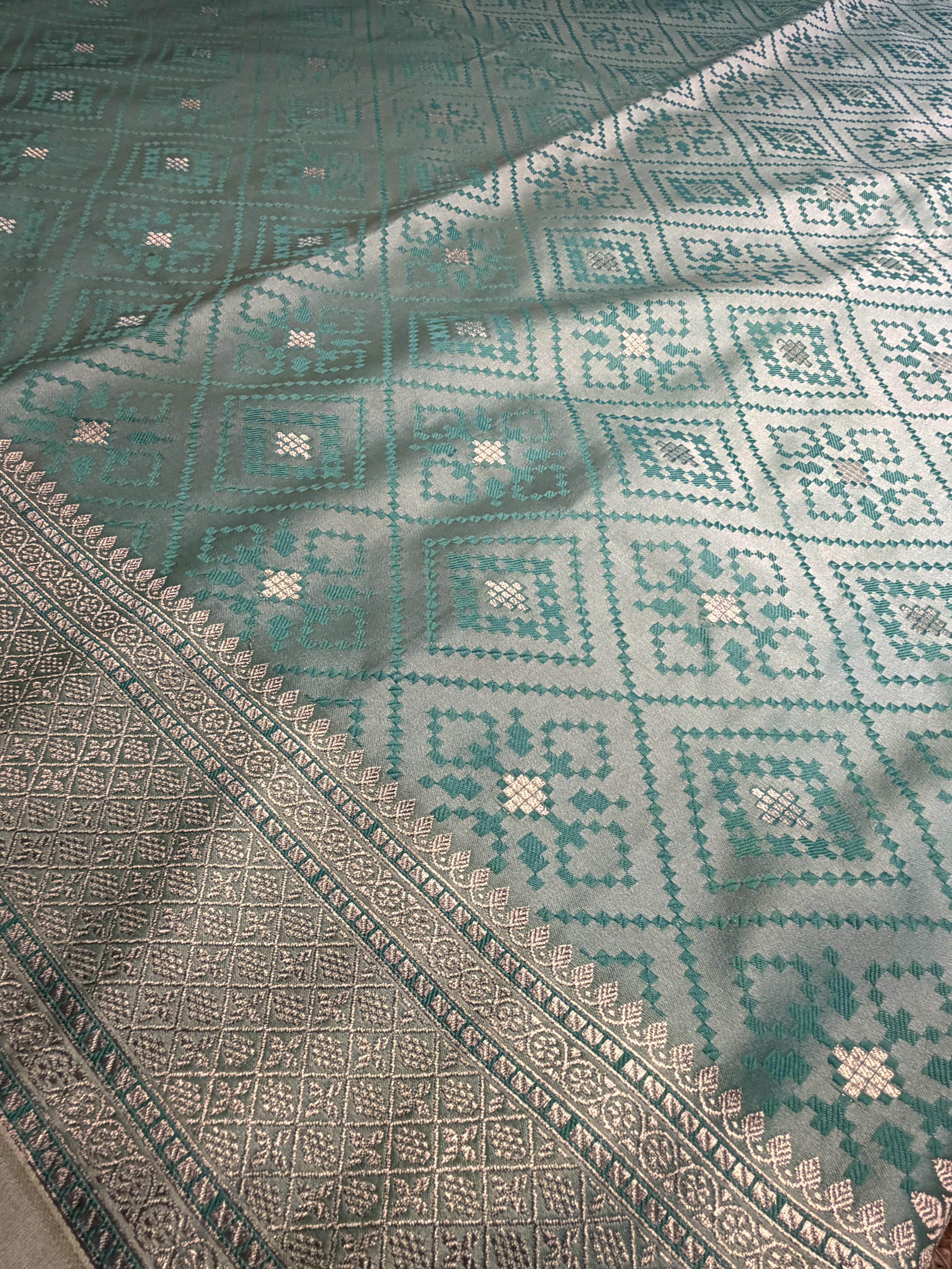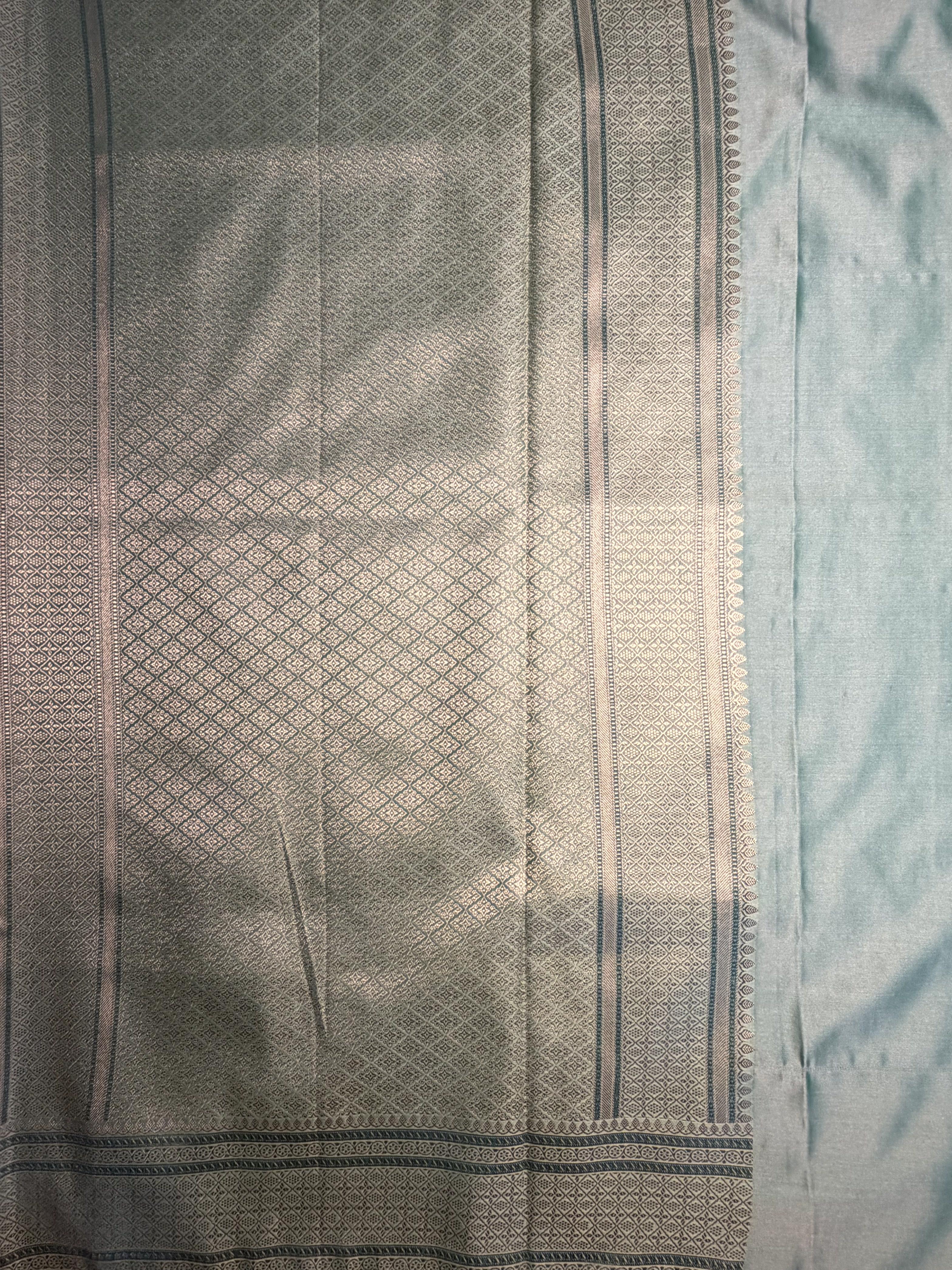 This pista green Benaras saree is beautifully highlighted with silver woven designs along the border and pallu, adding a touch of refined shimmer and traditional craftsmanship. The soothing pastel tone paired with intricate metallic detailing creates a graceful festive look. Perfect for weddings, receptions, and cultural celebrations, this saree exudes timeless charm with a modern, luxurious appeal 💚✨