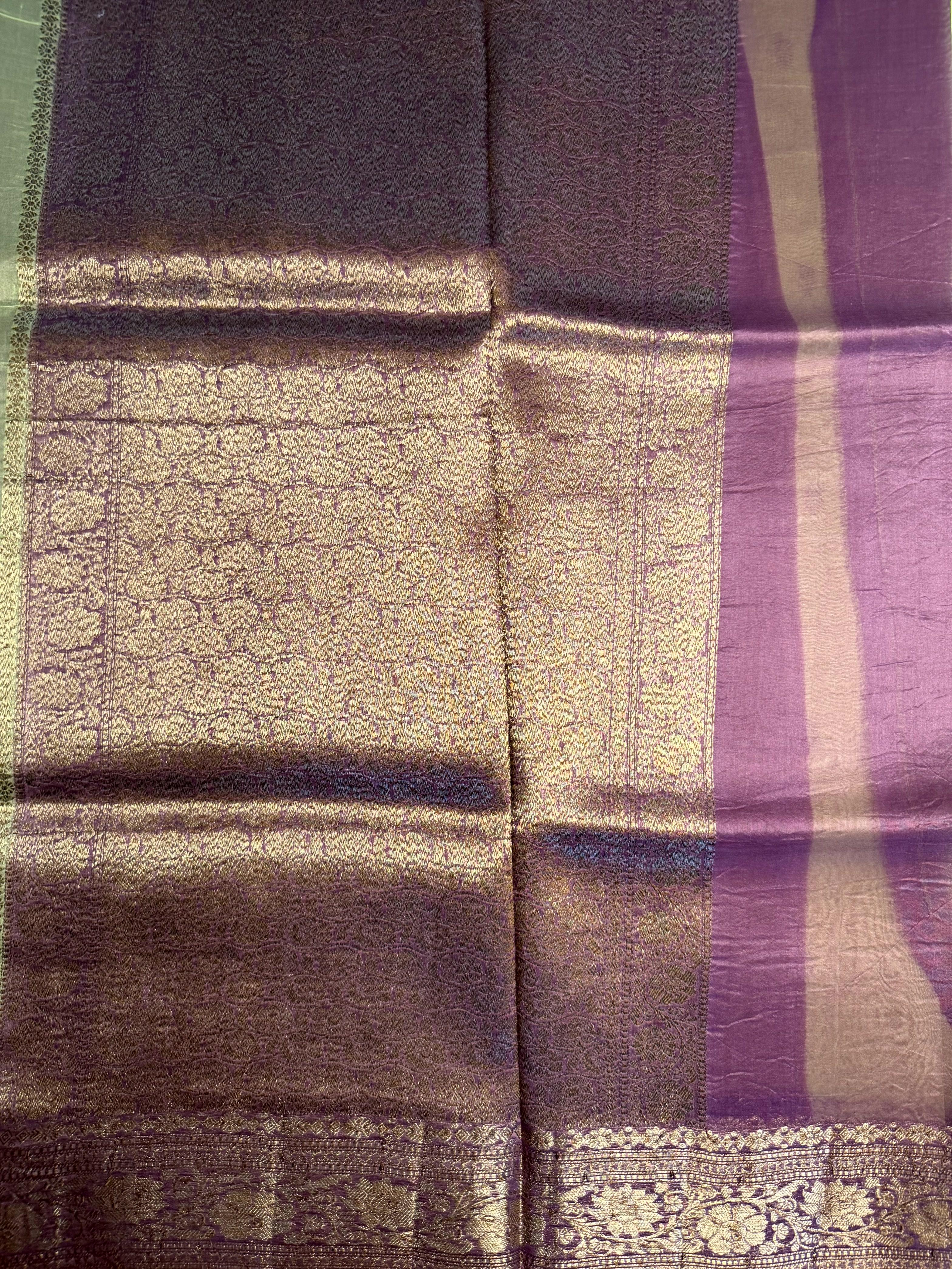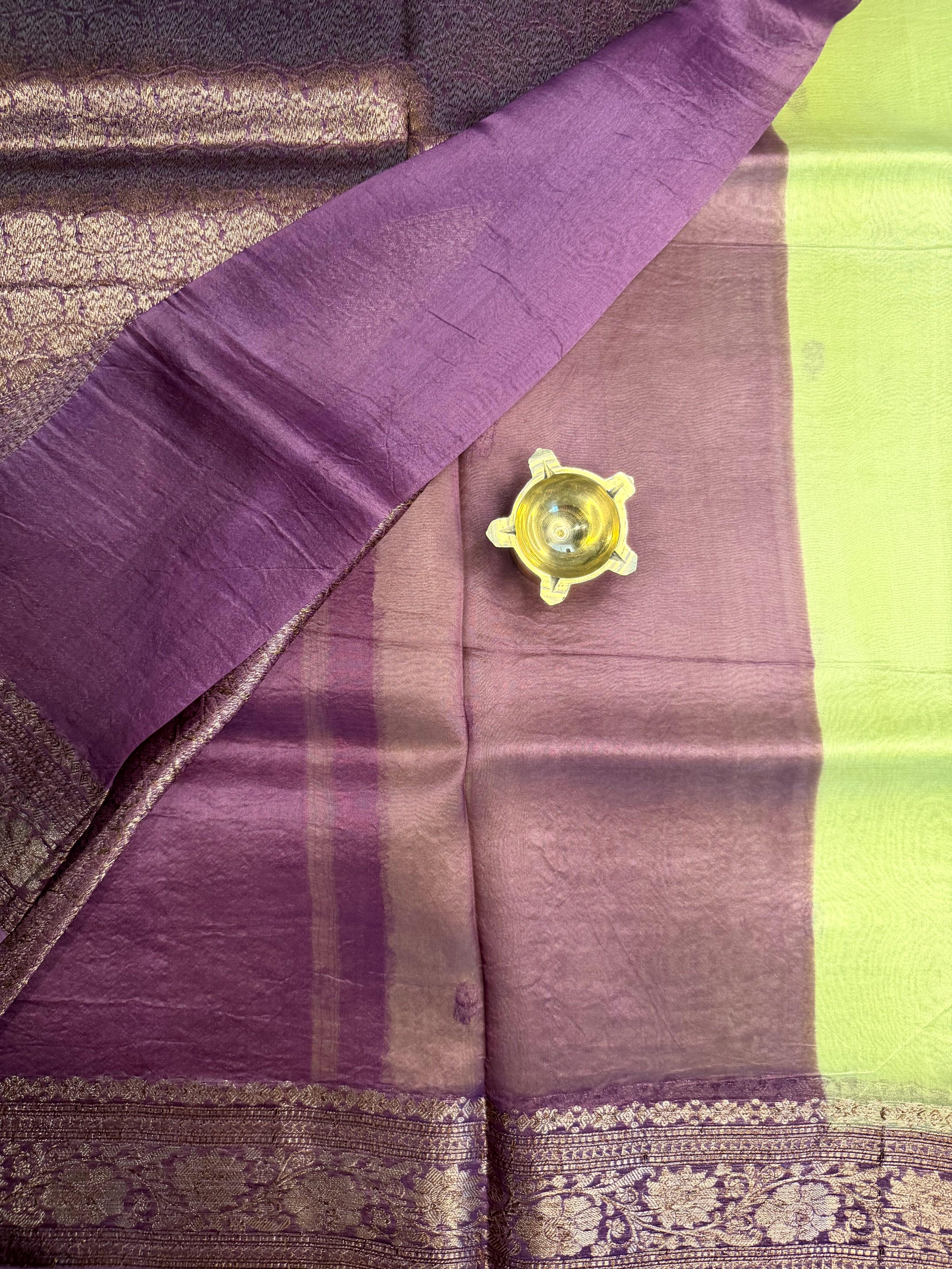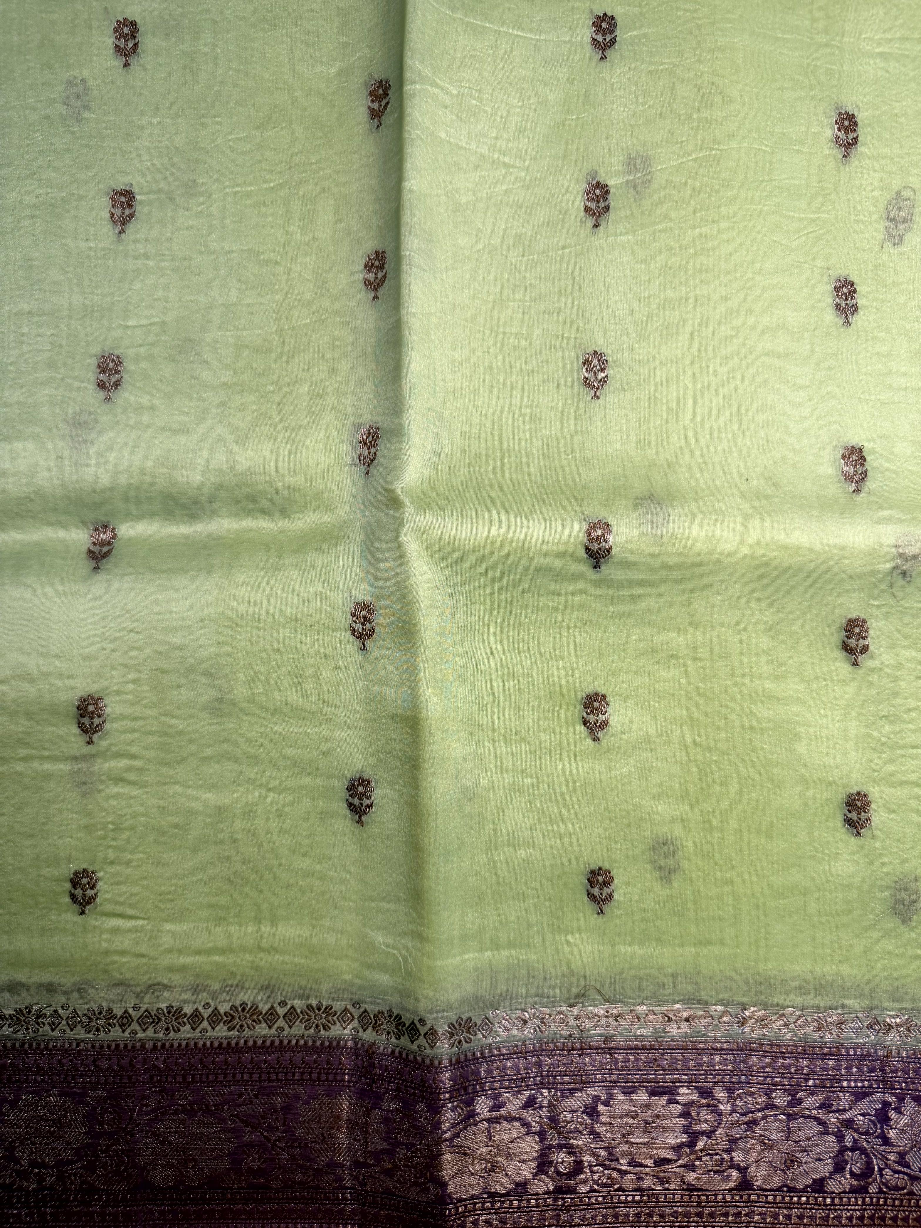 A vision of regal finesse, this pure Kora organza saree shines in serene pista green, paired with a striking pink border that adds a noble contrast. The sheer, feather-light texture allows the drape to glide with aristocratic grace, while the intricately woven antique zari brings a vintage golden luster reminiscent of royal heirlooms. Elegant, poised, and richly detailed โ this masterpiece bridges heritage weaving with contemporary color play, making it the perfect choice for celebrations that call for refined grandeur and timeless sophistication โจ๐๐