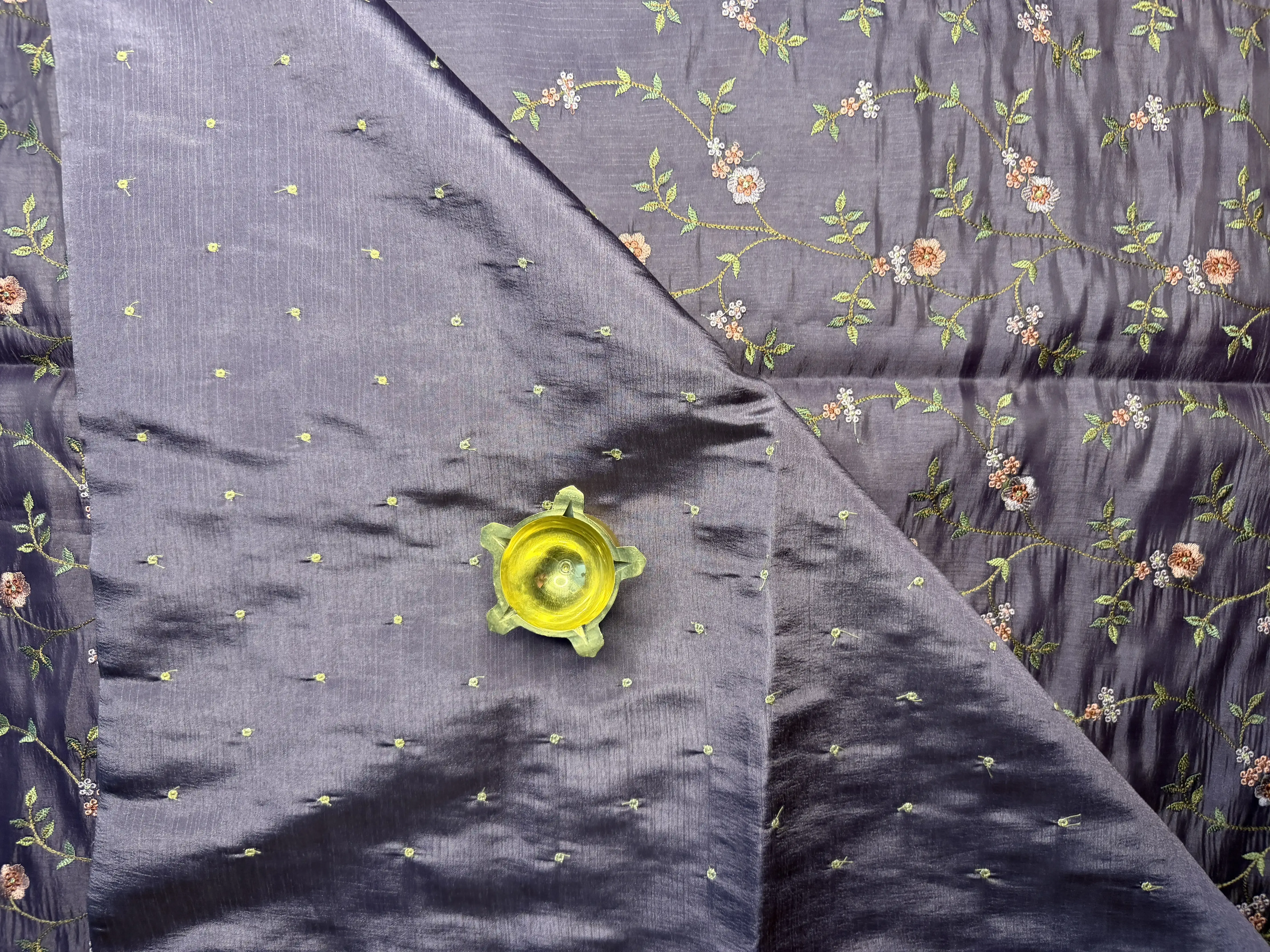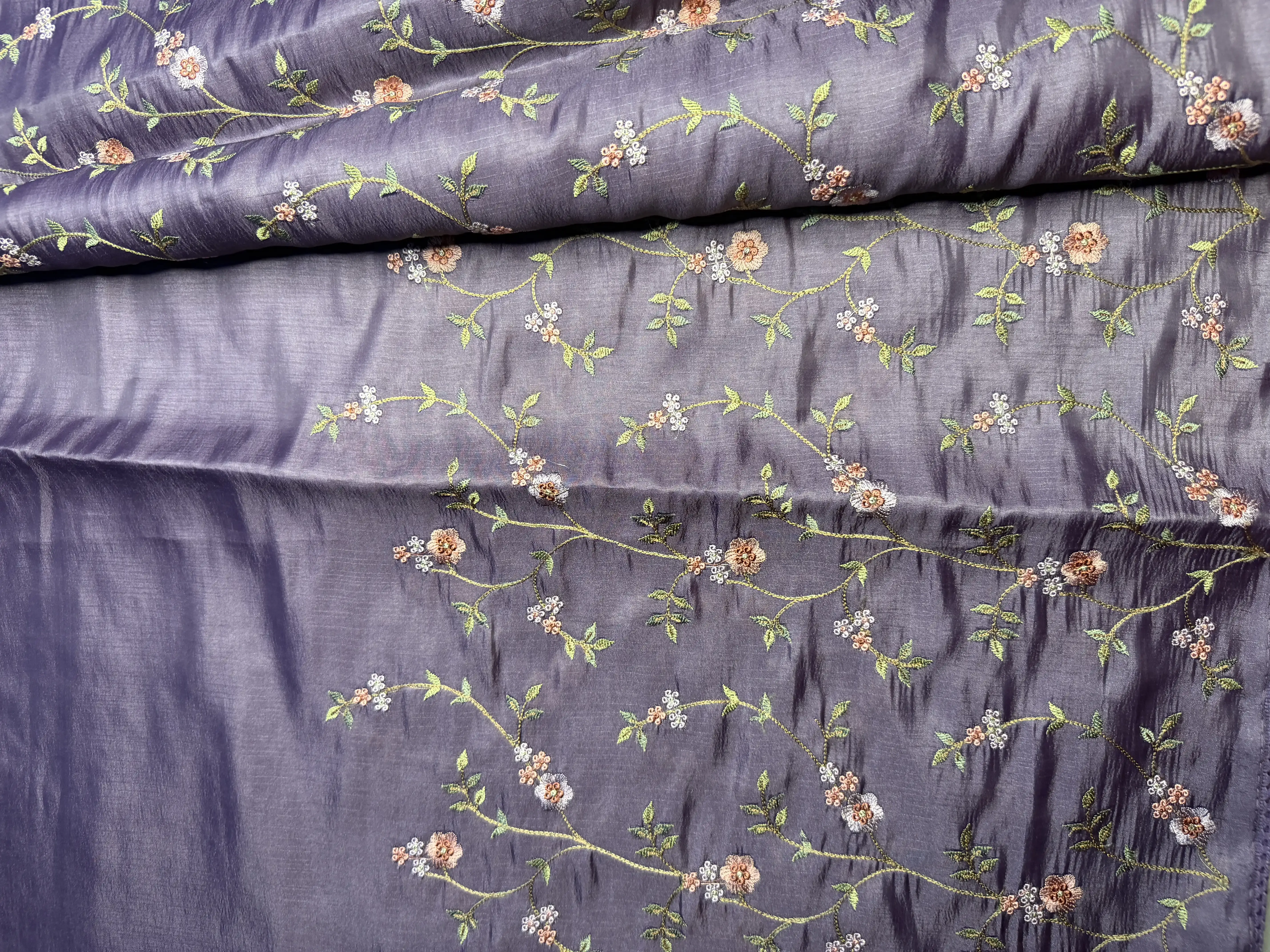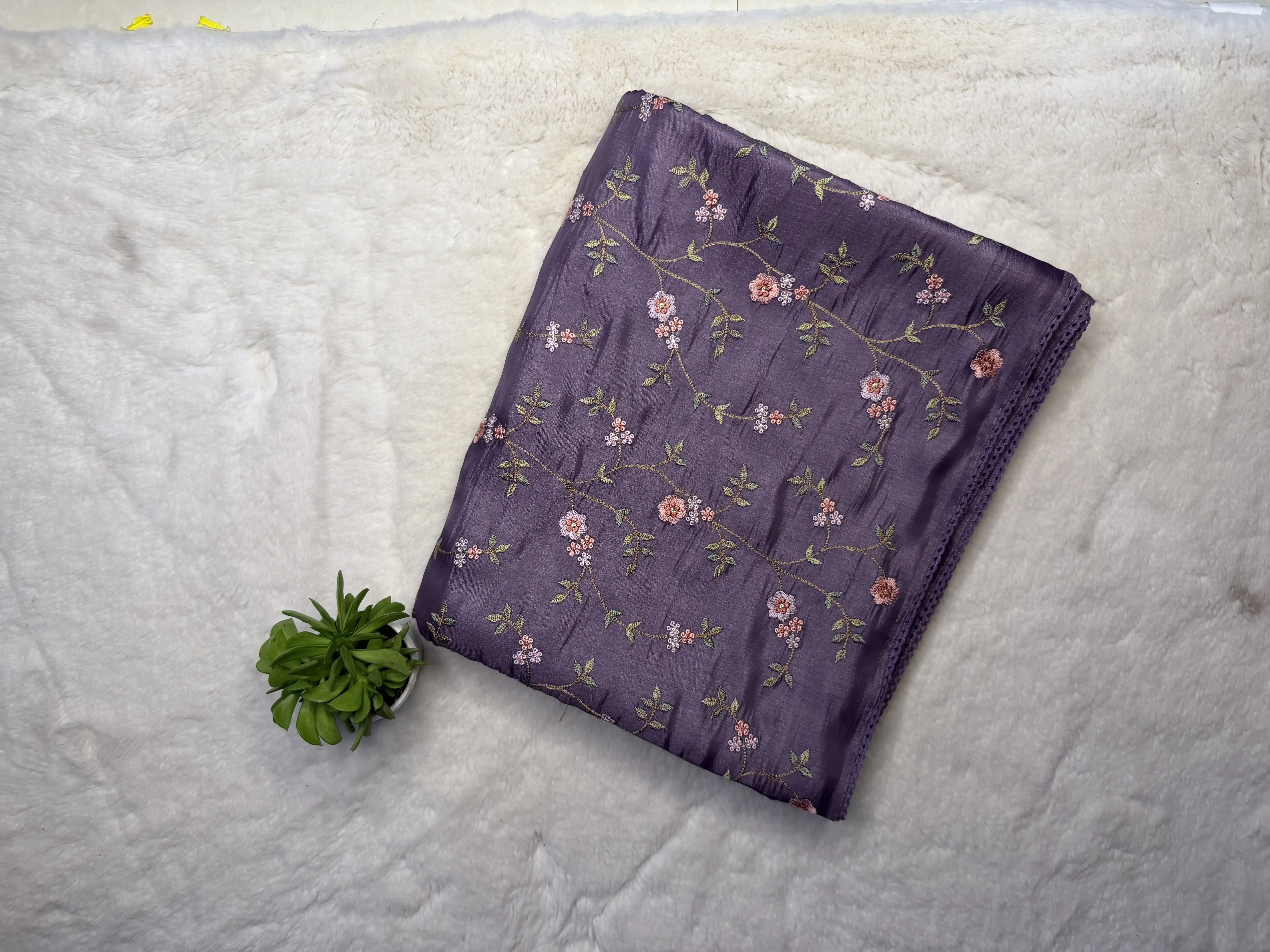 This purple saree is adorned with all-over floral thread work, celebrating fine craftsmanship and timeless elegance. The delicate floral patterns spread across the body add depth and texture, while the rich purple hue lends a regal and sophisticated charm.