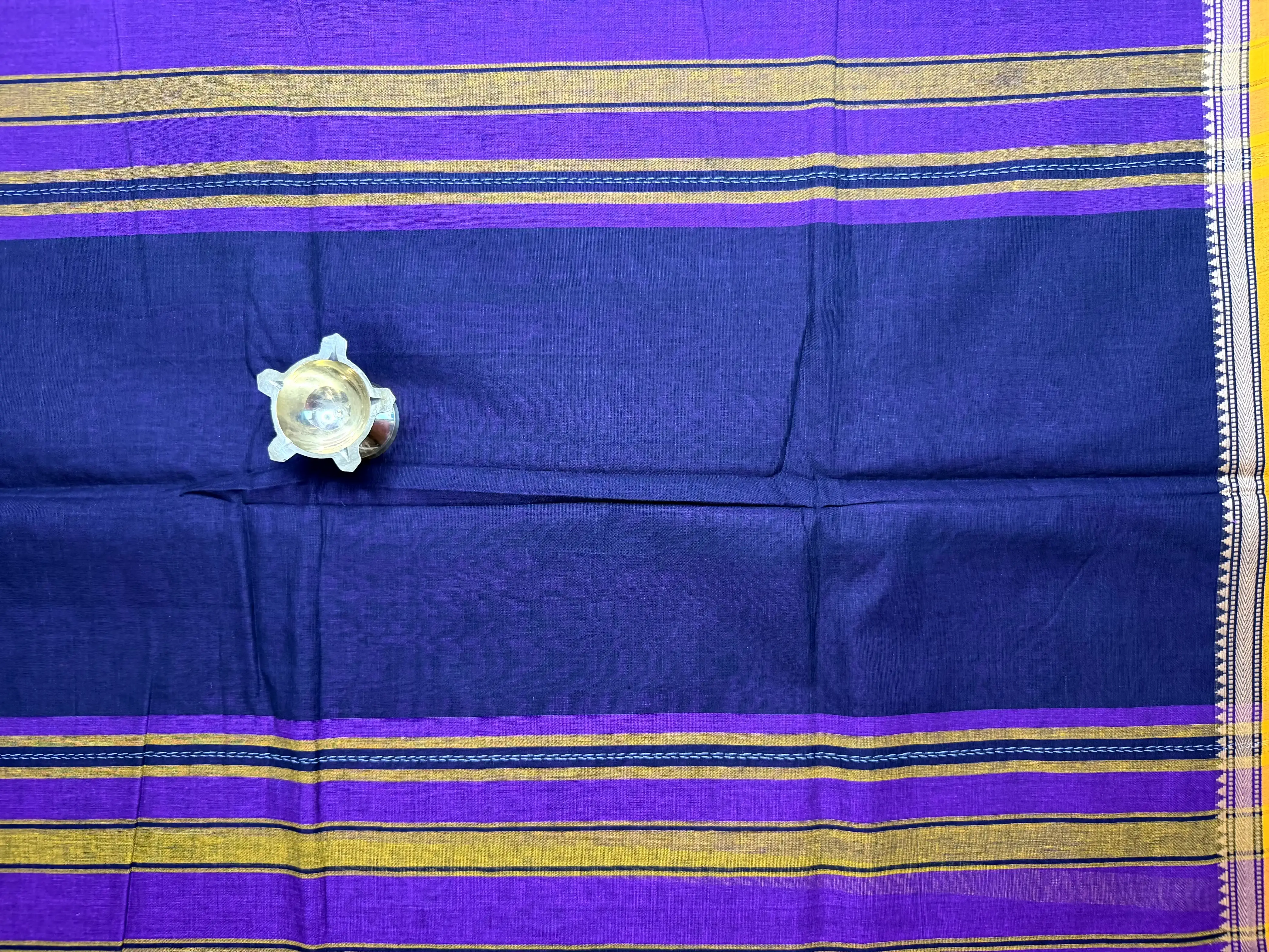 This purple with mustard yellow Dhaniakali cotton saree exudes a bold yet cultured charm. The deep purple drape sets a regal tone, while the mustard yellow border adds a warm, festive pop that enhances the sareeโs character.