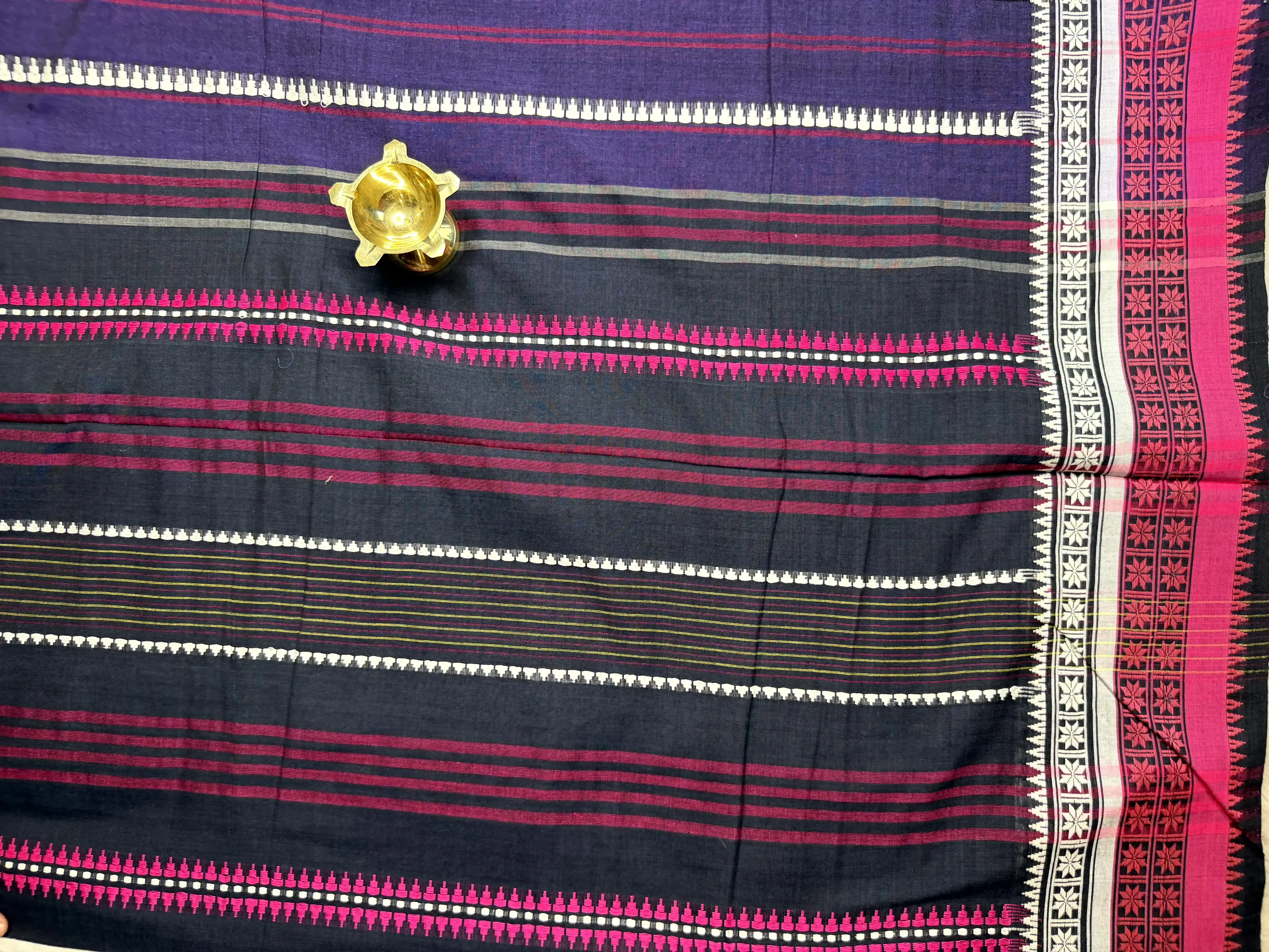 This purple Dhaniakhali cotton saree is beautifully accented with a pink contrast border, creating a striking yet graceful combination. Lightweight and breathable, it’s perfect for festive occasions, cultural gatherings, and everyday ethnic wear — a timeless drape that blends rich hues with classic craftsmanship 💜🌸
