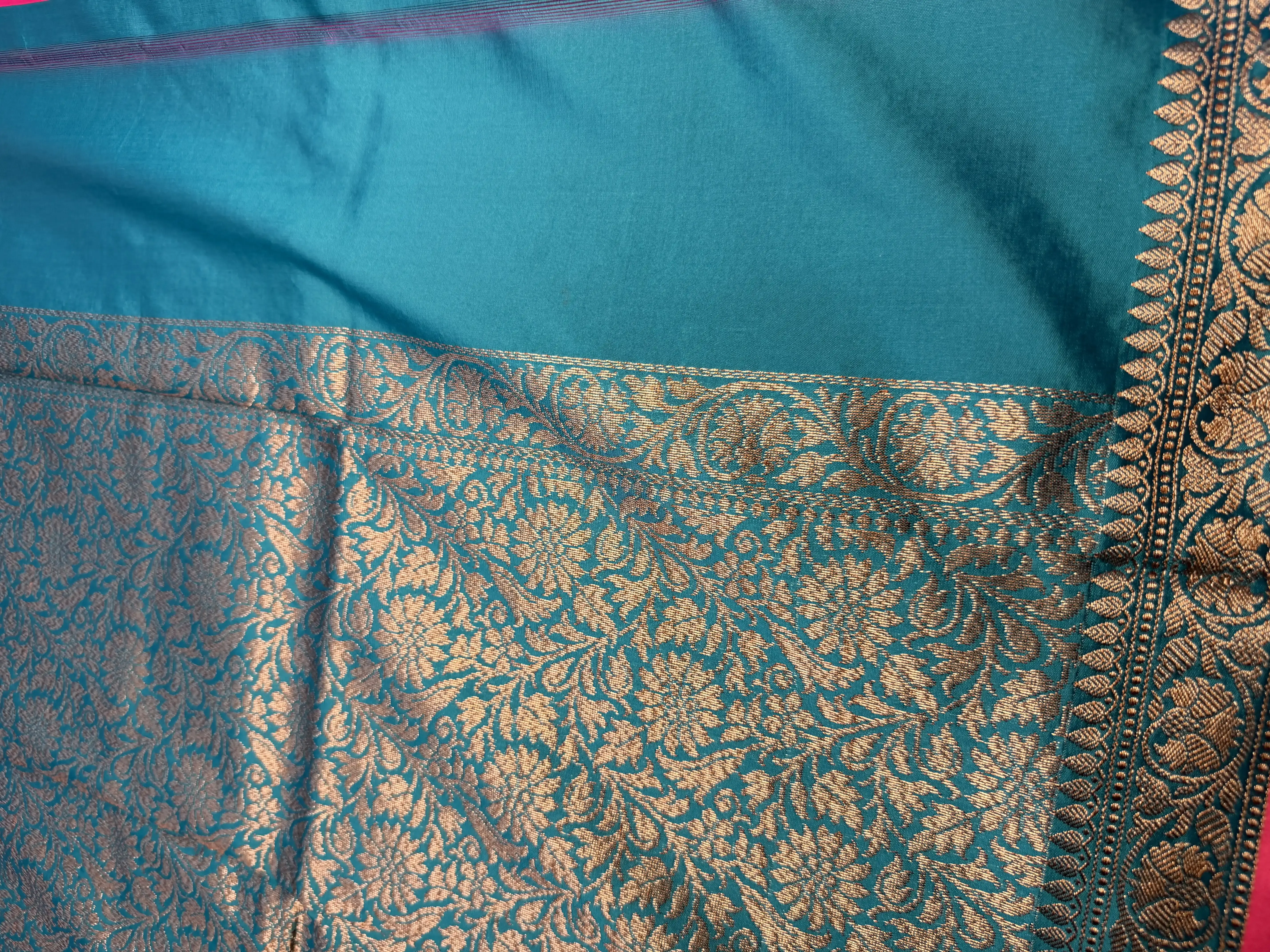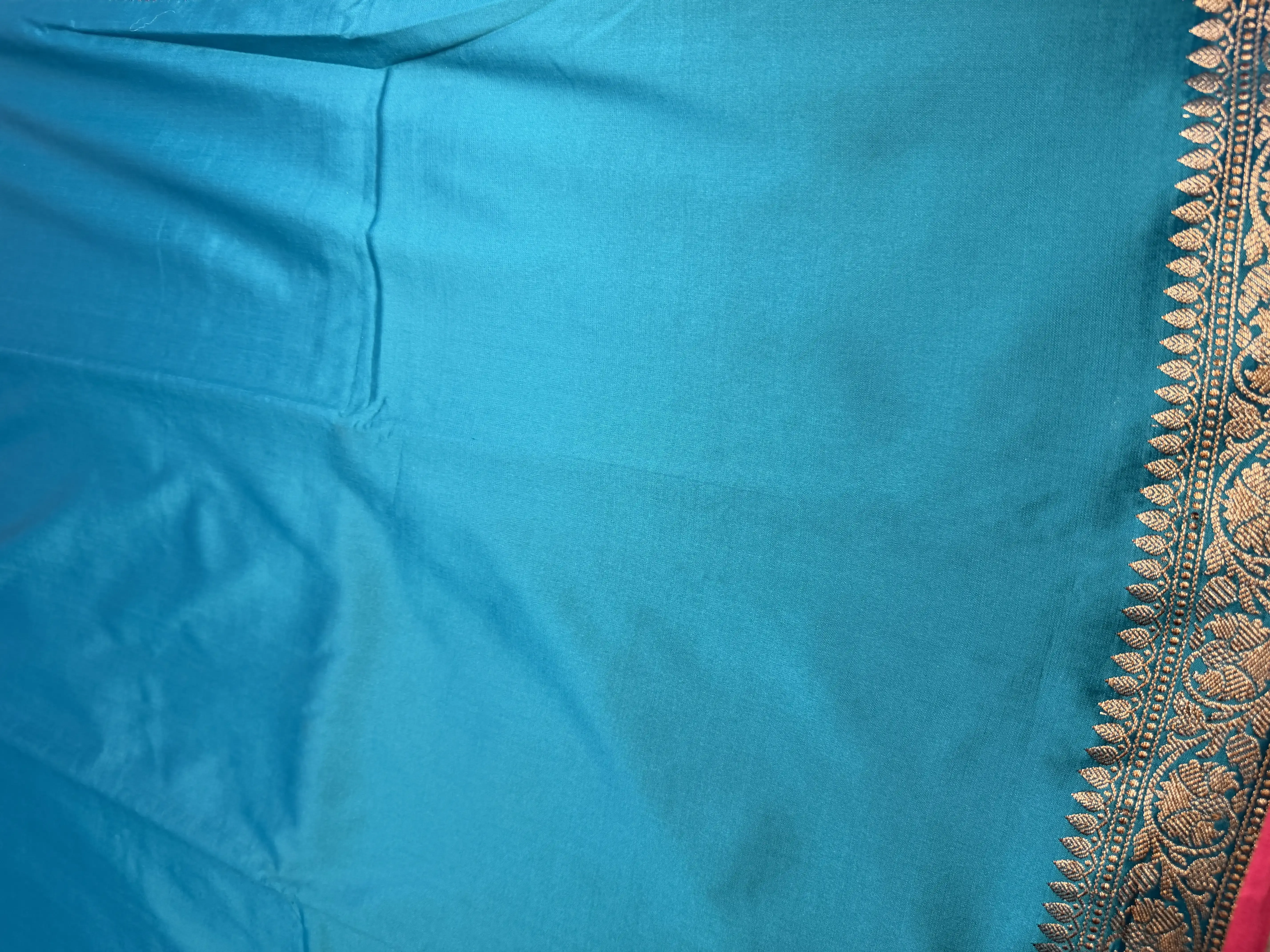 This Rama green semi-Banaras saree features a plain, refined body that beautifully highlights the fabric’s soft sheen and effortless drape. The look is elevated by a richly woven pallu, reflecting the timeless artistry and heritage of Banaras craftsmanship.