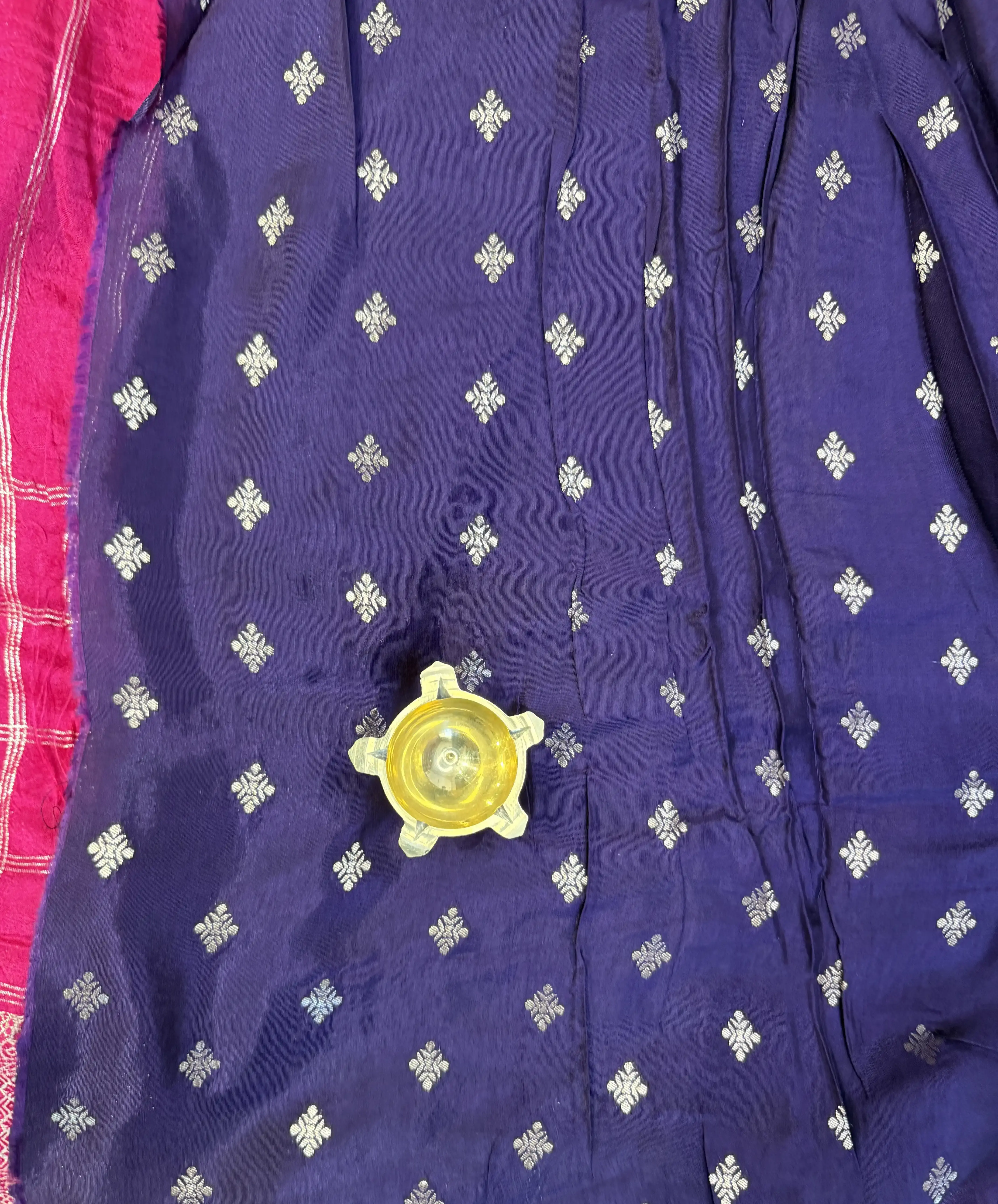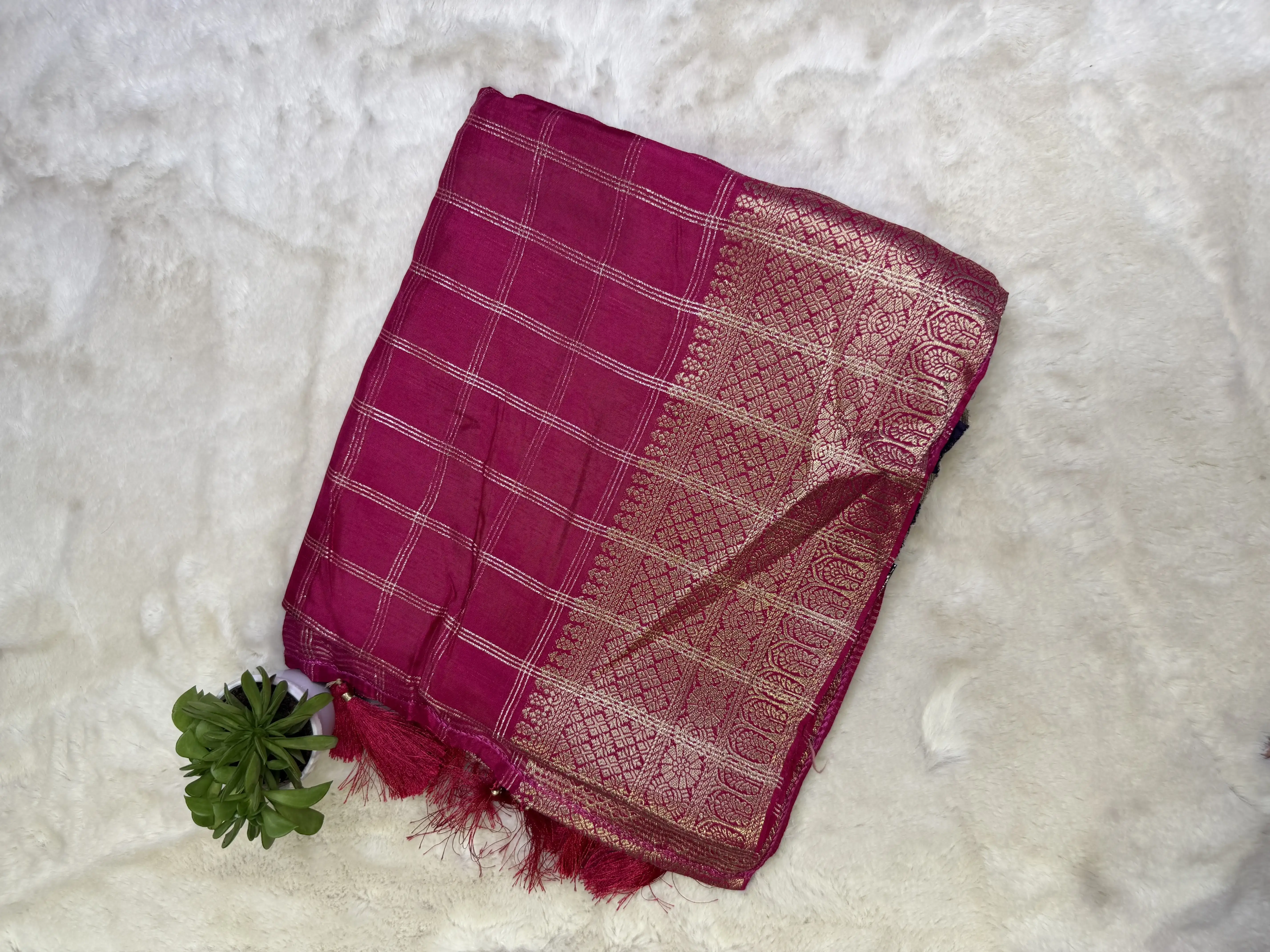 This Rani Pink Fancy Saree features bold big checks that add a striking yet graceful appeal. The rich, lively hue beautifully complements the textured Semi Tussar fabric, creating a look that’s festive, stylish, and effortlessly elegant.