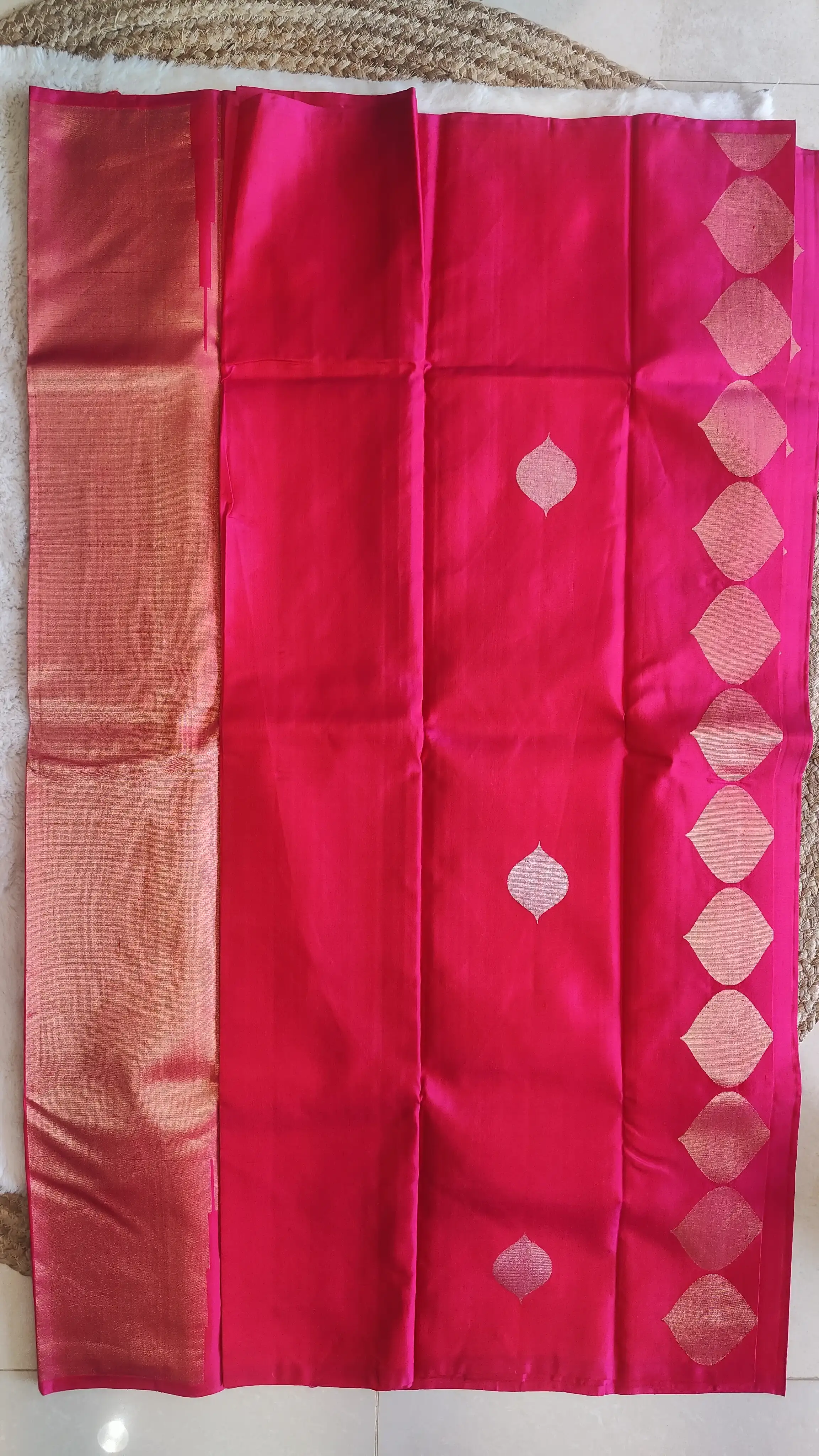 Rani pink contemporary with gold and silver zari design silk Saree