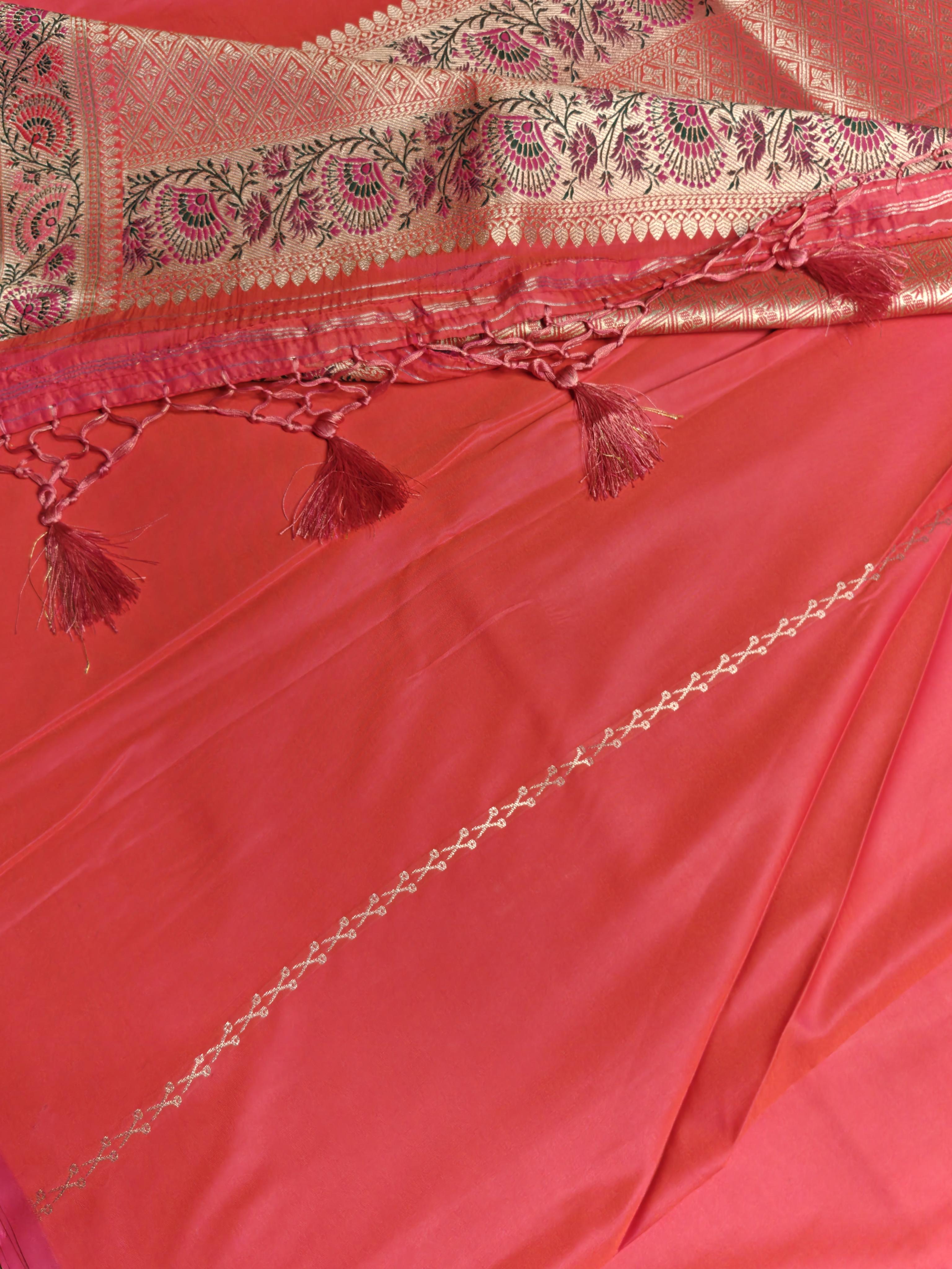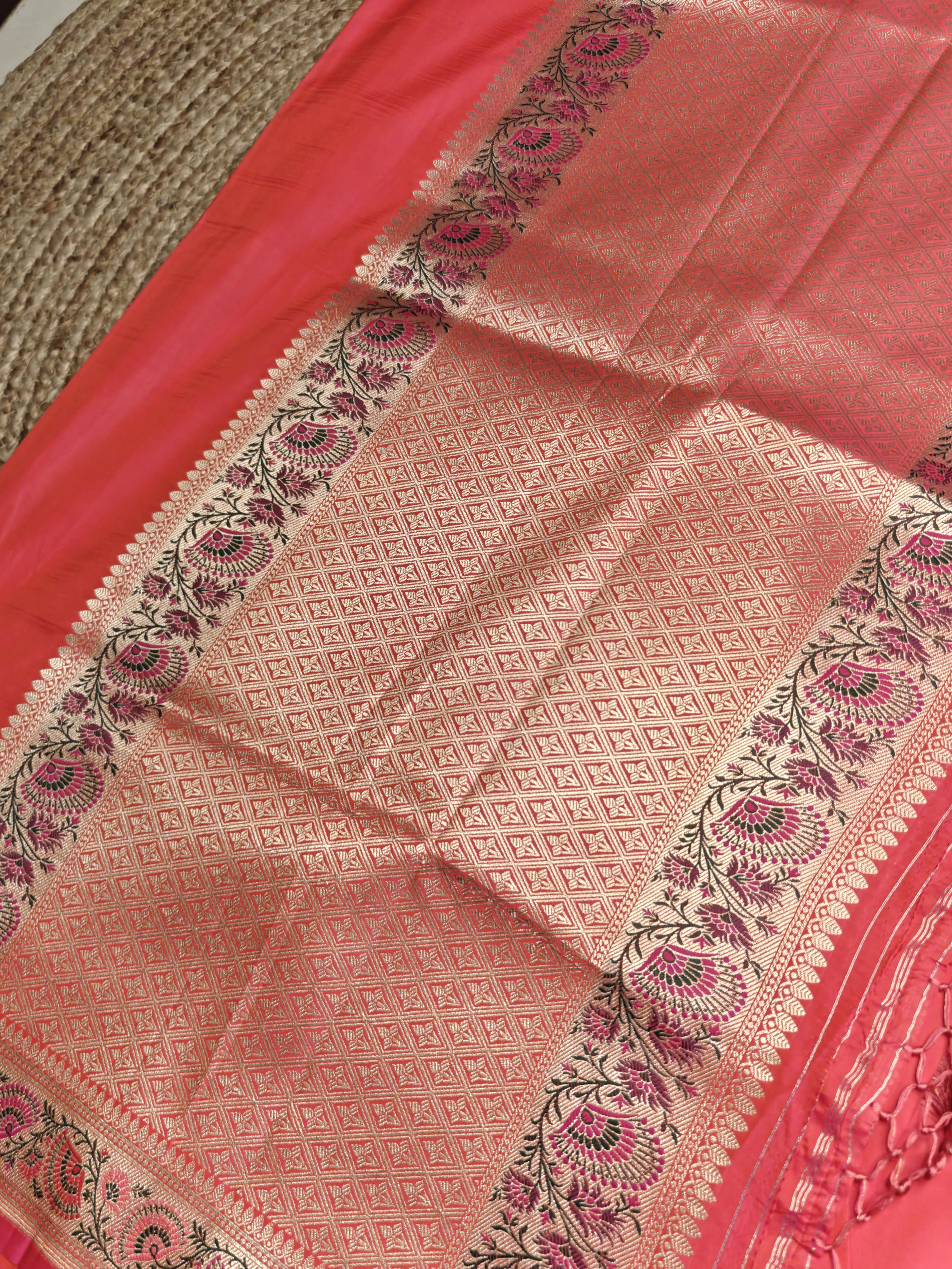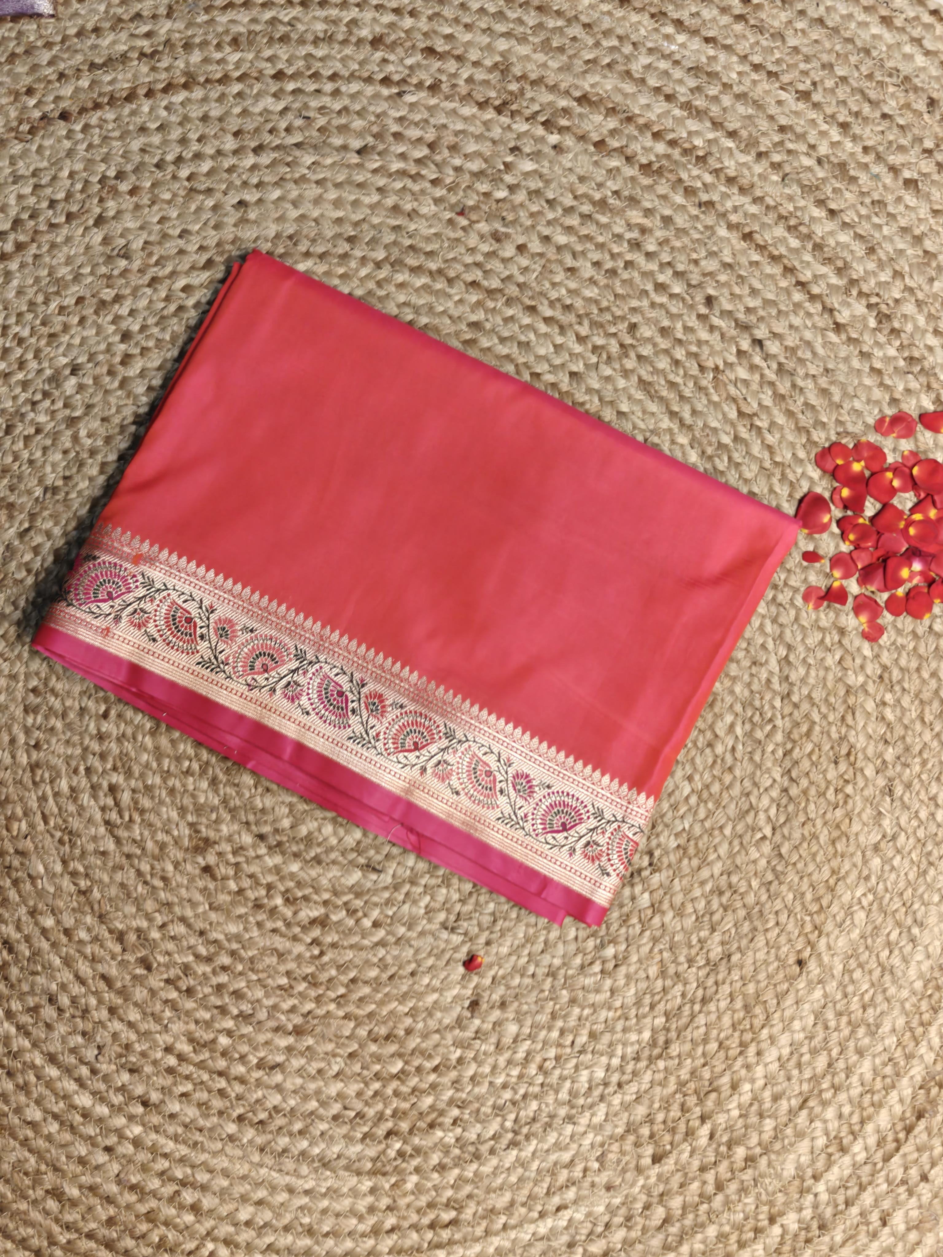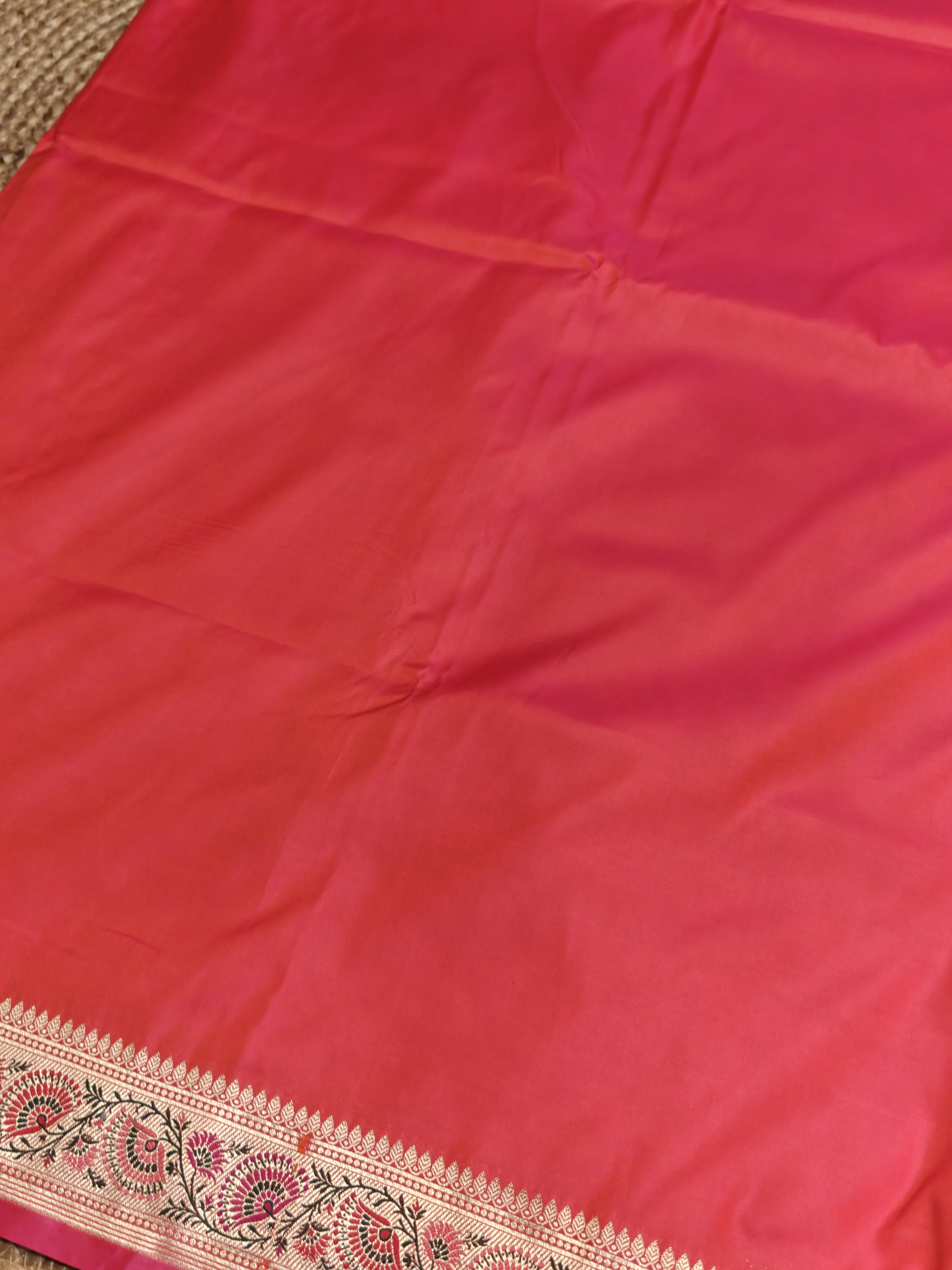 This stunning Rani pink Banarasi silk saree features a plain, elegant body that beautifully highlights the opulence of its rich Meenakari work border. The look is elevated with a grand, intricately woven pallu, showcasing classic Banaras craftsmanship at its finest. Perfect for weddings, festive celebrations, and heirloom collections, this saree is a true celebration of regal color, intricate detailing, and traditional luxury 💖✨👑