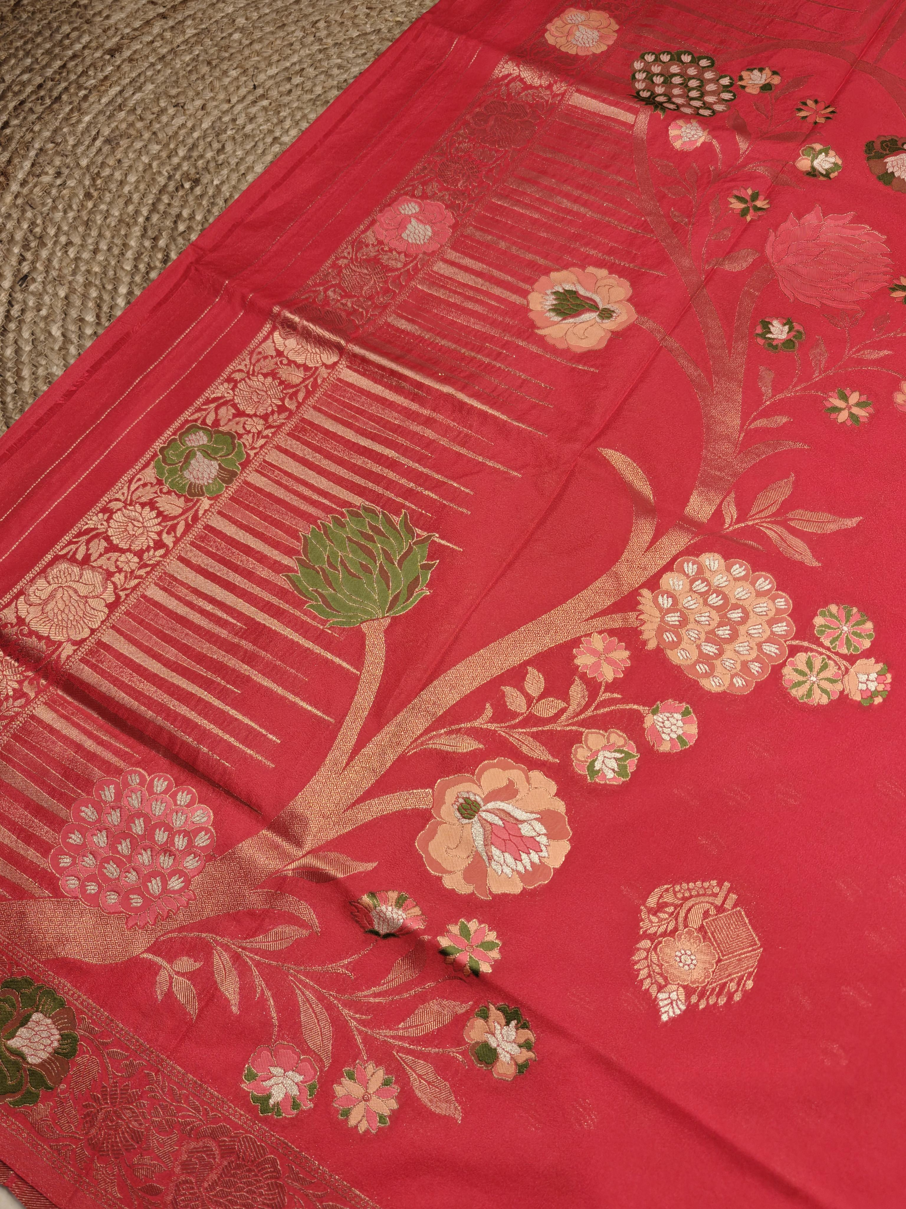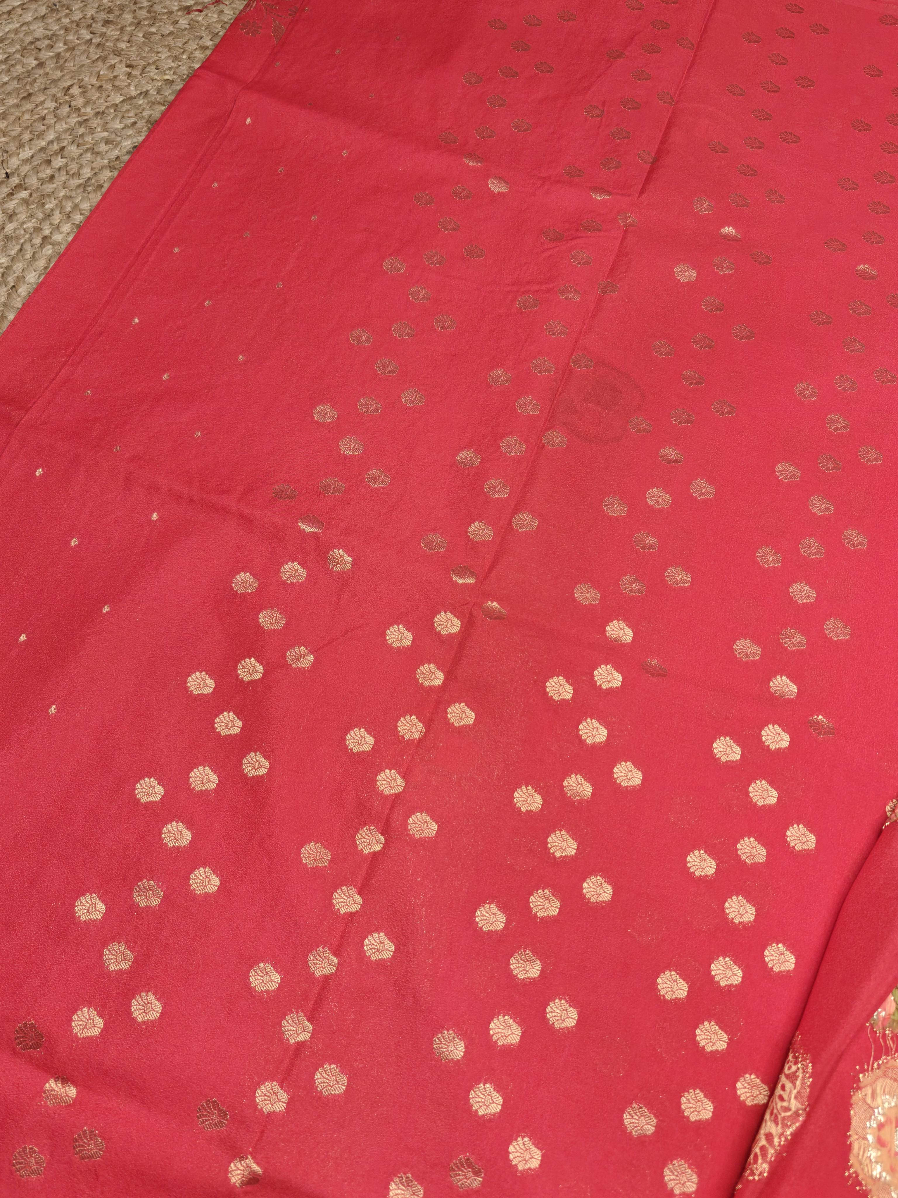 This striking red Banarasi silk saree features a contemporary design woven across the body, offering a fresh, modern take on classic Banaras artistry. The look is elevated with a richly crafted border and a grand pallu, adding depth, opulence, and festive grandeur. Perfect for weddings, receptions, and statement celebrations, this saree is where contemporary elegance meets timeless luxury ❤️✨👑