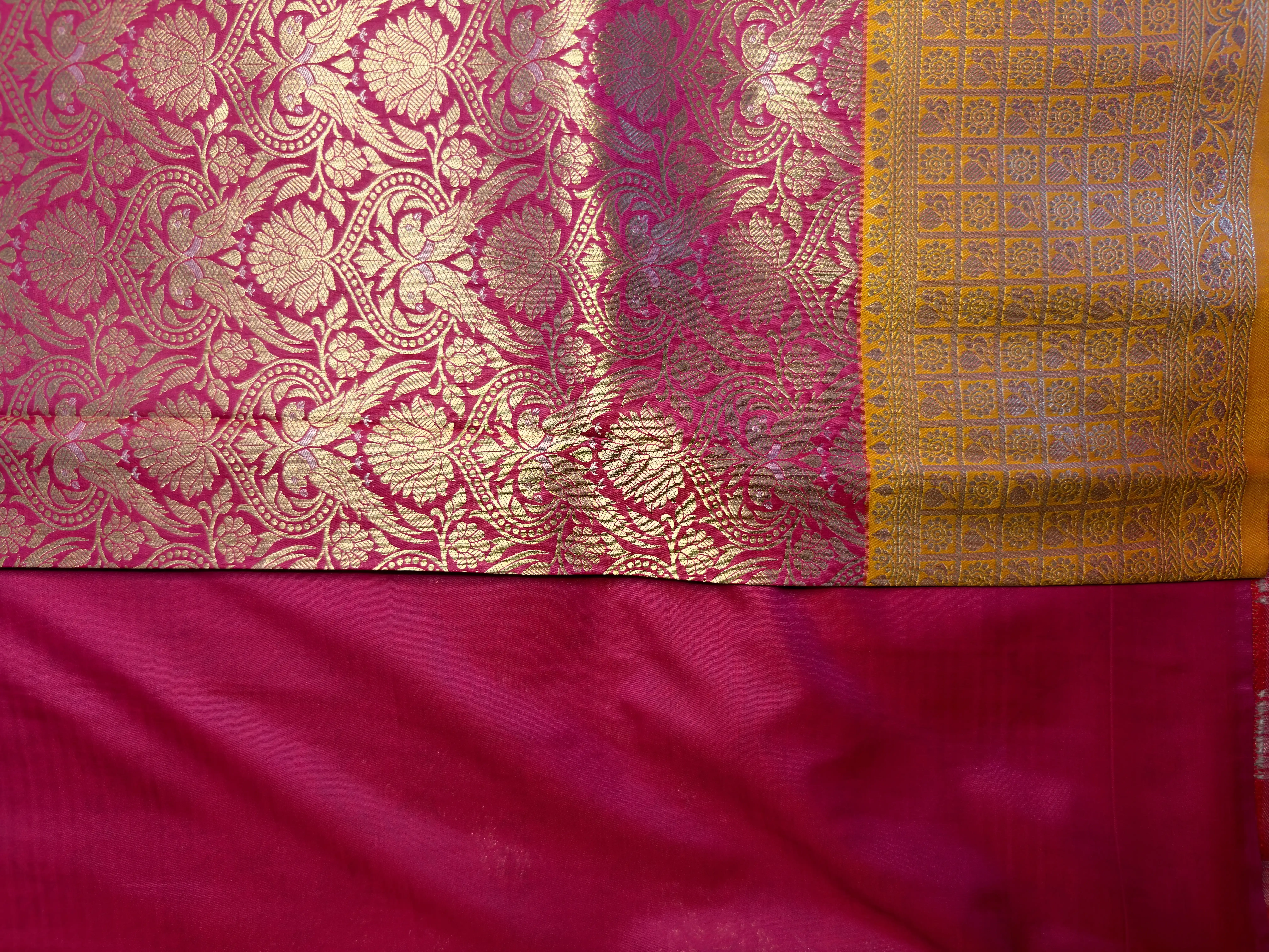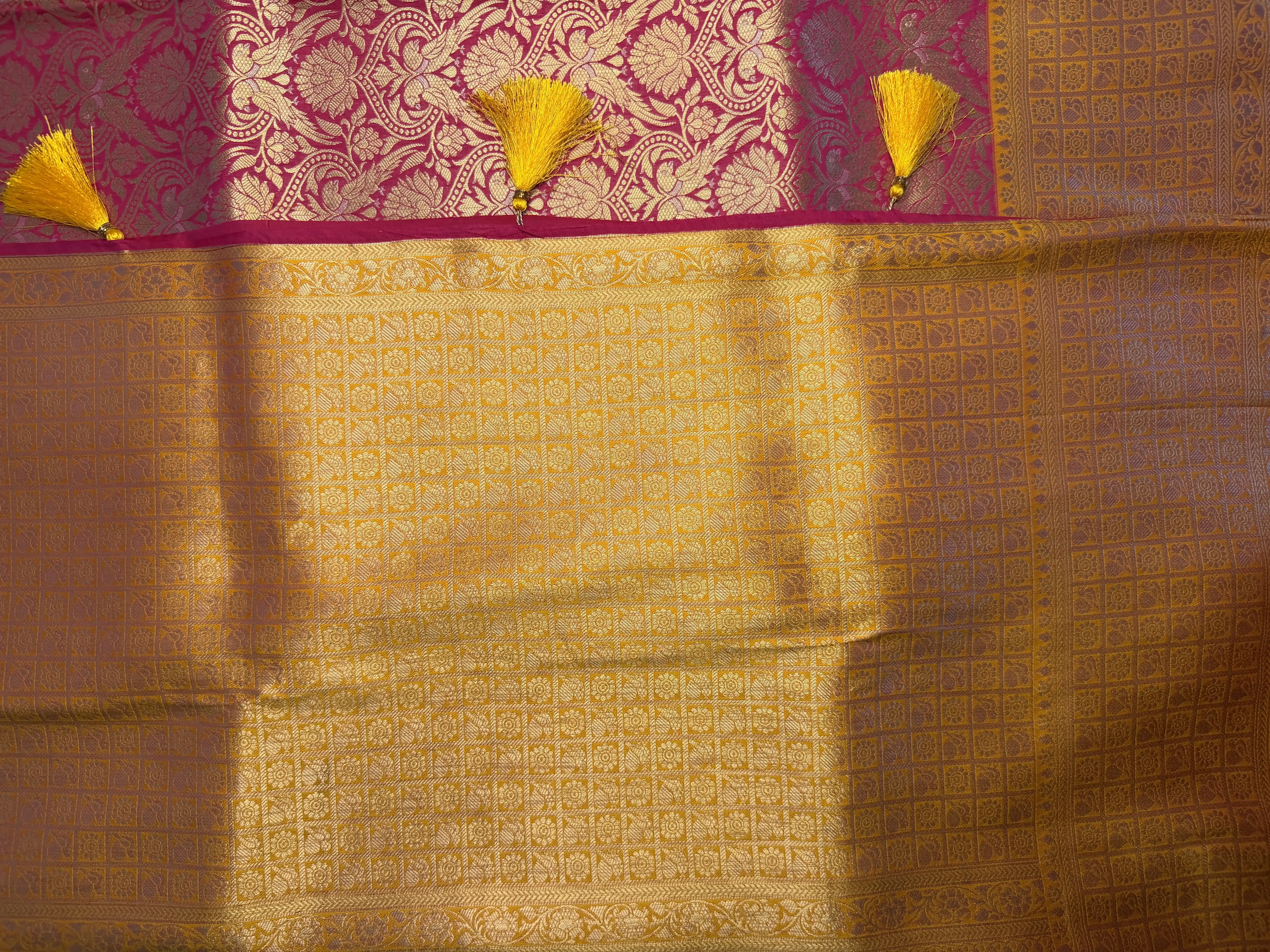 This red Benaras semi silk saree, accented with a bright yellow border, exudes festive elegance and timeless beauty—perfect for making a graceful statement at any celebration. ❤️💛