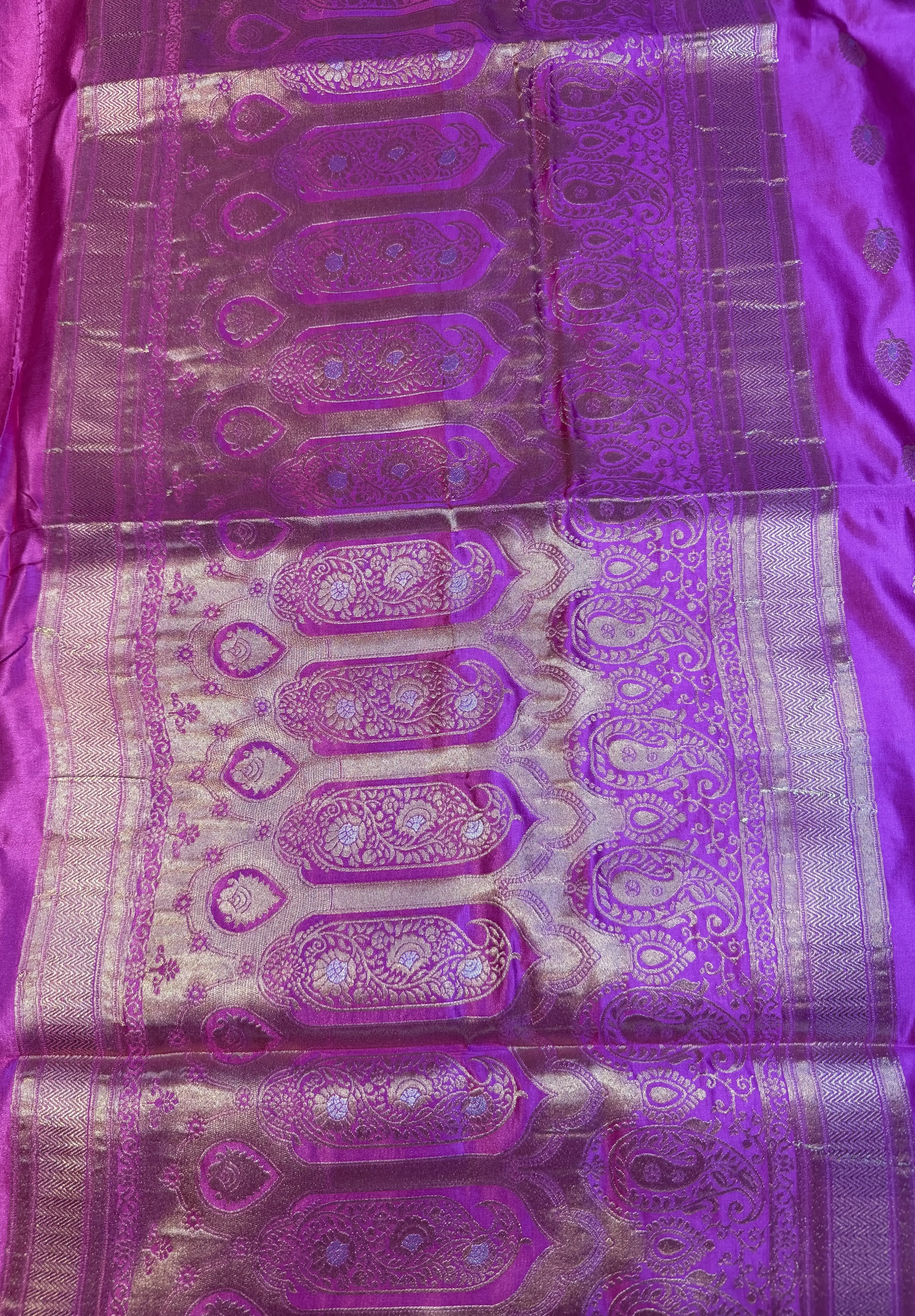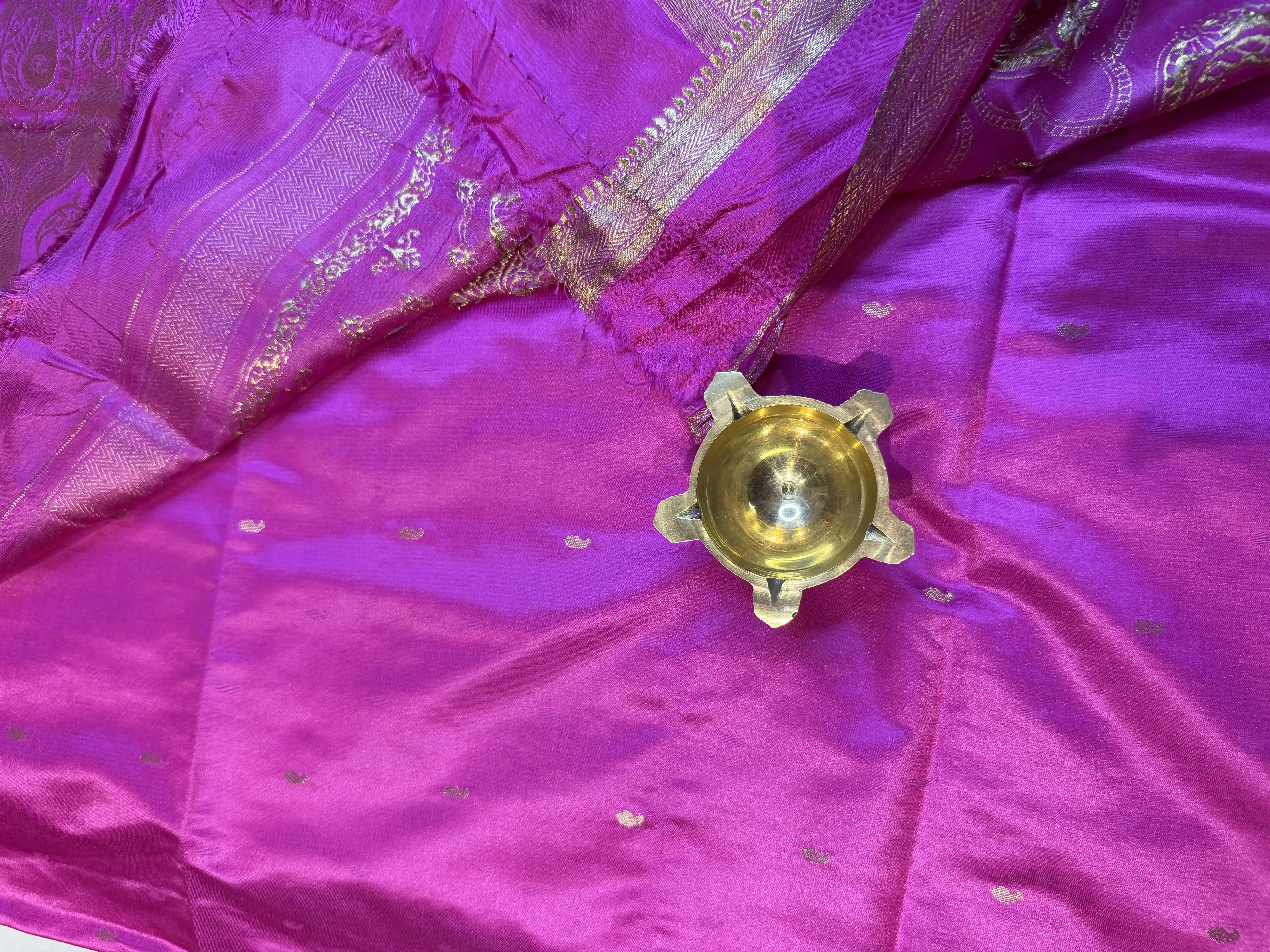This Rose Pink Semi Crepe saree is beautifully highlighted with a rich bentex border and delicate buttas scattered across the body. The smooth, flowy texture adds effortless grace, while the subtle detailing brings a festive charm.