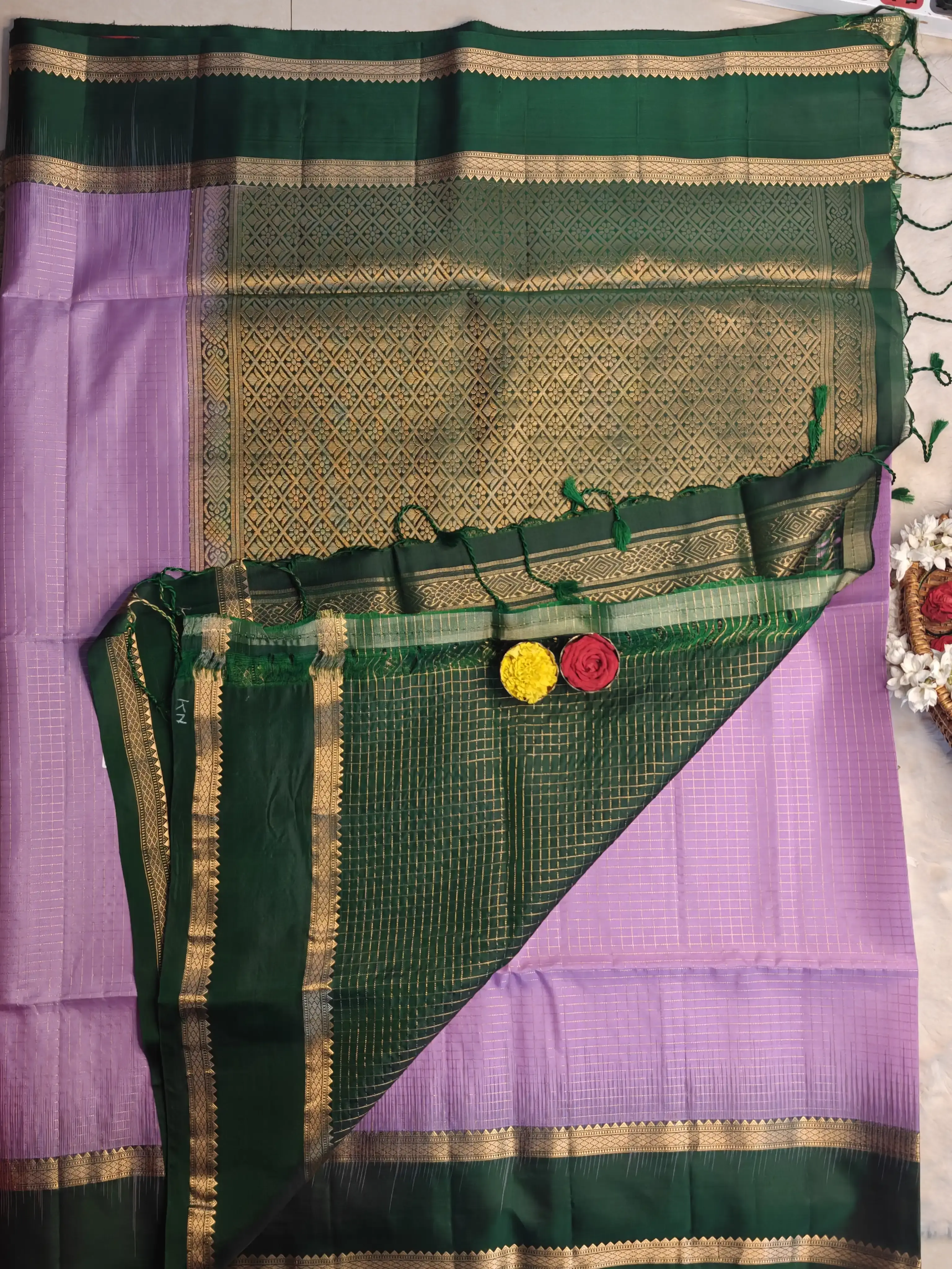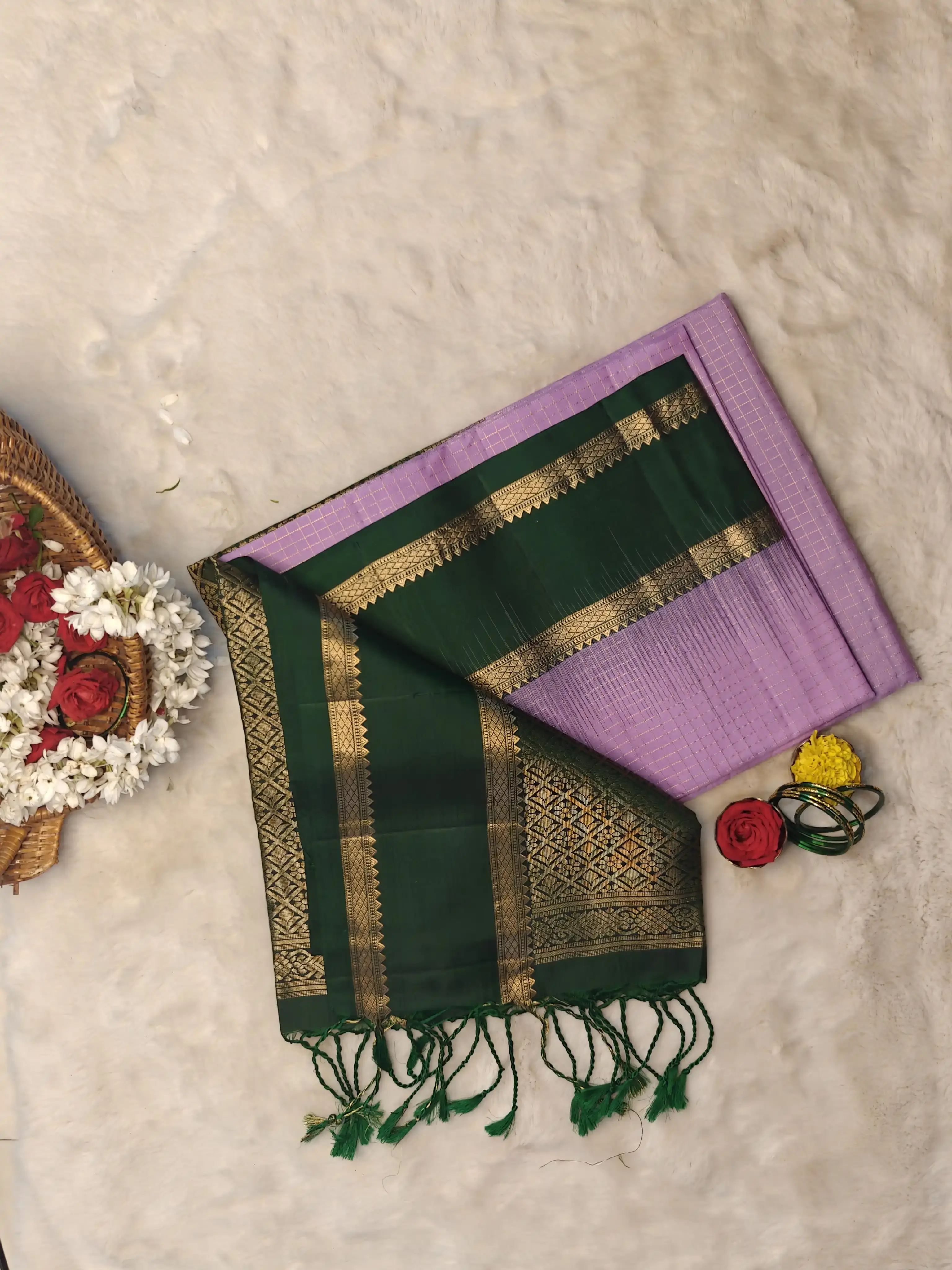 Add timeless charm with a refreshing contrast to your wardrobe with our Rose Pink Checks Soft Silk Saree featuring a rich Green Bentex Border. The graceful rose pink base adorned with classic checks brings a perfect balance of tradition and contemporary elegance, making it a standout choice for every special occasion.