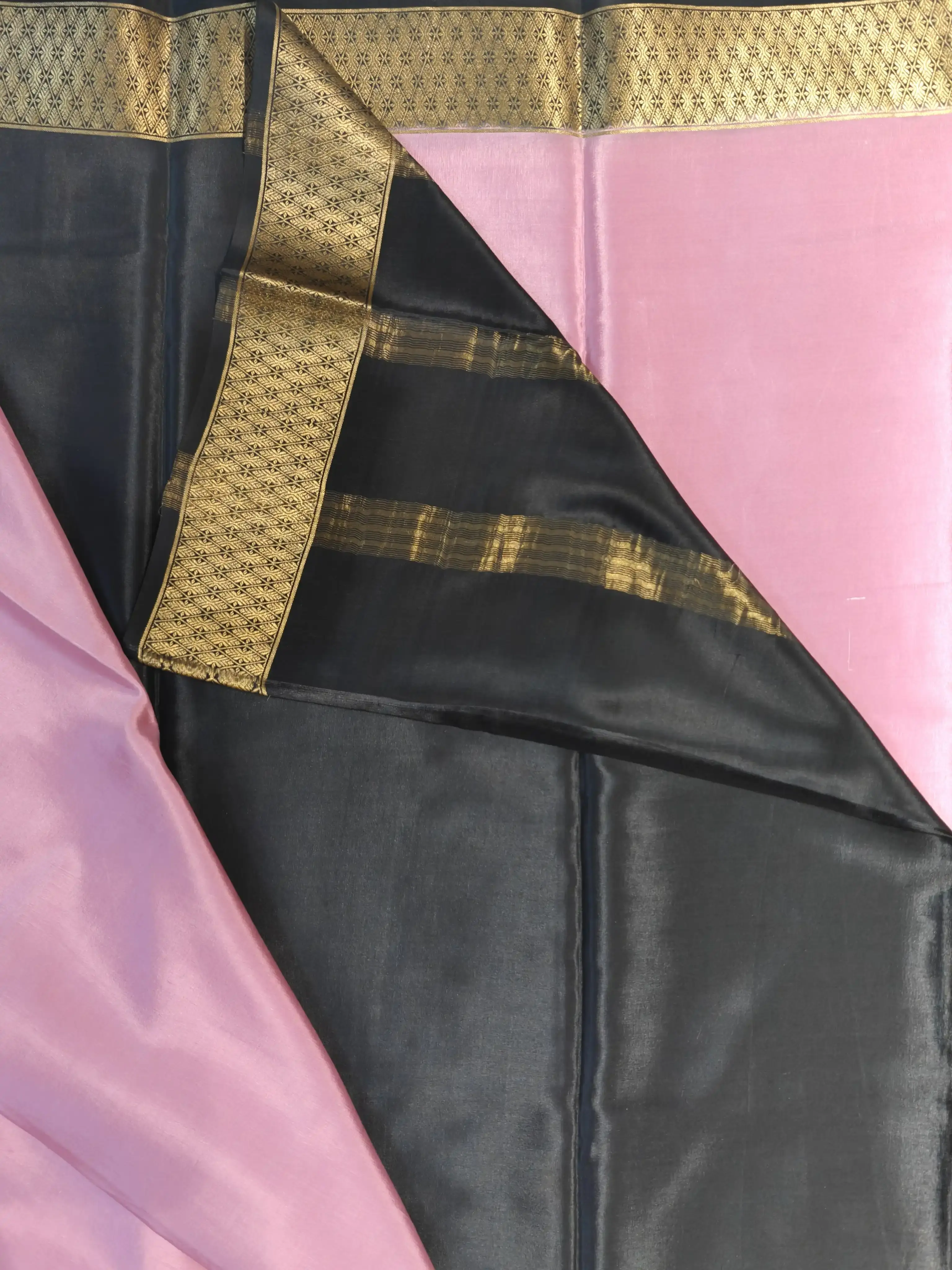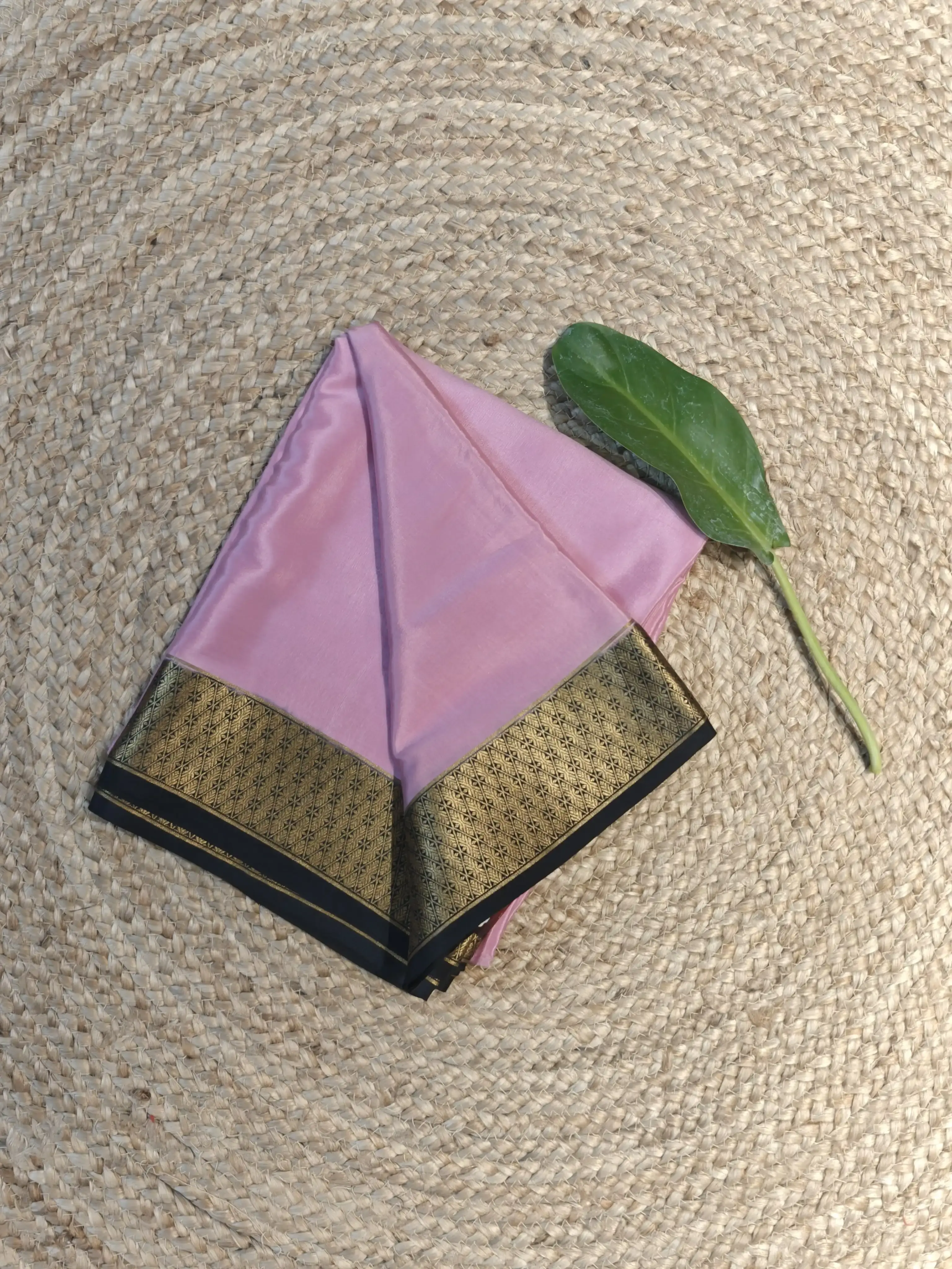 An elegant rose pink plain saree crafted from pure Crepe Mysore silk (120 GSM), designed for fluid drape and effortless sophistication. The smooth, lustrous body is beautifully contrasted with a bold black border, adding definition and timeless appeal.