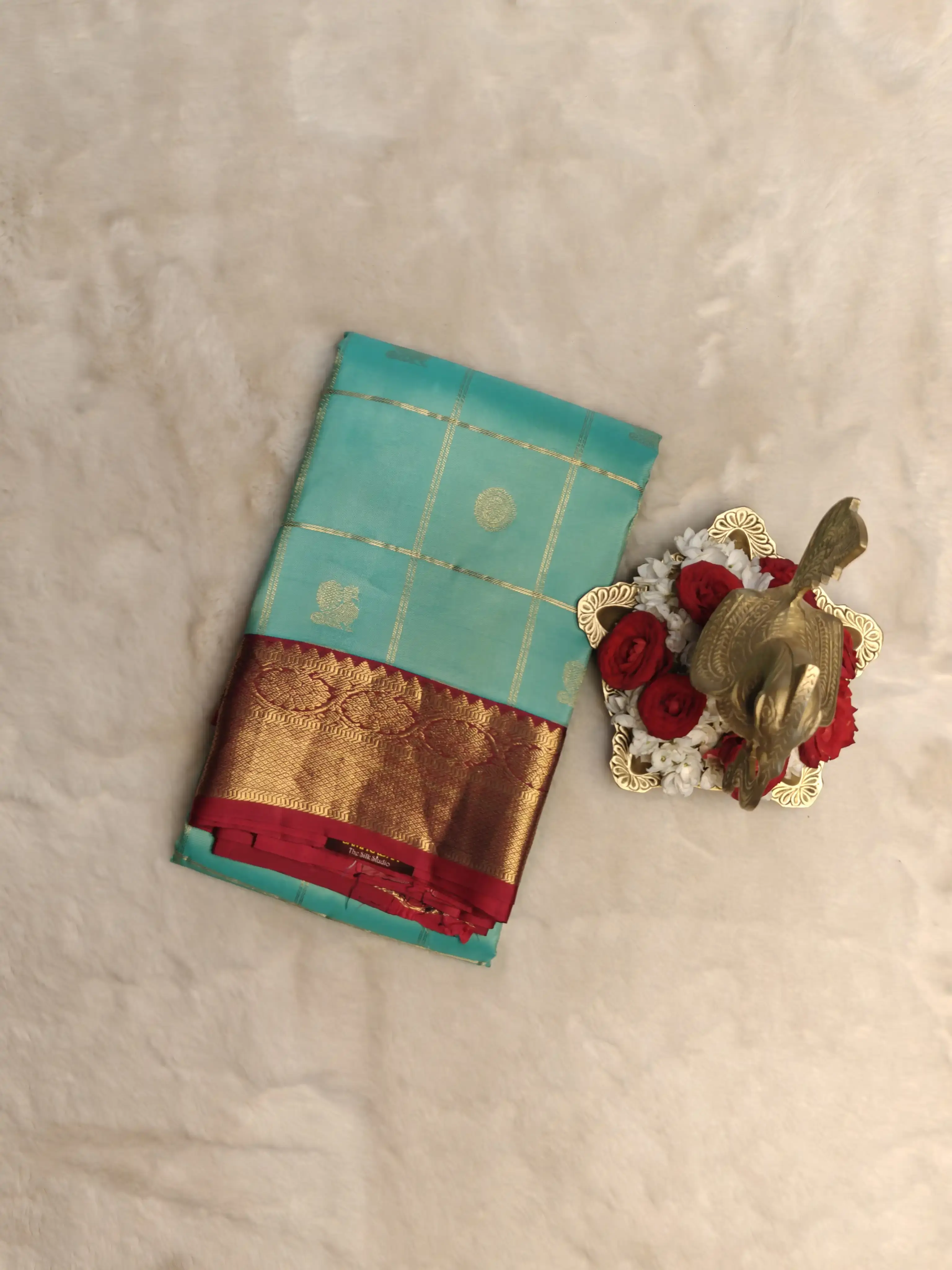 This graceful sea green silk saree features classic checks across the body, beautifully contrasted with a deep maroon border that adds richness and depth. The look is elevated by a luxurious maroon pallu, lending festive grandeur and timeless appeal. Perfect for weddings, celebrations, and traditional gatherings, this saree is a stunning expression of heritage woven in refreshing hues 💚❤️