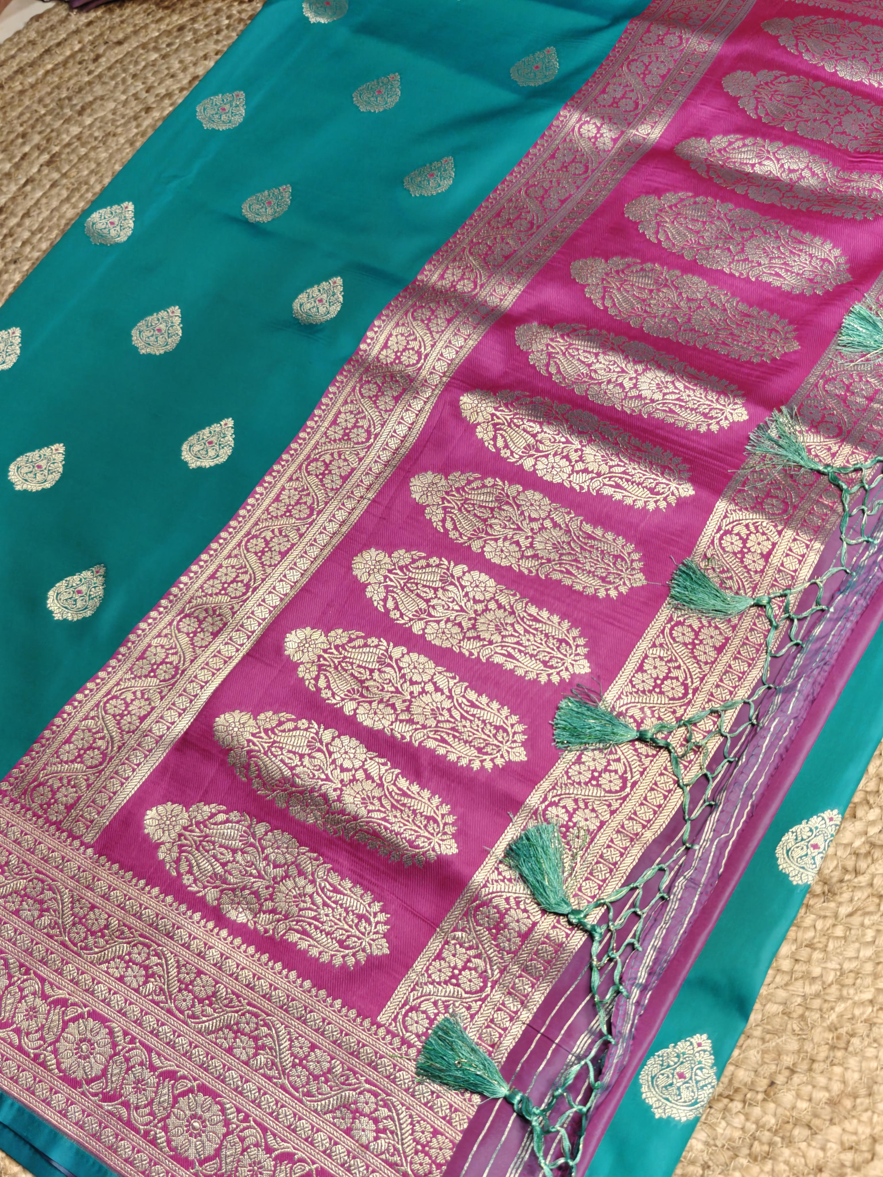 This stunning sea green Banarasi silk saree is beautifully enhanced with a rich Rani pink border, creating a striking yet elegant contrast. The look is elevated by a grand, richly woven pallu that reflects the timeless artistry of Banaras. Perfect for weddings, festive occasions, and heirloom celebrations, this saree is a true expression of regal charm and classic sophistication 💚💖