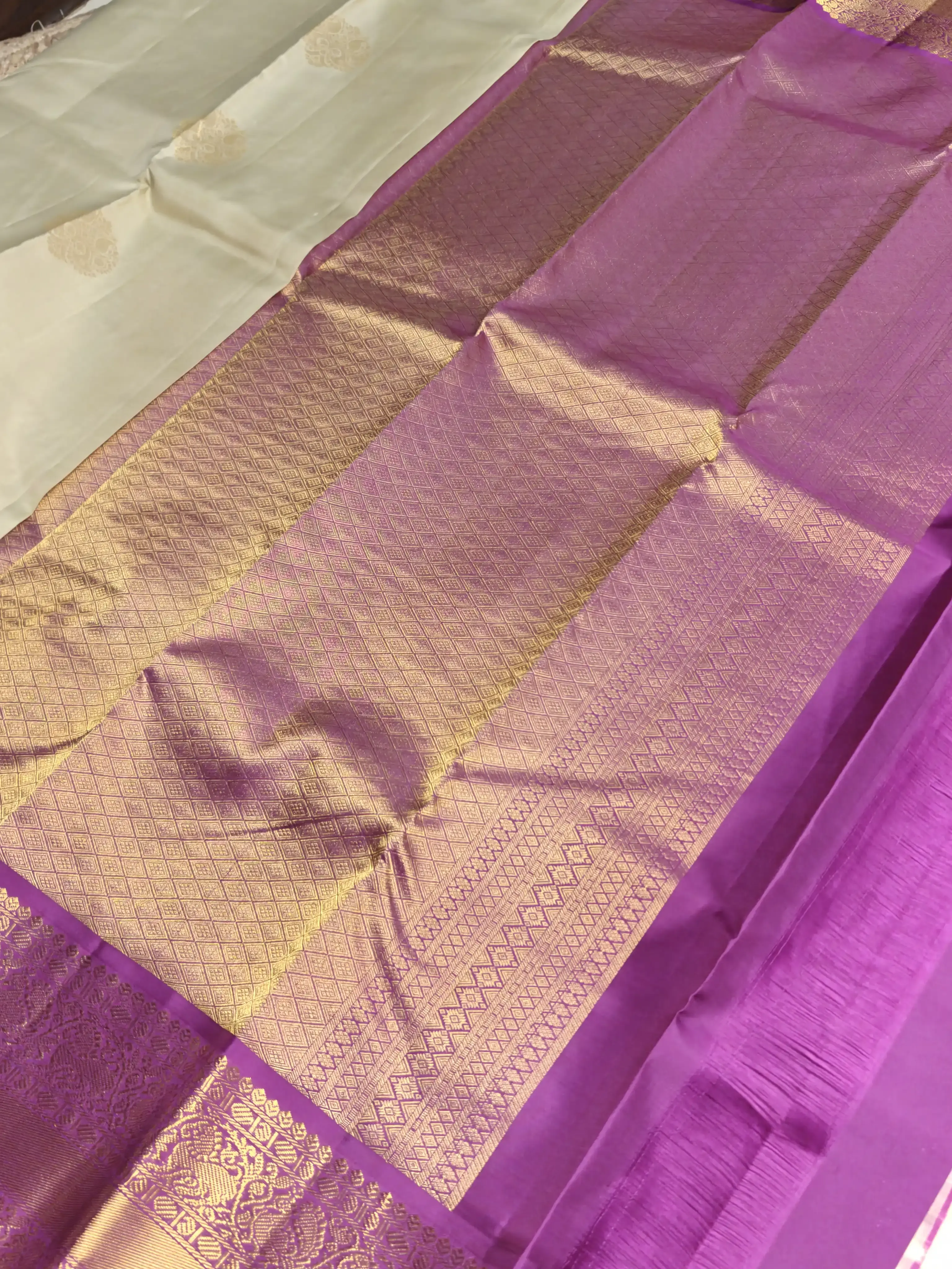A graceful soft cream silk saree adorned with a long, rich pink border, highlighted by bold traditional motifs that add timeless charm. The elegant contrast brings out a classic South Indian aesthetic, making it perfect for weddings, temple visits, and festive occasions. A saree that blends subtle sophistication with heritage richness, crafted for the woman who loves enduring elegance. 💖🌸