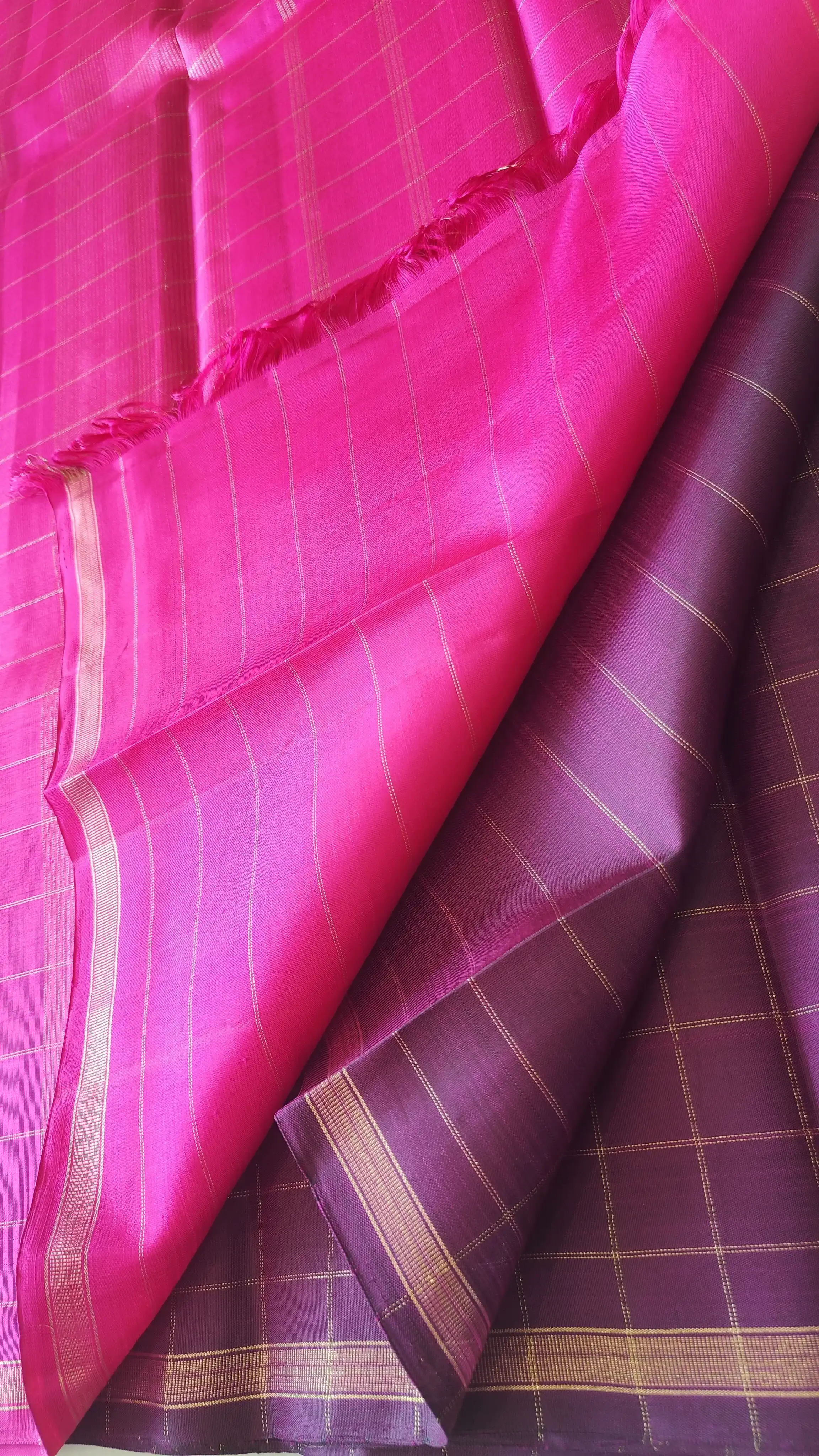 Wine checks saree with pink pallu Pure kanchipuram silk saree