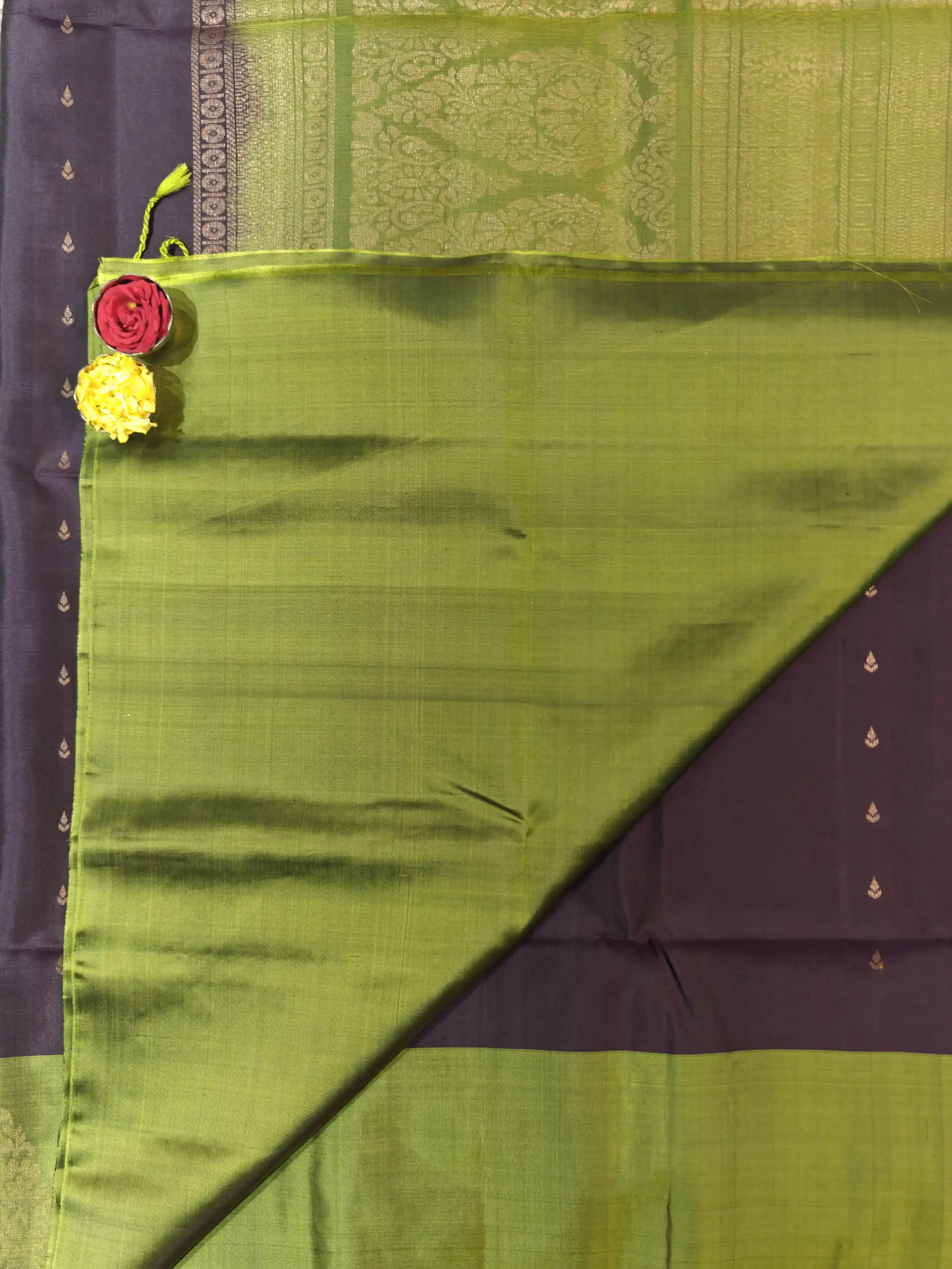 This wine-coloured soft silk saree is beautifully highlighted by a contrasting green border, adorned with bold, intricate motifs that add grandeur and traditional charm. Elegant and refined, this saree is perfect for weddings, festive occasions, and celebrations that call for enduring sophistication ๐ท๐
