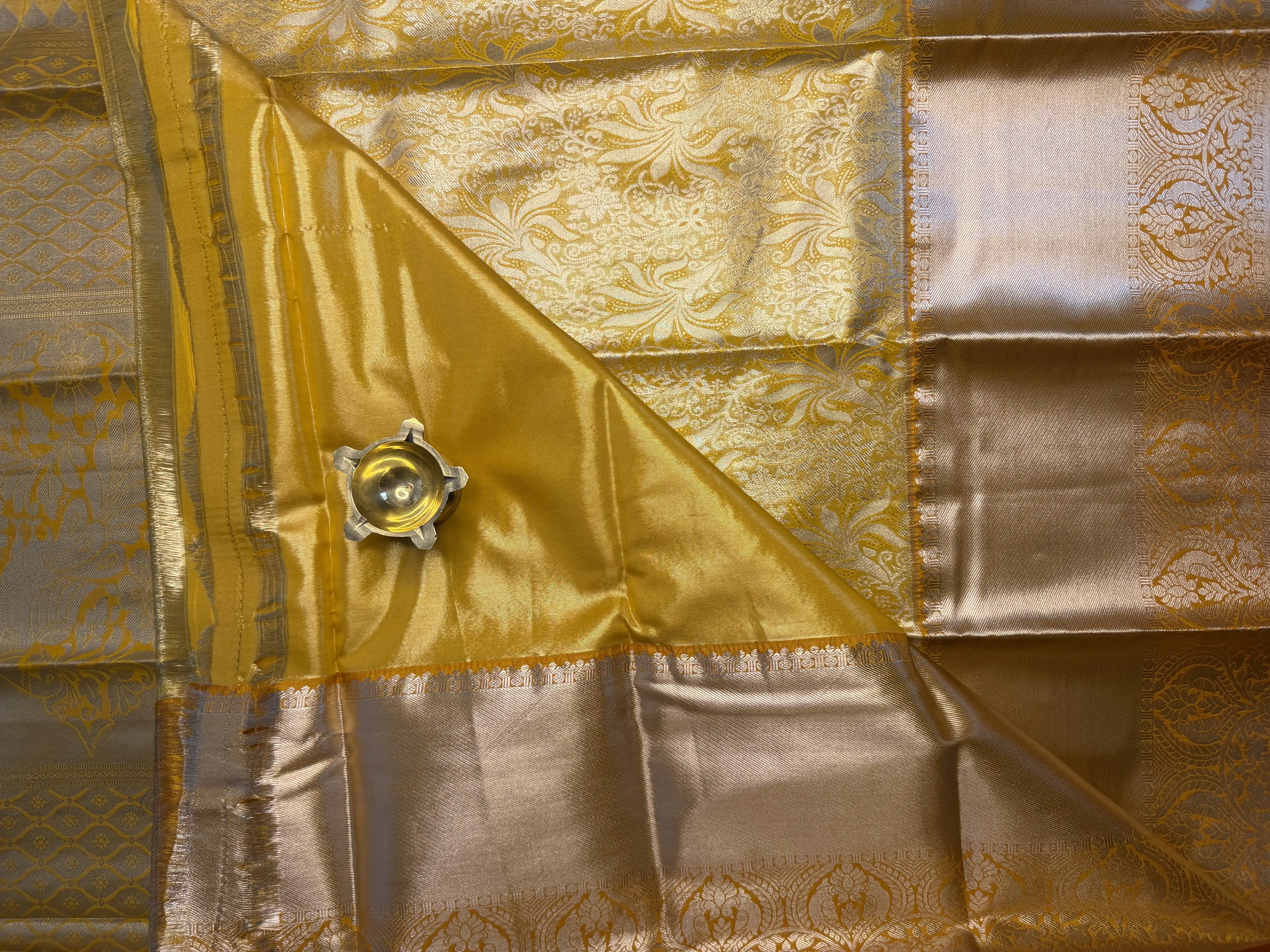 This yellow & gold tissue semi-silk saree is highlighted by a bold, richly woven border, adding grandeur and celebratory charm. The luminous tissue texture paired with the soft drape of semi-silk creates an elegant sheen, while the vibrant yellow base beautifully complements the golden accents.