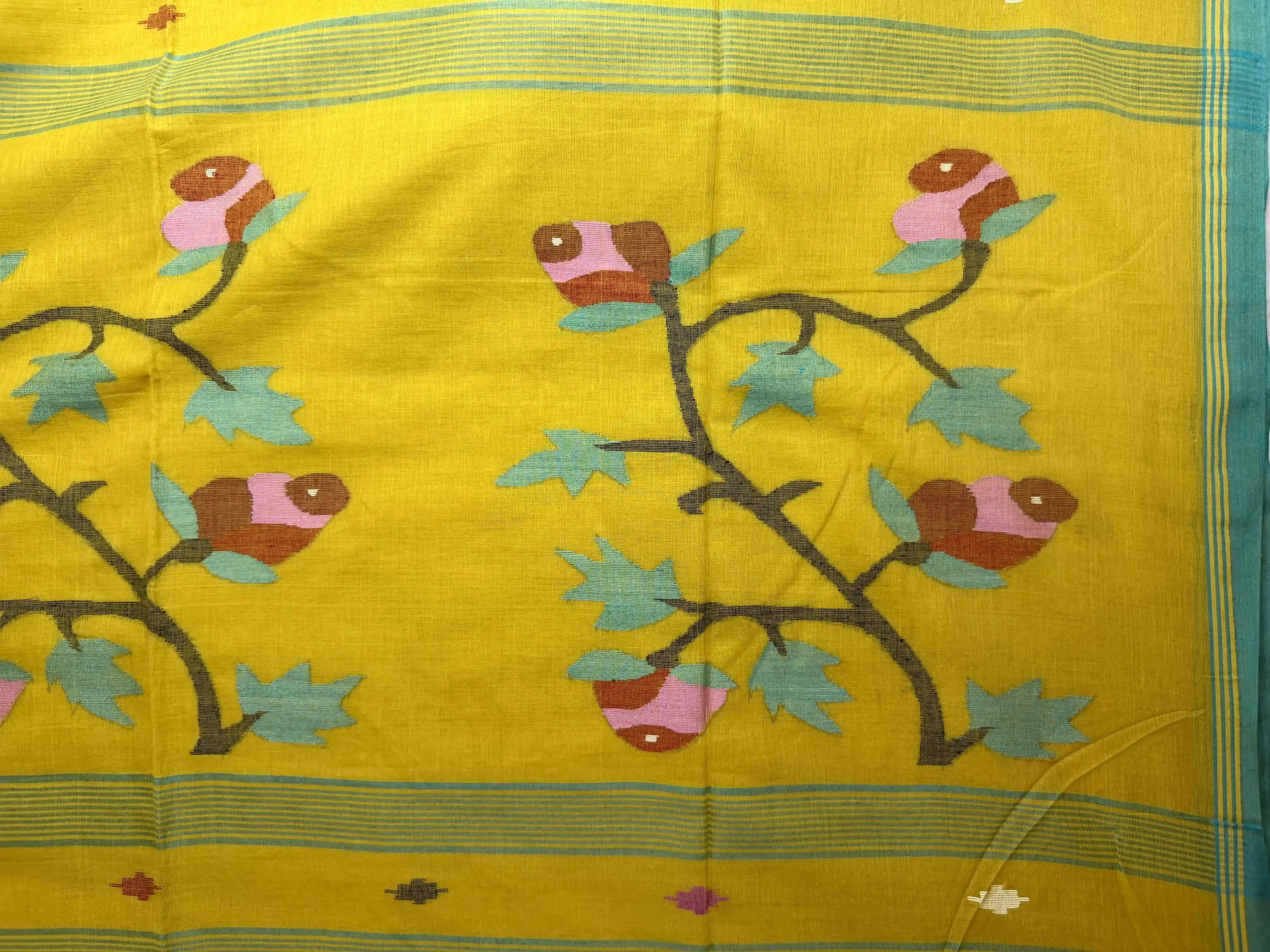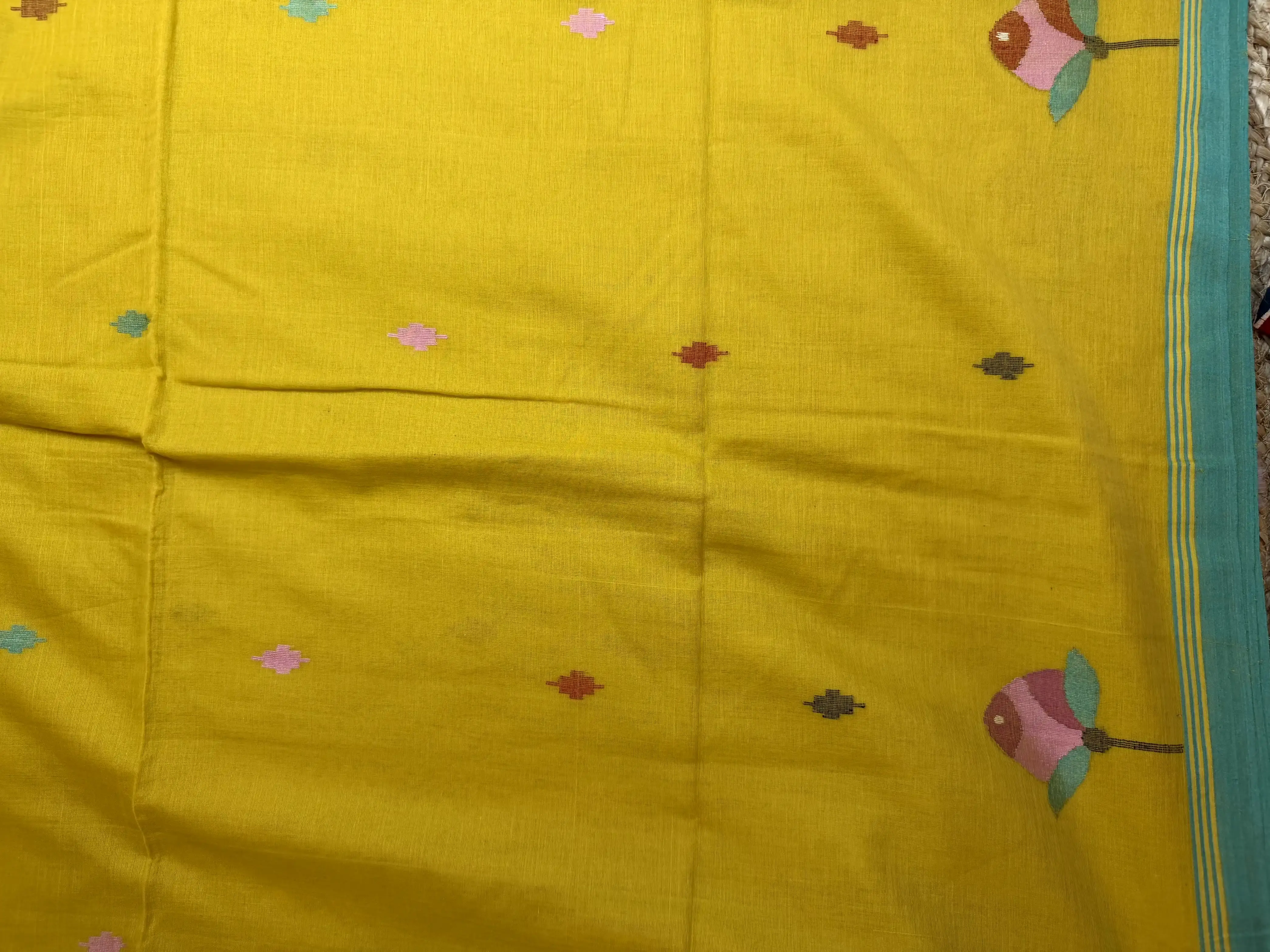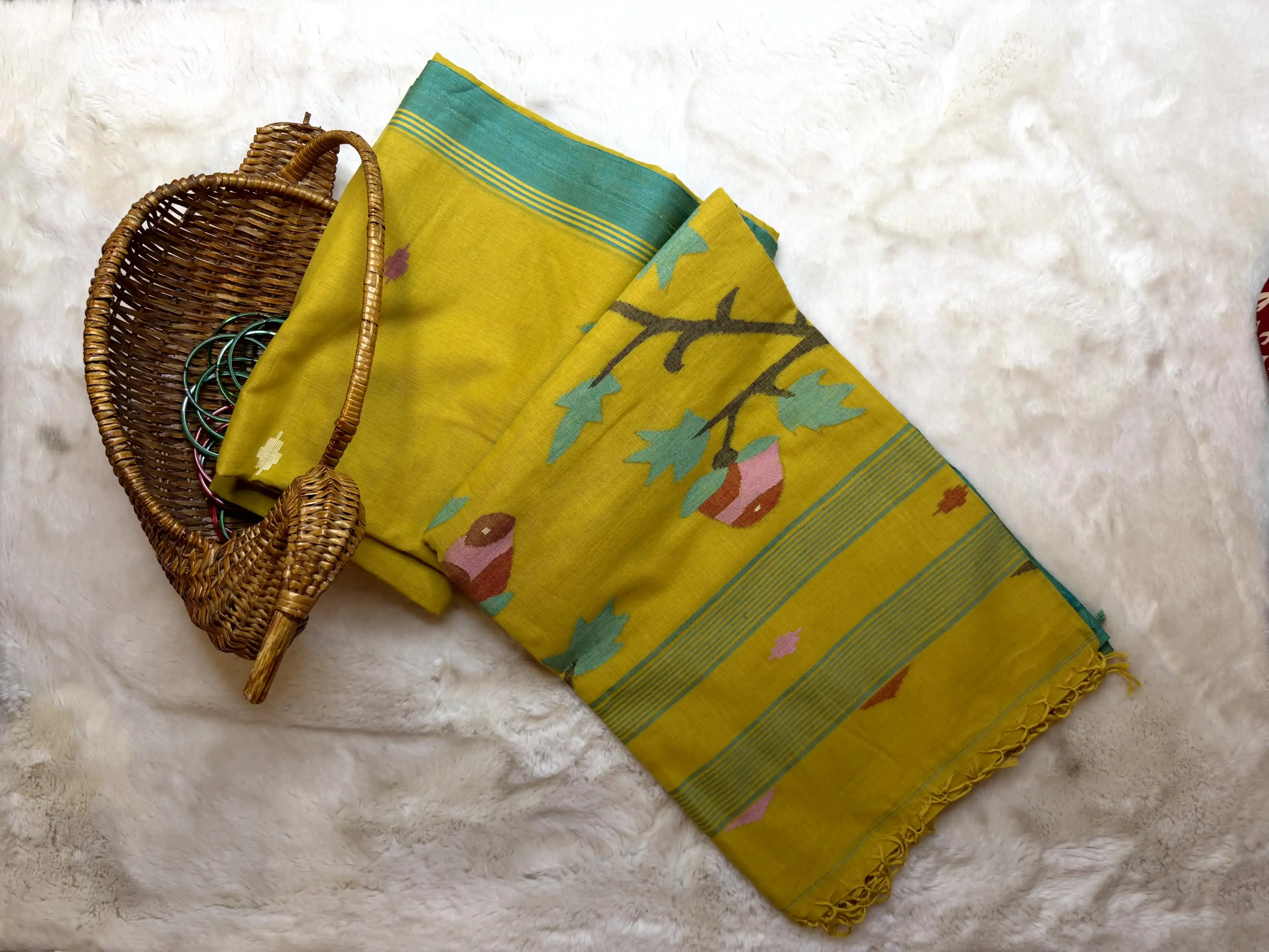 This yellow cotton saree is adorned with exquisite Jamdhani work, showcasing time-honored weaving techniques and artistic motifs. Lightweight yet visually striking, it’s perfect for festive mornings, cultural gatherings, and handloom enthusiasts who appreciate heritage craft with elegant flair 💛🧵