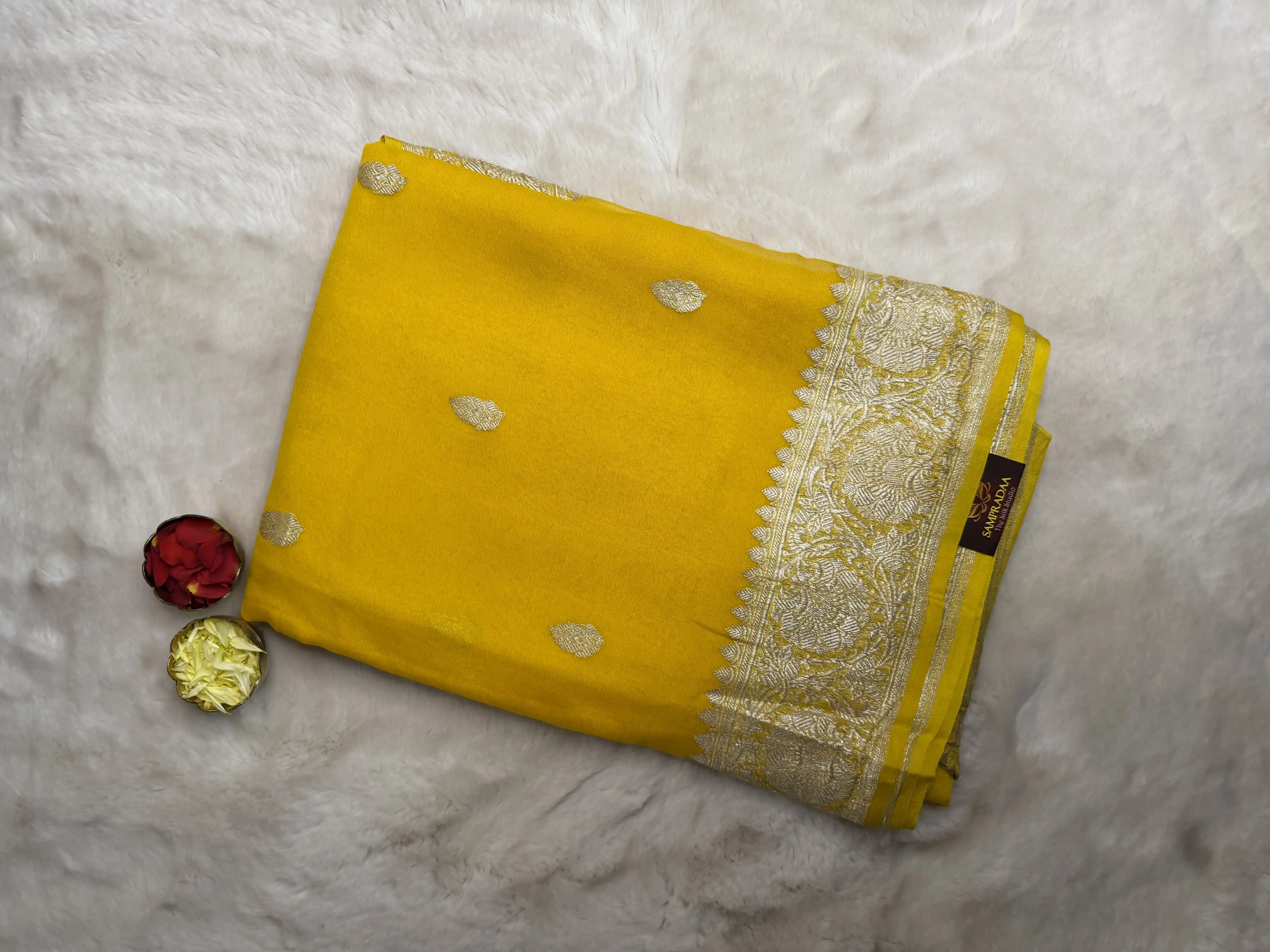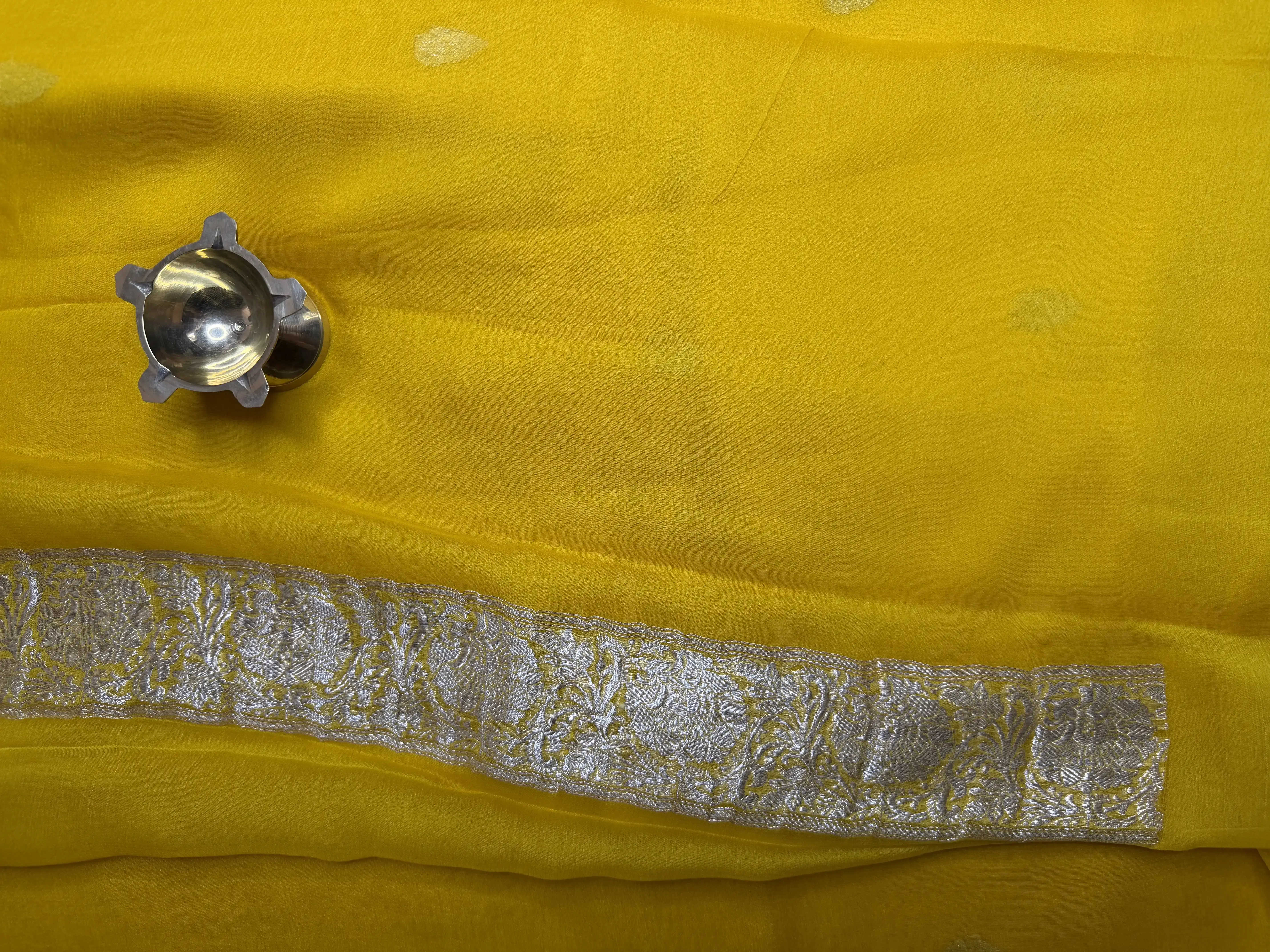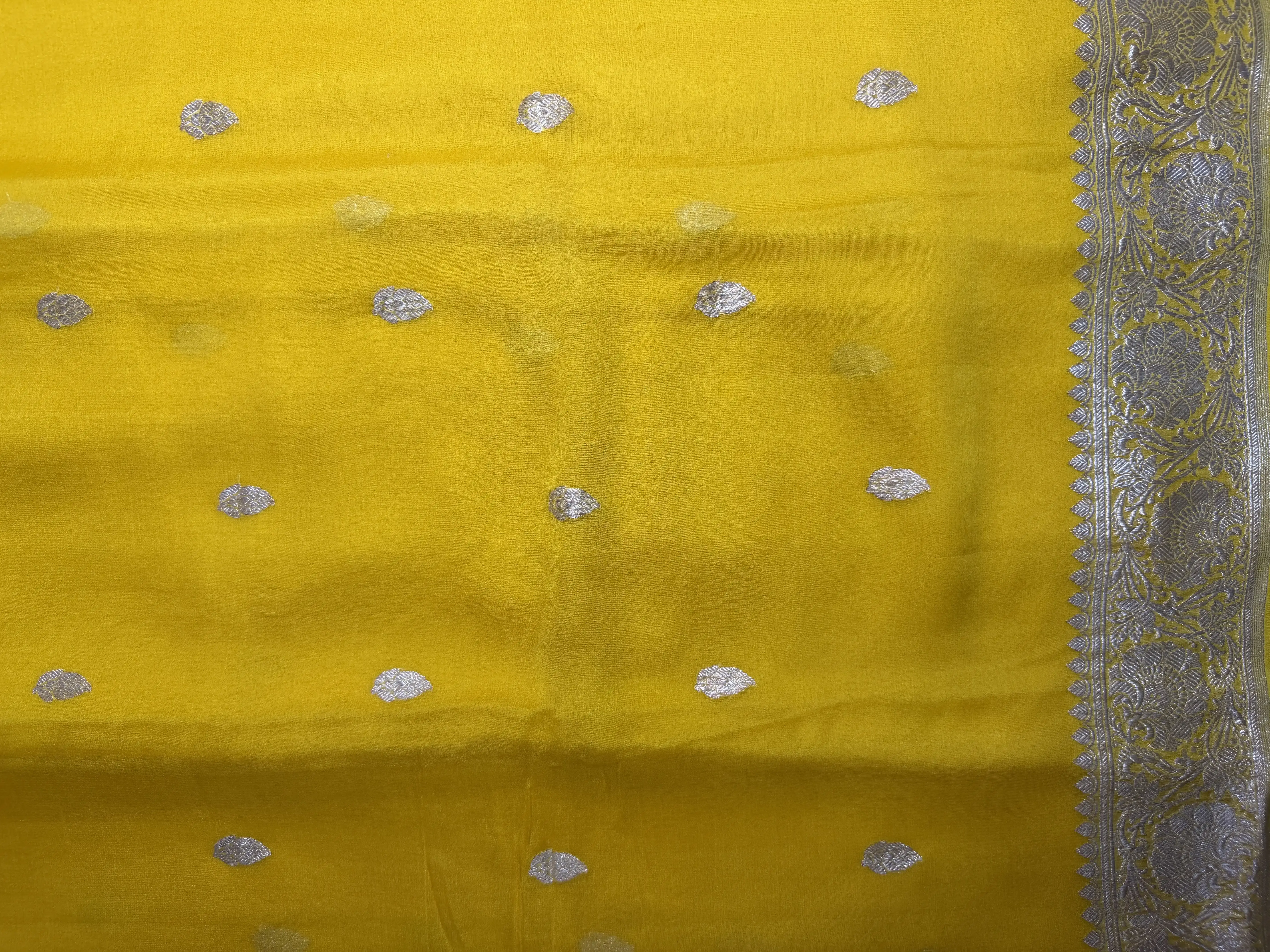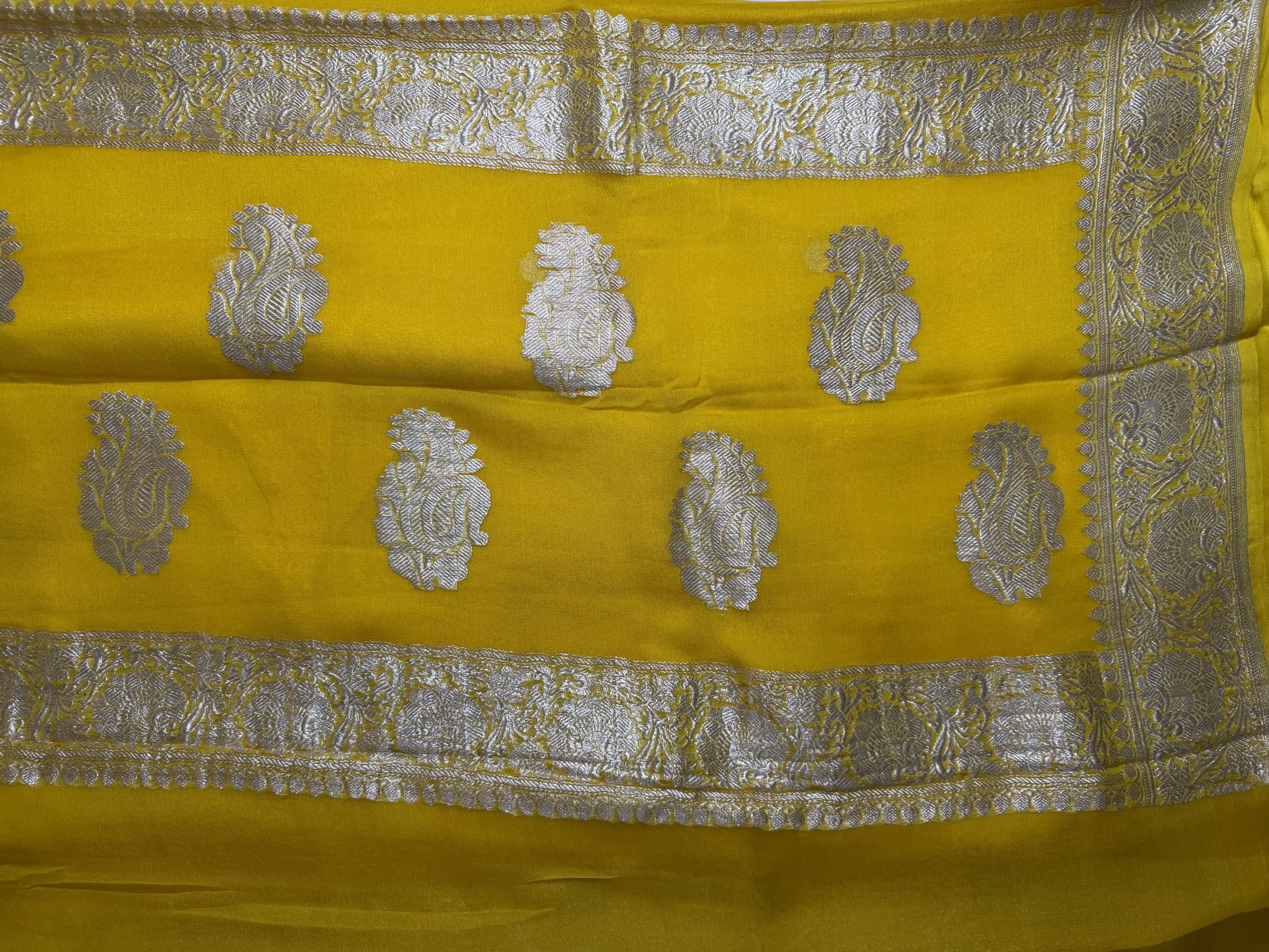 This pure Khaddi Chiffon saree in a vibrant yellow shade is beautifully adorned with delicate silver buttas, adding a graceful sparkle to the airy weave. Known for its lightweight texture and fluid drape, Khaddi georgette brings effortless sophistication and comfort.