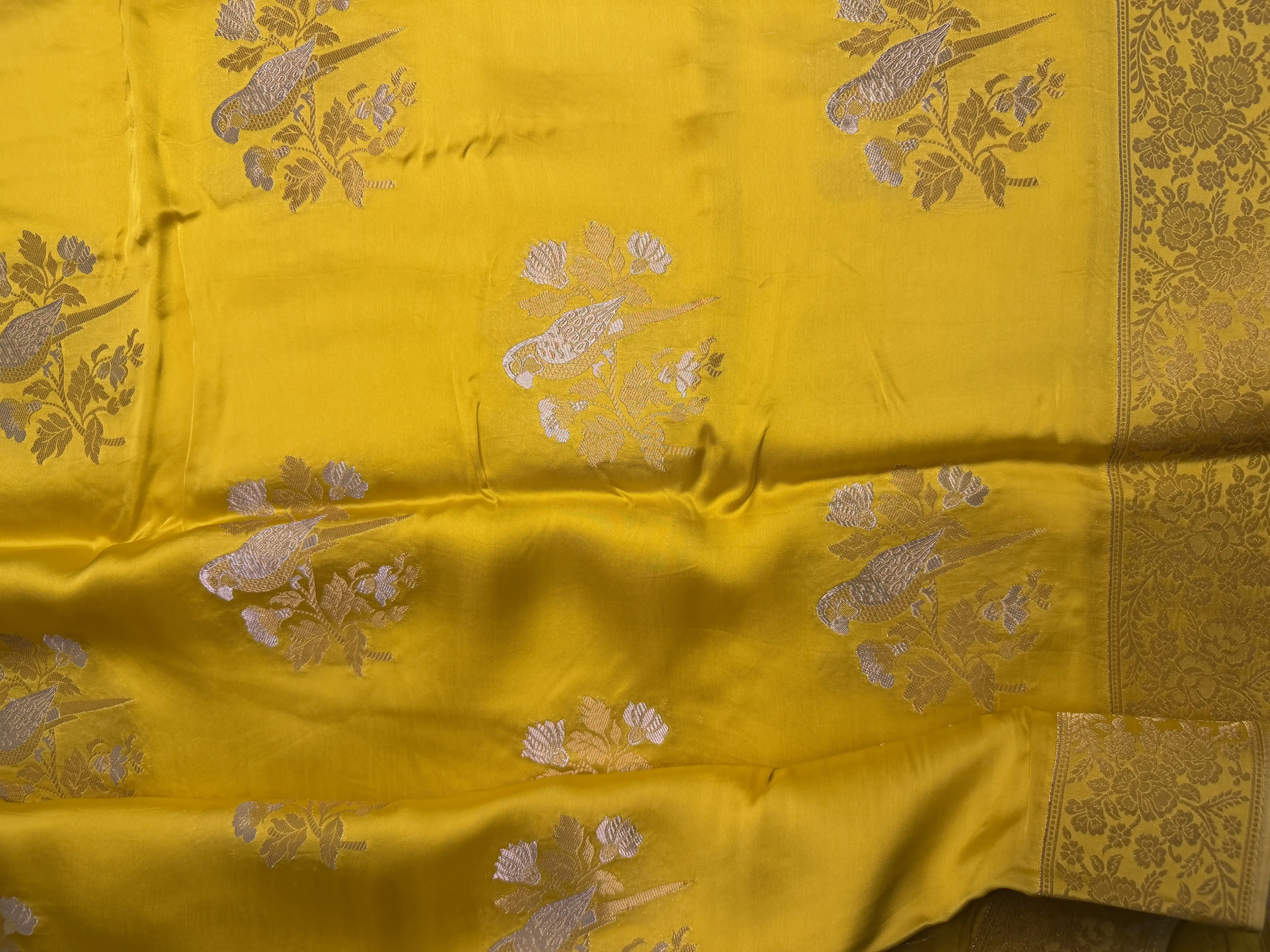 This yellow mashru silk saree, adorned with graceful bird motifs, radiates vibrant charm and timeless elegance—perfect for festive celebrations and elegant occasions. 💛🐦